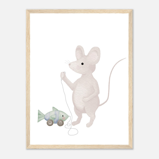 gerahmtes Poster "Kleine Maus mit Nachziehfisch" mit Holzrahmen