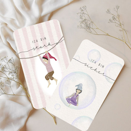 Affirmationskarten set für Kinder | 40 Affirmationen handillustriert im Zwergendesign | Geschenk für Selbstvertrauen & Gefühle