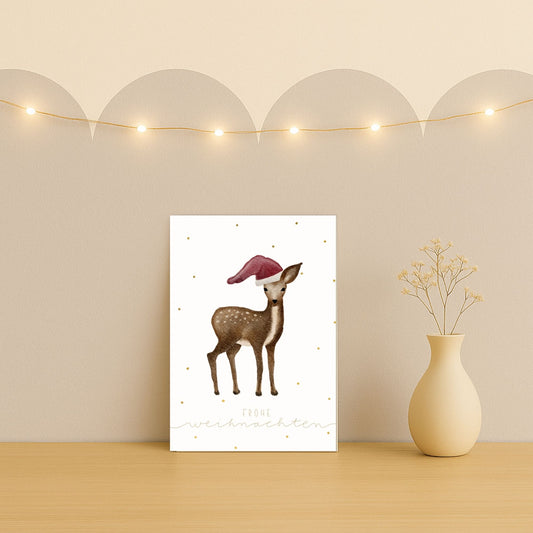 Weihnachtskarten Set 10 Stück – Kleines Reh mit Weihnachtsmütze | handillustrierte Grußkarten A5/A6 | Motiv „Frohe Weihnachten“