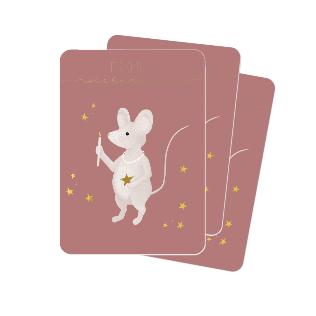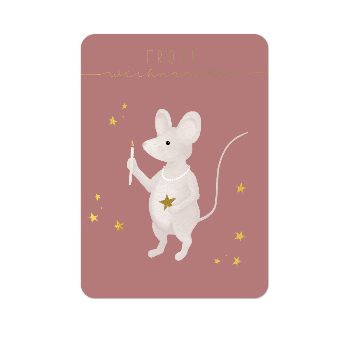 - Design: Handillustrierte Weihnachtsmaus mit Kerze, Perlenkette und Stern, mit der goldenen Aufschrift "frohe Weihnachten"