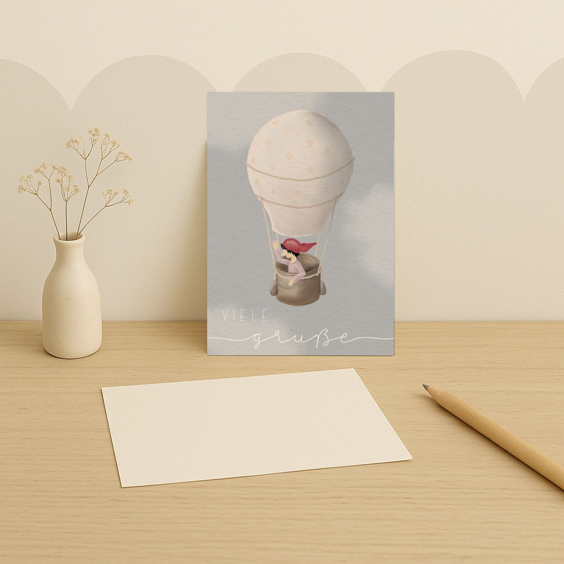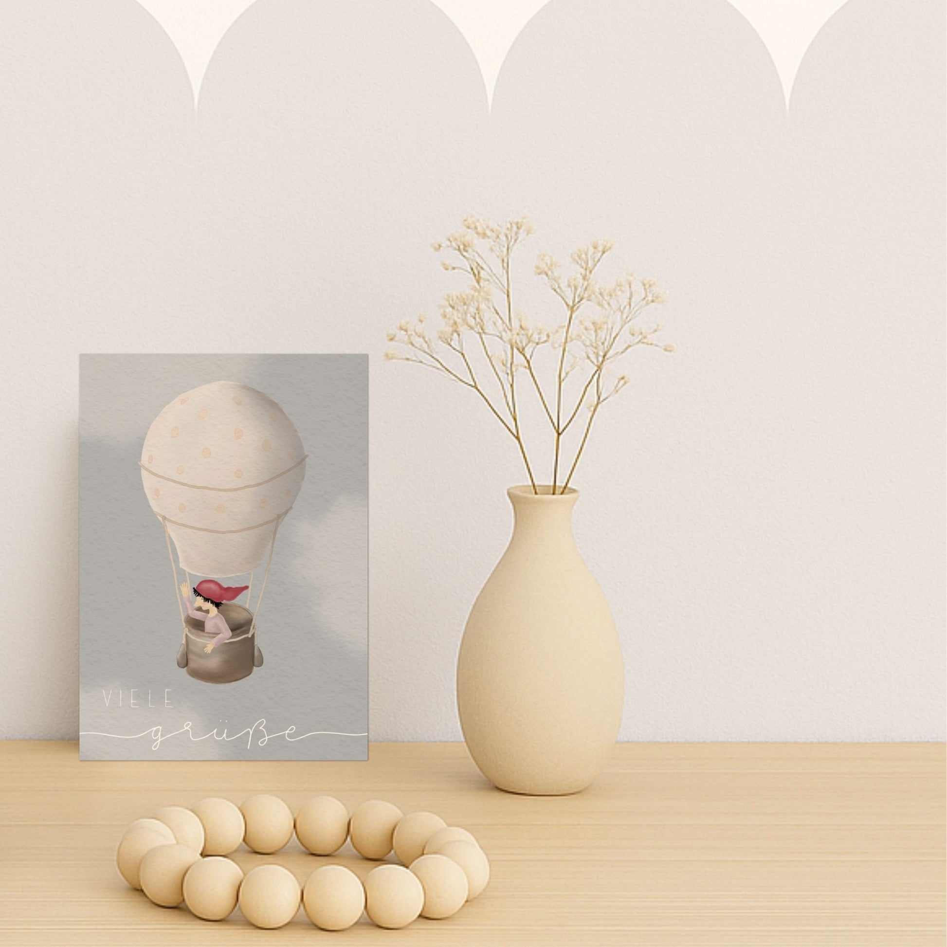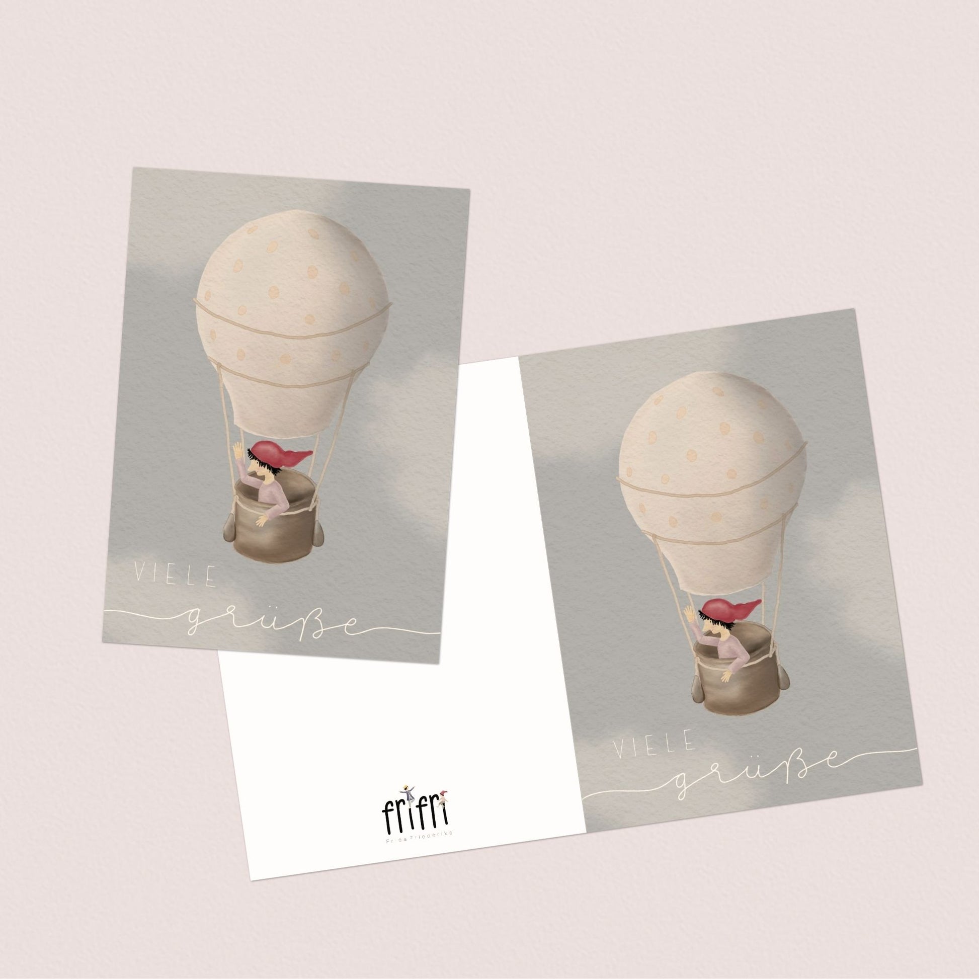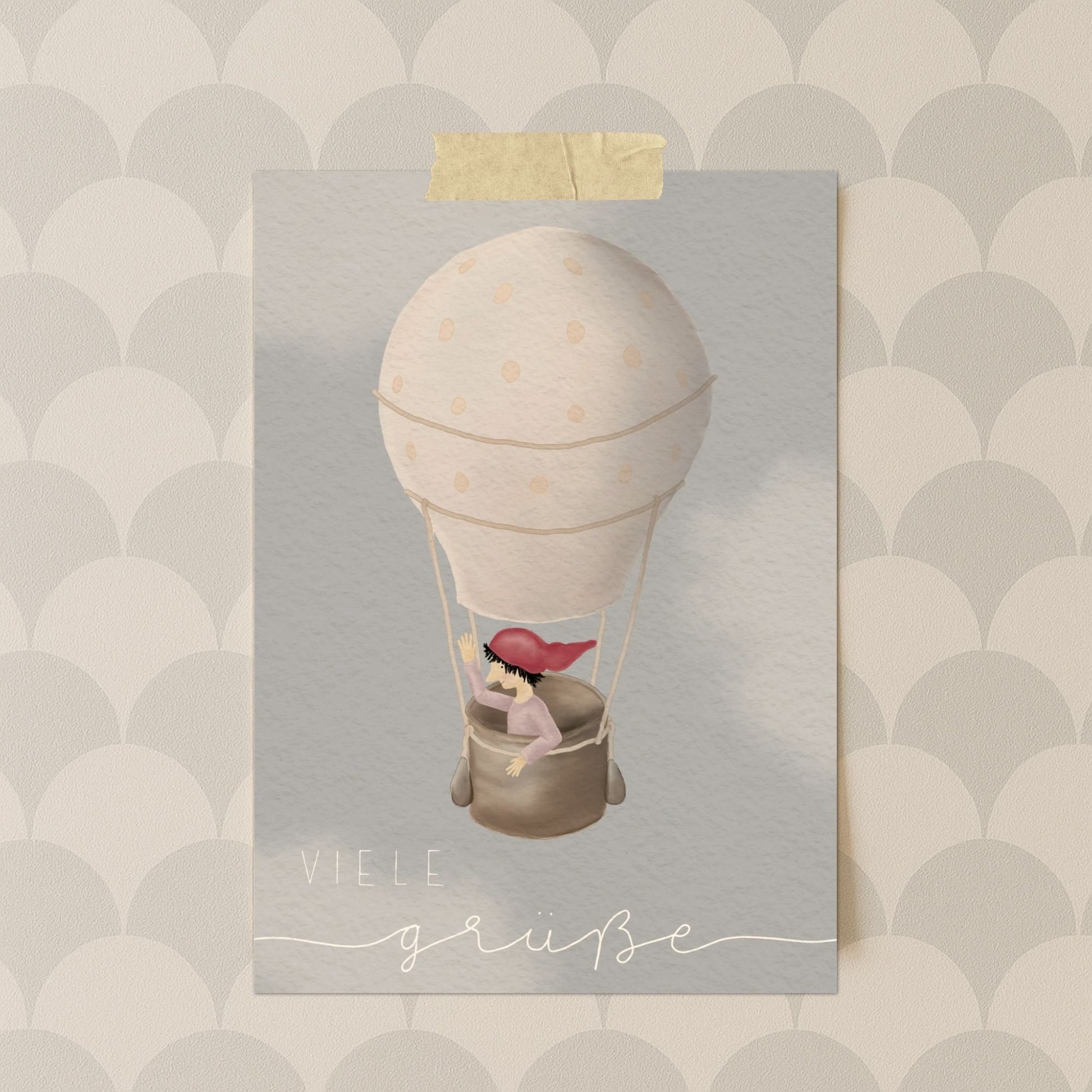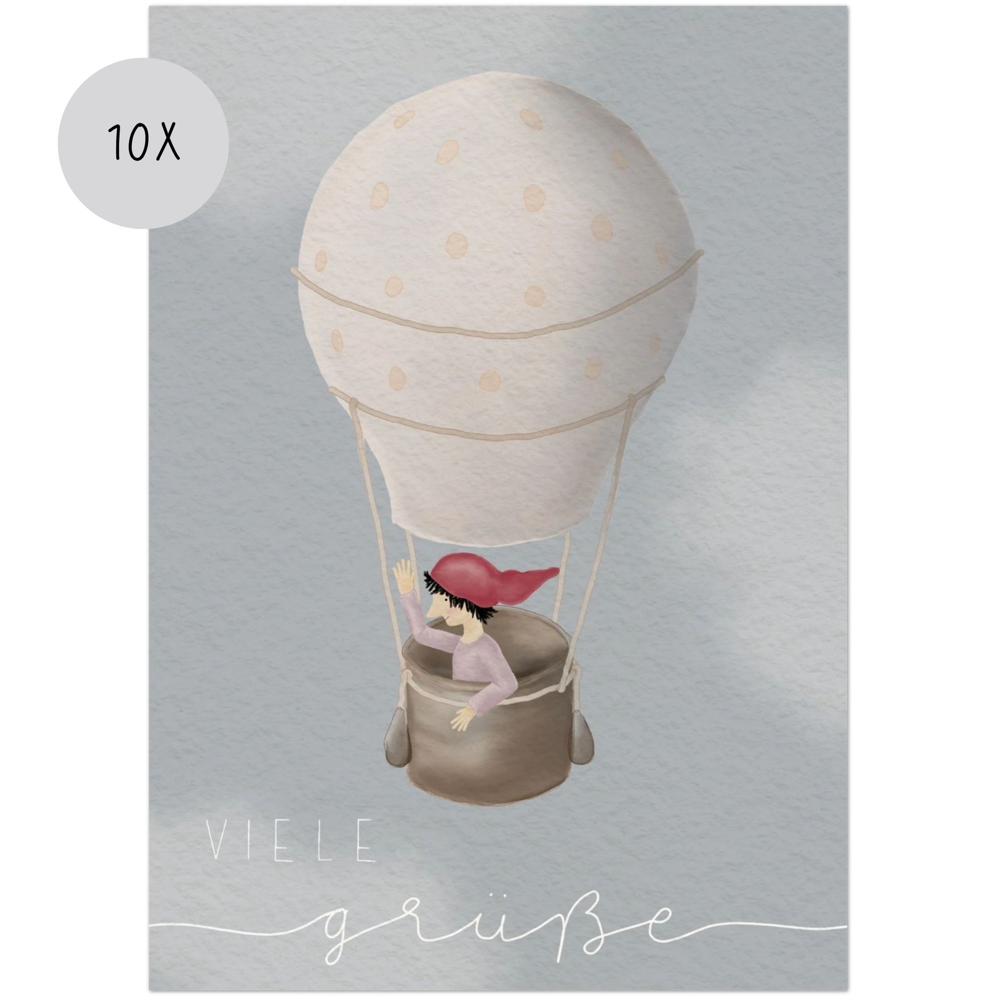 Grußkarten Set 10 Stück – "Zwerg auf Ballonfahrt" | liebevoll illustrierte Postkarten A5/A6 | Motiv „Viele Grüße“