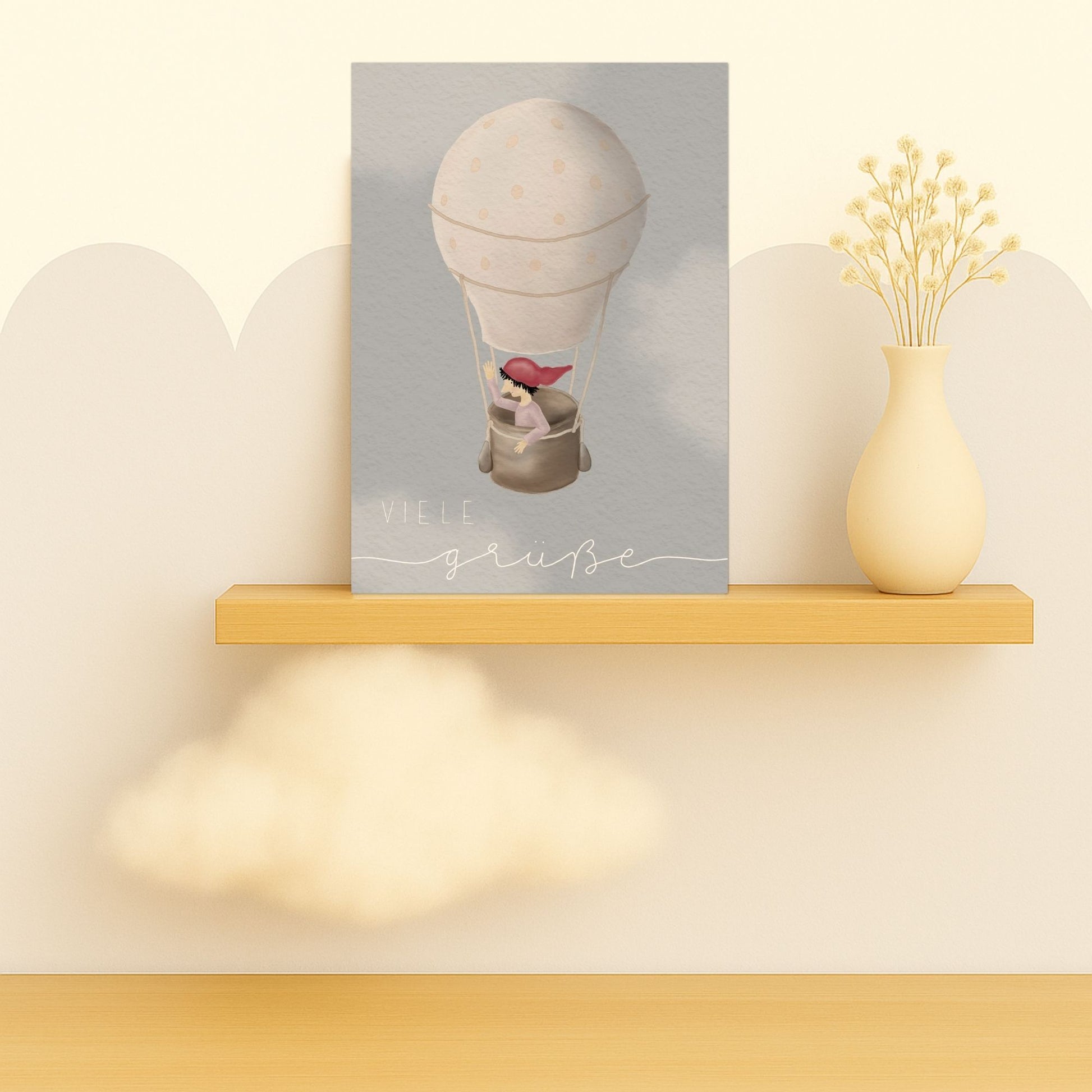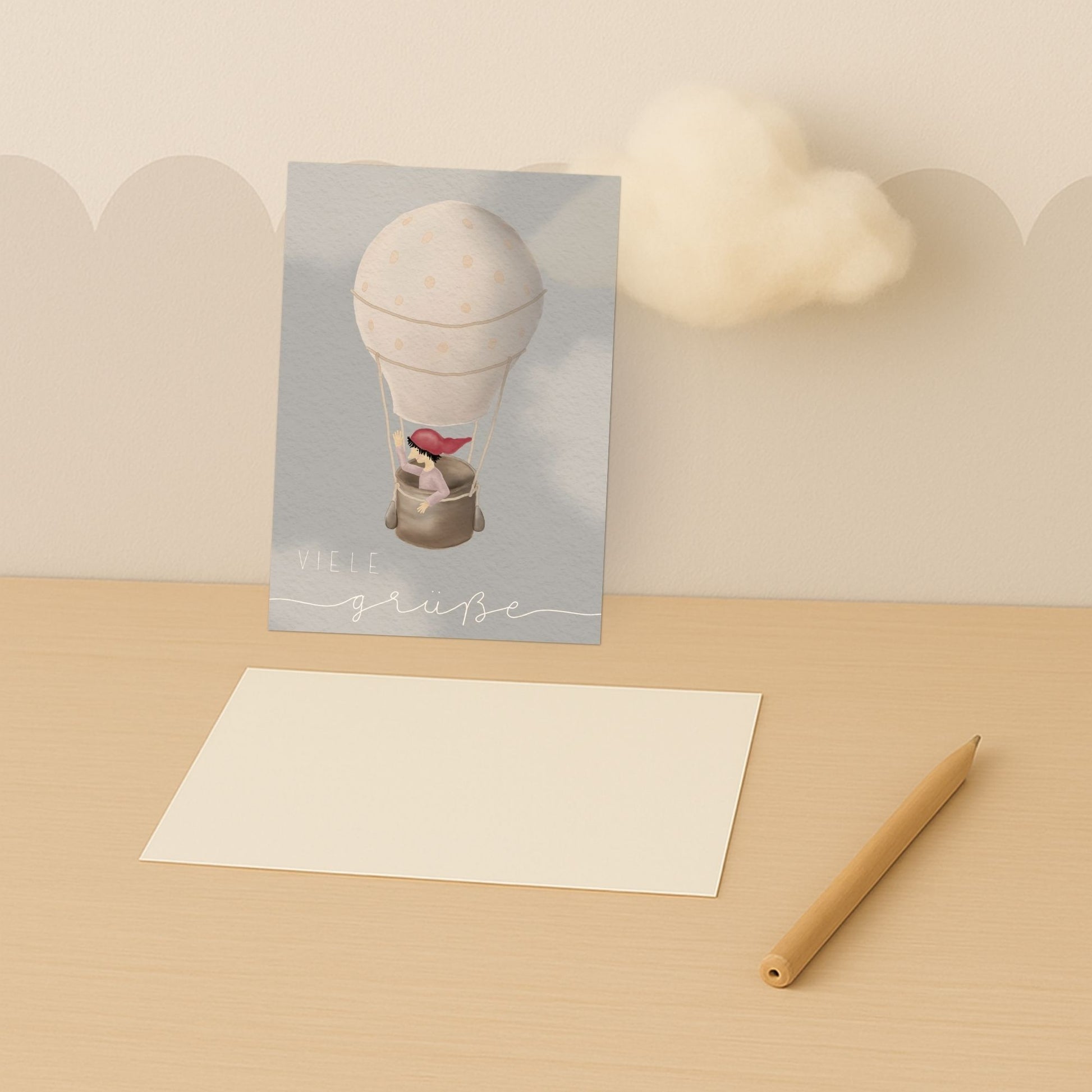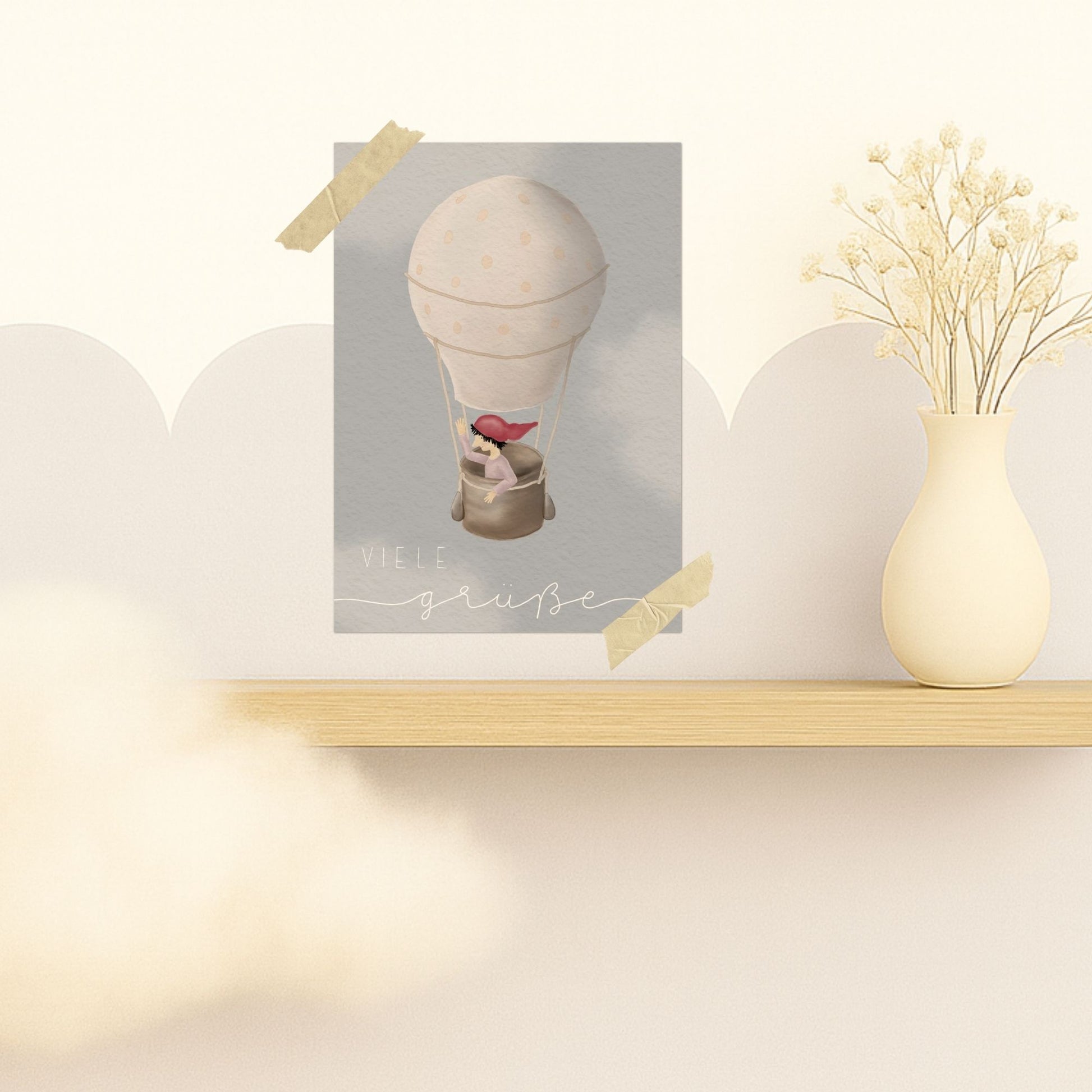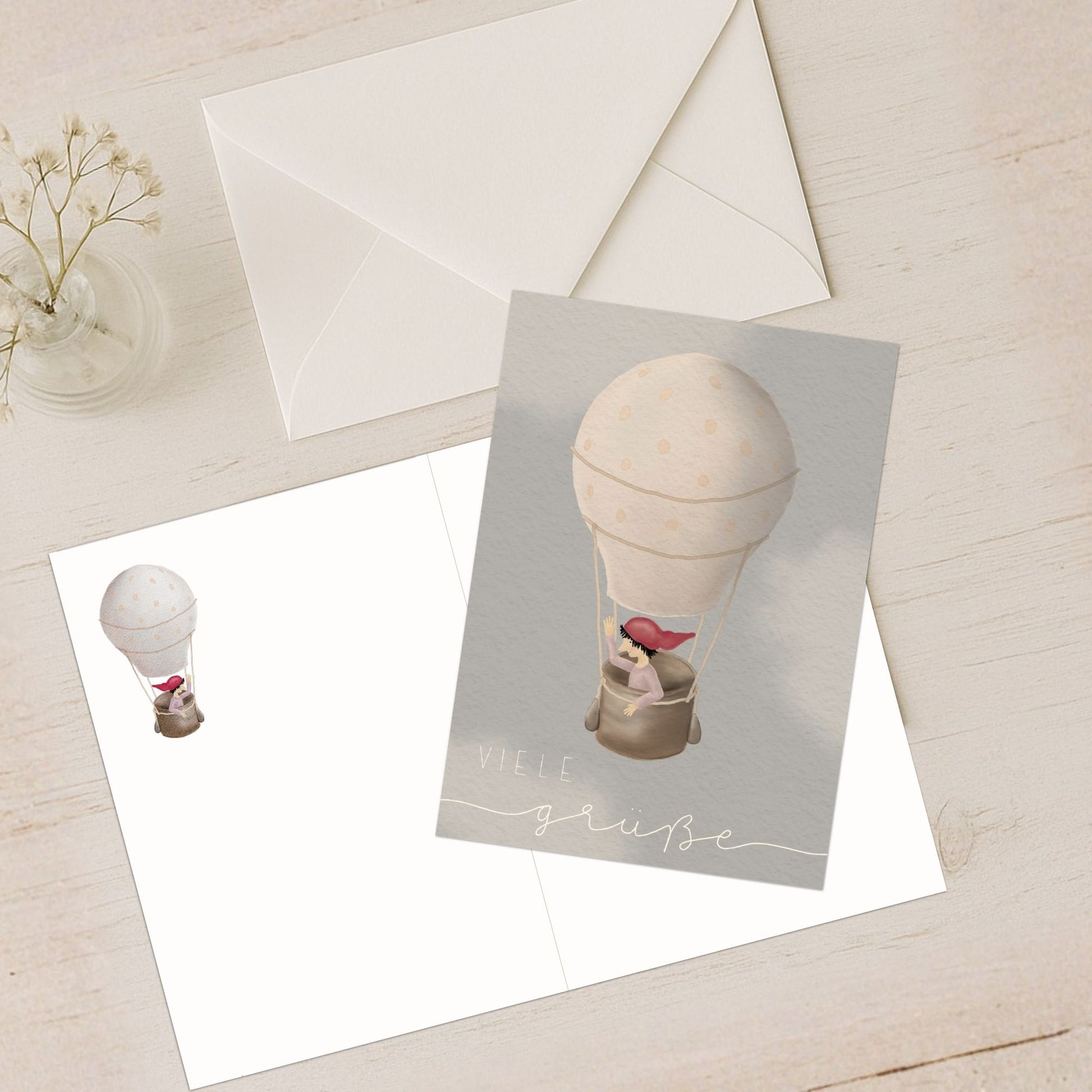 Diese Grußkarten sind zum Aufklappen gestaltet – so bleibt im Inneren viel Platz für deine persönlichen Worte, liebe Wünsche oder kleine Botschaften voller Magie. Und als zauberhaftes Detail: Auch auf der Innenseite begegnet dir der kleine Heißluftballon erneut. Wie eine sanfte Erinnerung an die Leichtigkeit des Himmels schwebt er über dem Papier und macht aus jedem geschriebenen Gruß etwas ganz Besonderes.