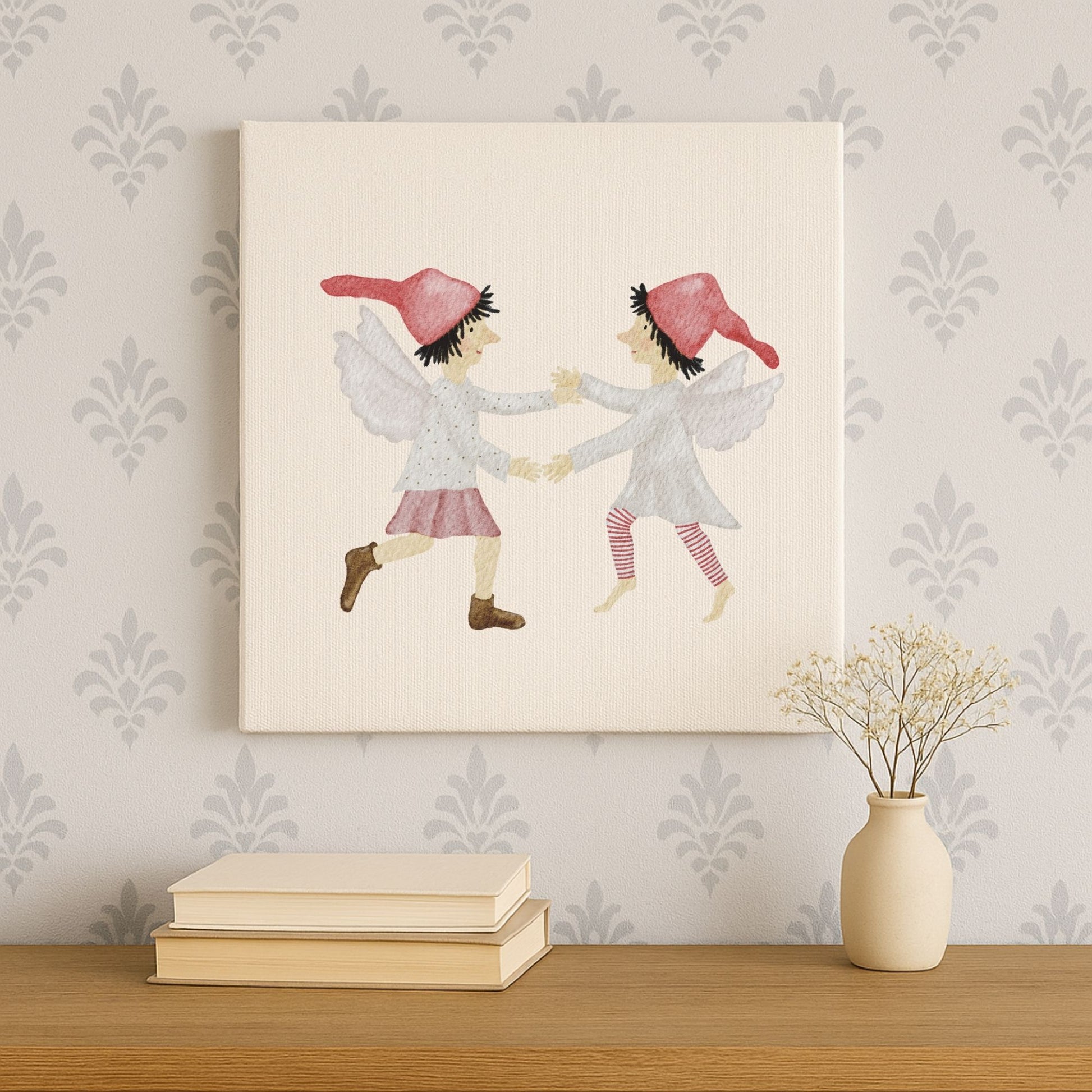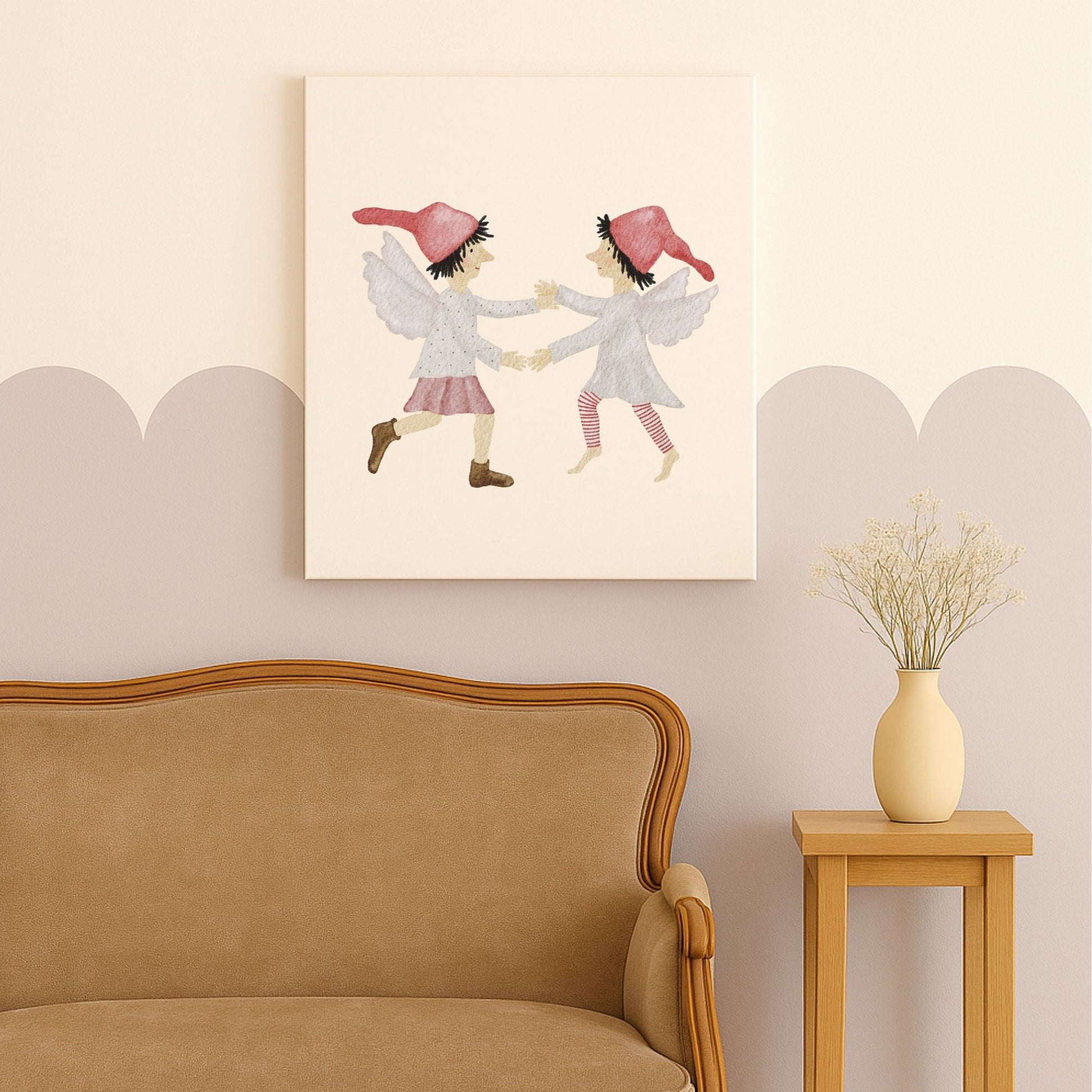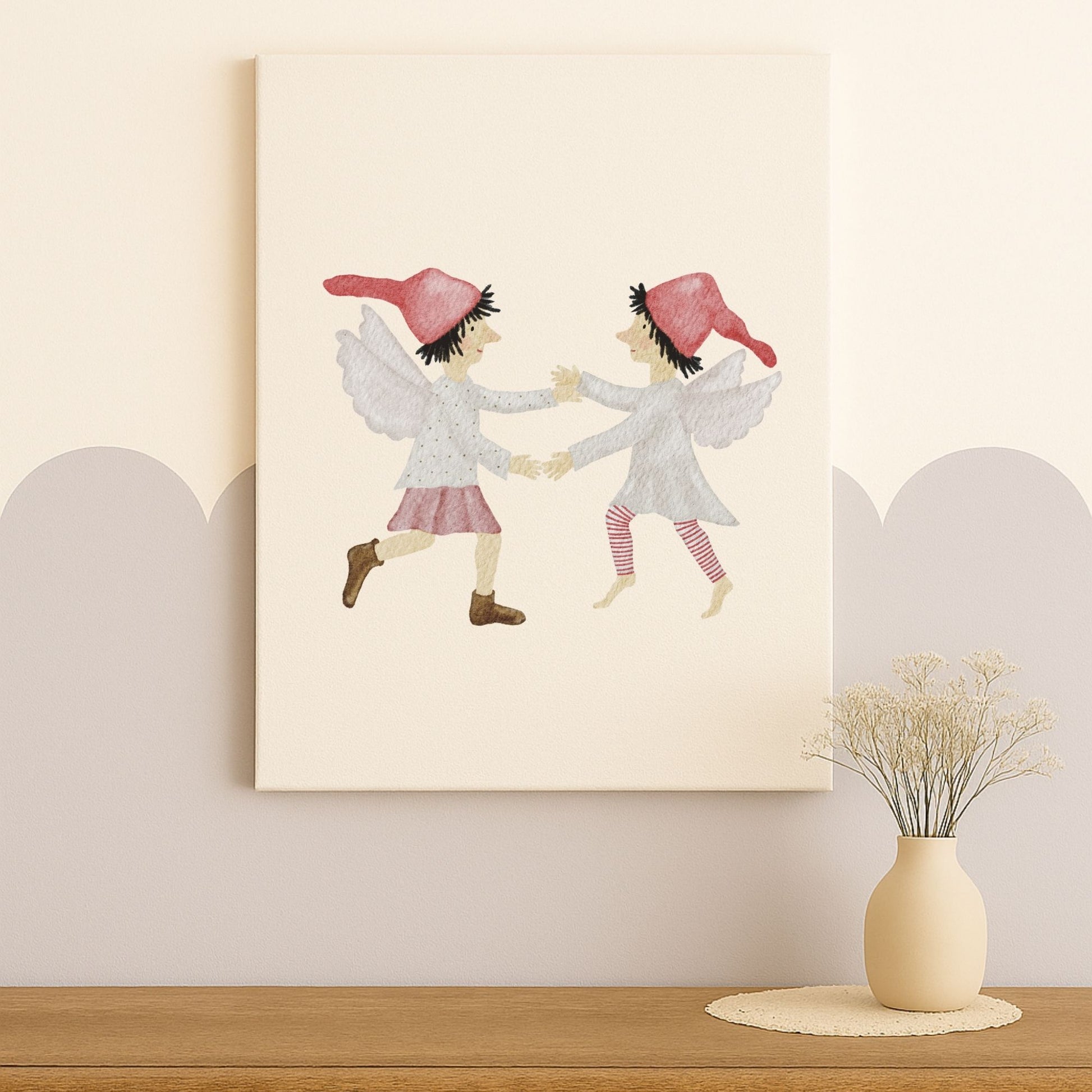 ☁️ Zwei kleine Wichtel mit zarten Flügeln tanzen einen Reigen auf weichen Wolken – ein verträumtes Kinderzimmer-Poster, das Leichtigkeit, Freude und ein bisschen Himmelszauber in dein Zuhause bringt. Dieses Wandbild passt wunderbar in die Weihnachtszeit, ist aber zugleich sanft und zeitlos genug, um euch das ganze Jahr über als himmlischer Blickfang zu begleiten. ☁️