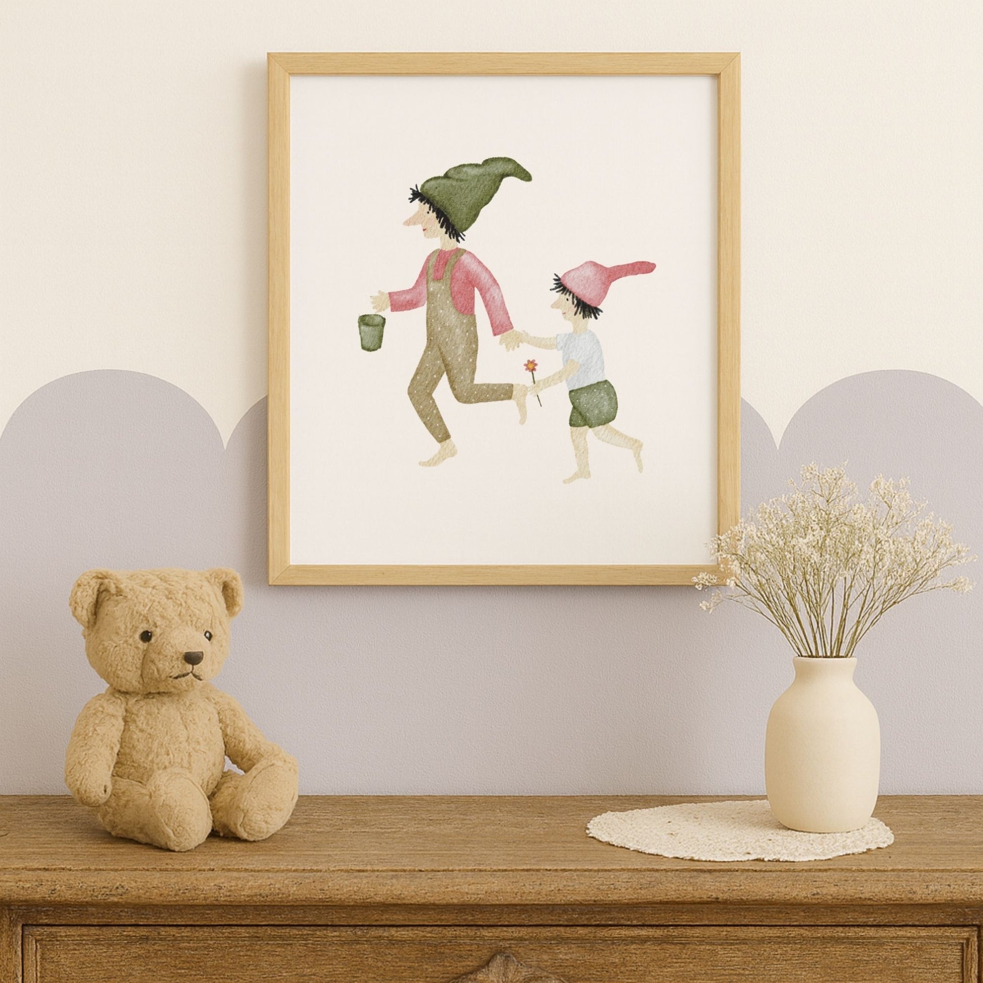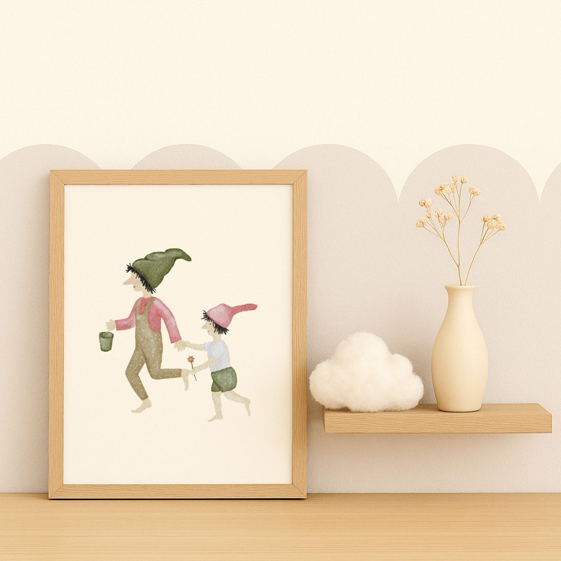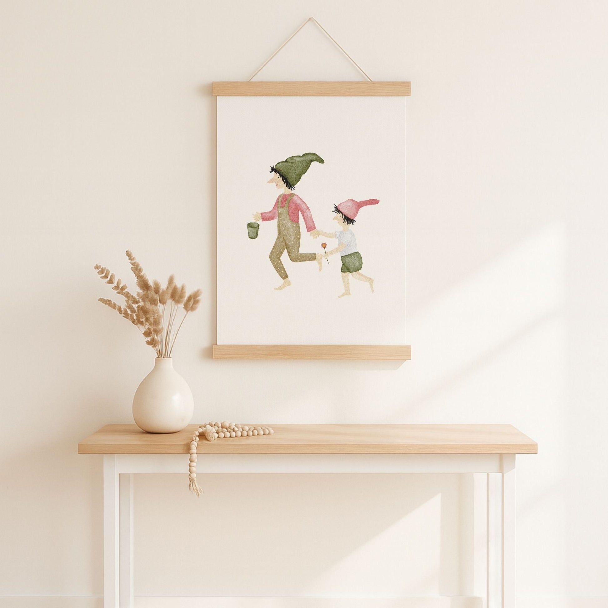 Zwei kleine Zwerge laufen Hand in Hand, der größere hält den kleineren liebevoll und der kleine trägt eine Blume – ein zartes Motiv voller Geborgenheit und „Geschwisterliebe“. Dieses liebevoll illustrierte Kinderzimmer-Poster bringt Nähe, Verbundenheit und warme Familienmomente an eure Wand und passt wunderbar ins Babyzimmer, Geschwisterzimmer oder an euren Lieblingsplatz als leiser Erinnerer daran, dass man gemeinsam nie allein ist.