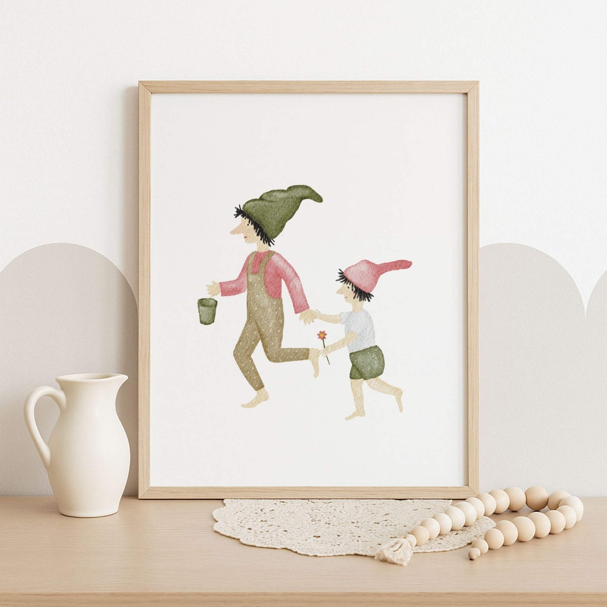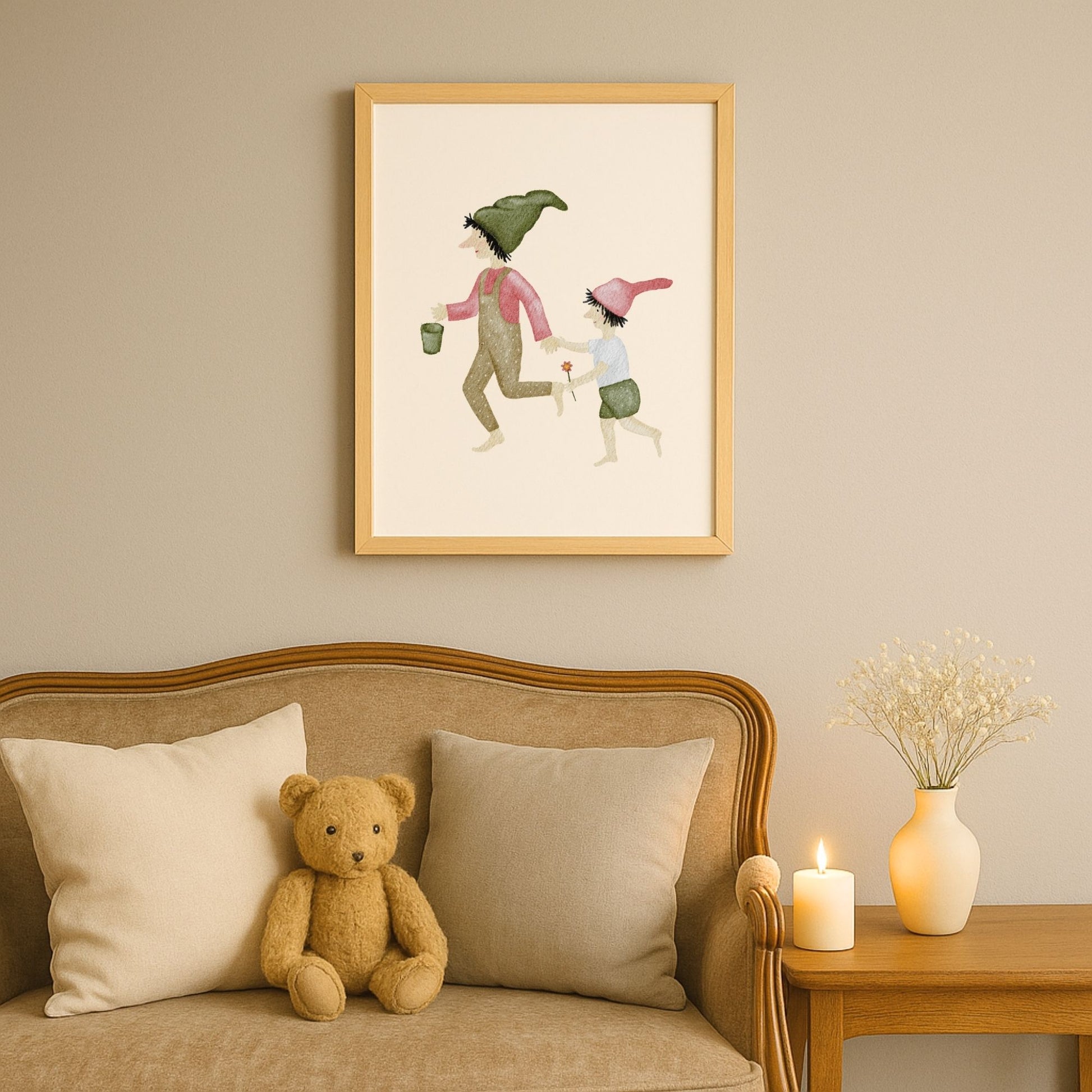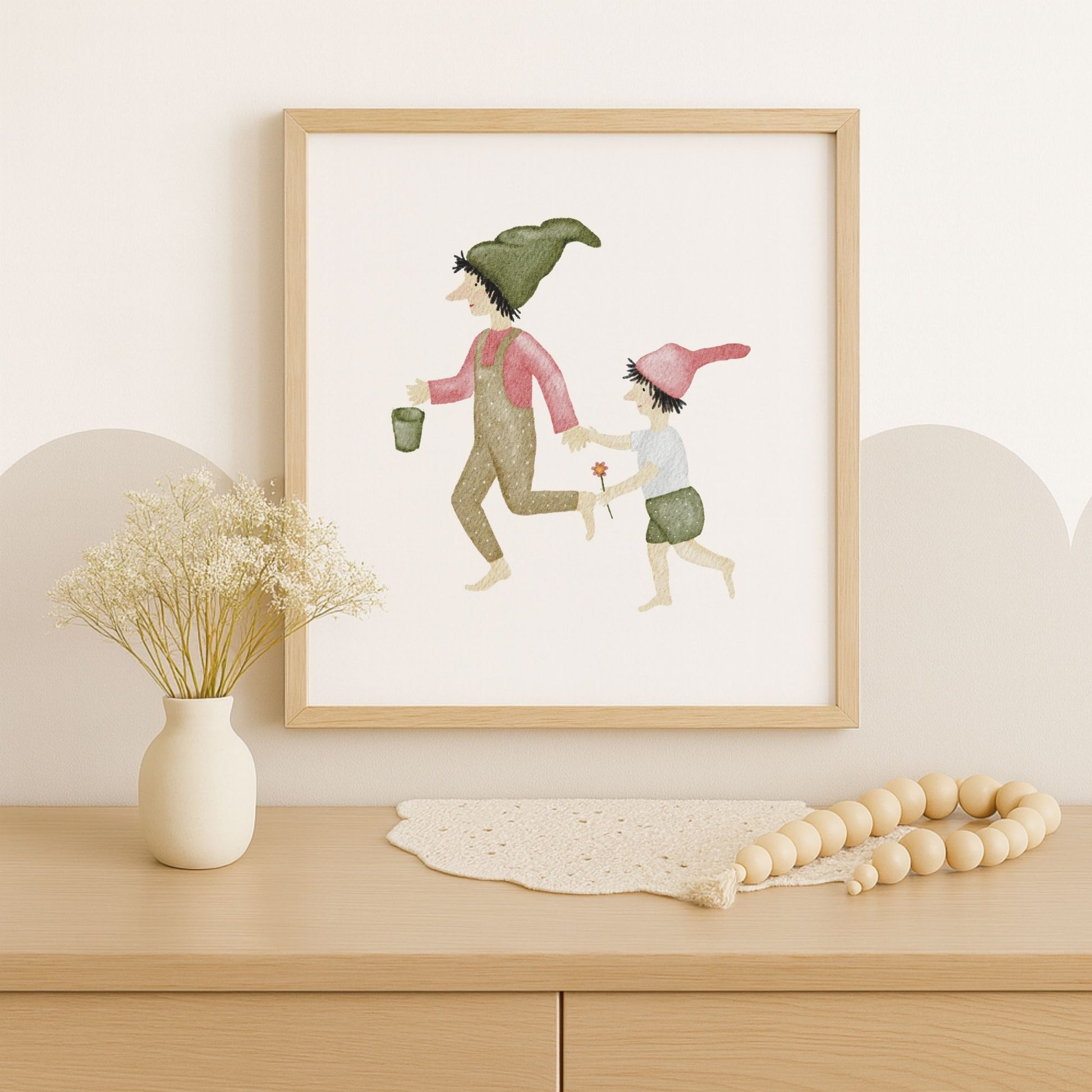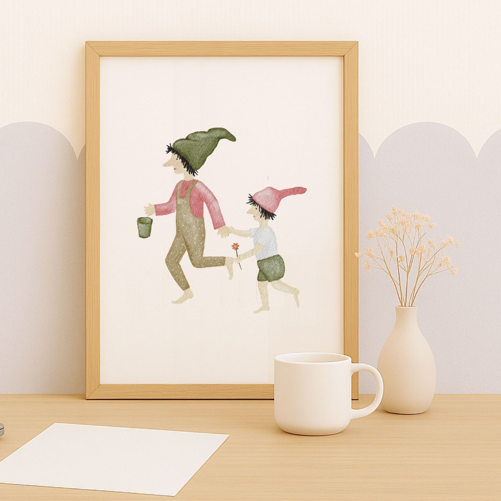 Zwei kleine Zwerge laufen Hand in Hand, der größere hält den kleineren liebevoll und der kleine trägt eine Blume – ein zartes Motiv voller Geborgenheit und „Geschwisterliebe“. Dieses liebevoll illustrierte Kinderzimmer-Poster bringt Nähe, Verbundenheit und warme Familienmomente an eure Wand und passt wunderbar ins Babyzimmer, Geschwisterzimmer oder an euren Lieblingsplatz als leiser Erinnerer daran, dass man gemeinsam nie allein ist.