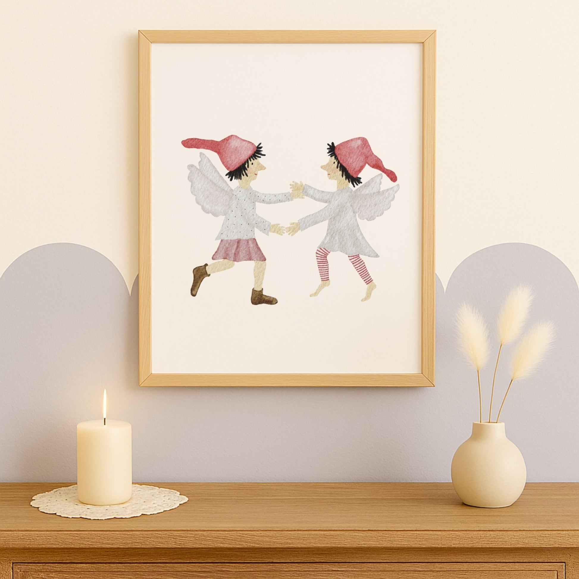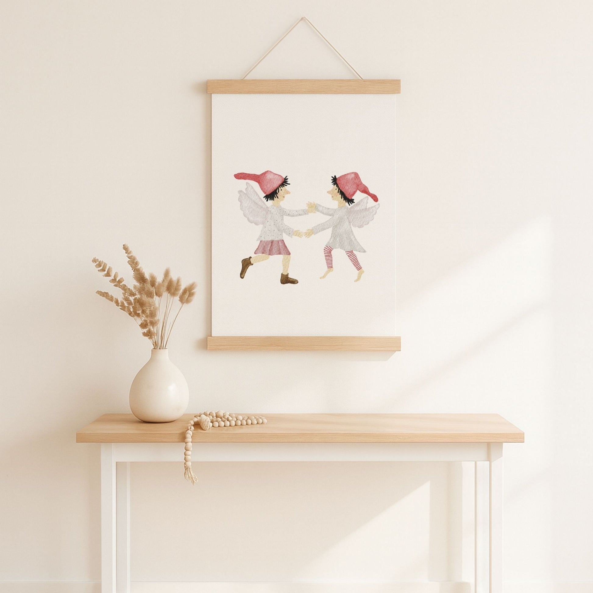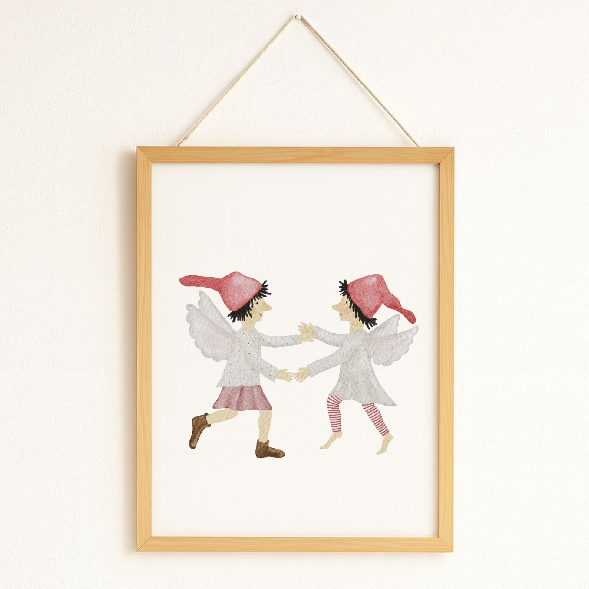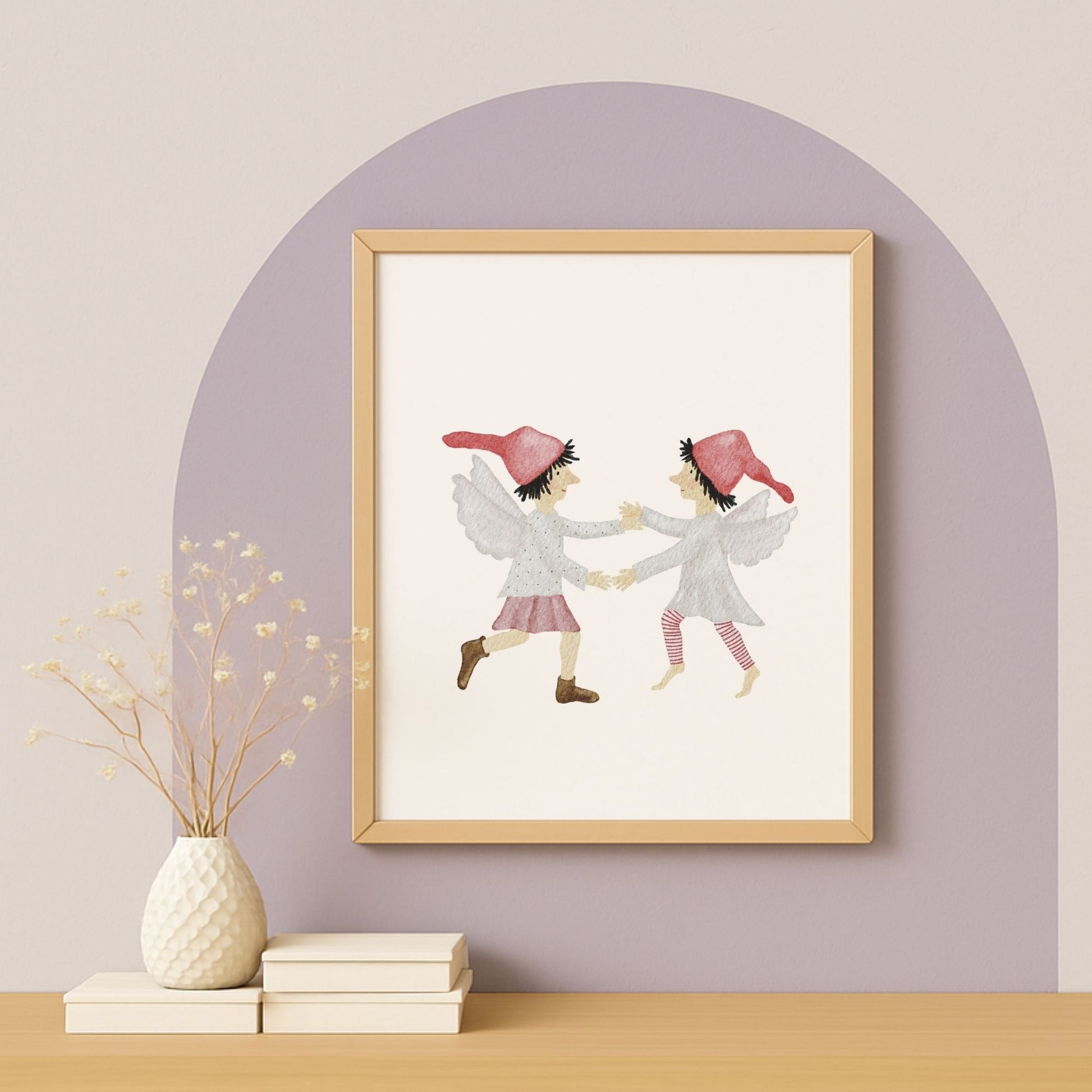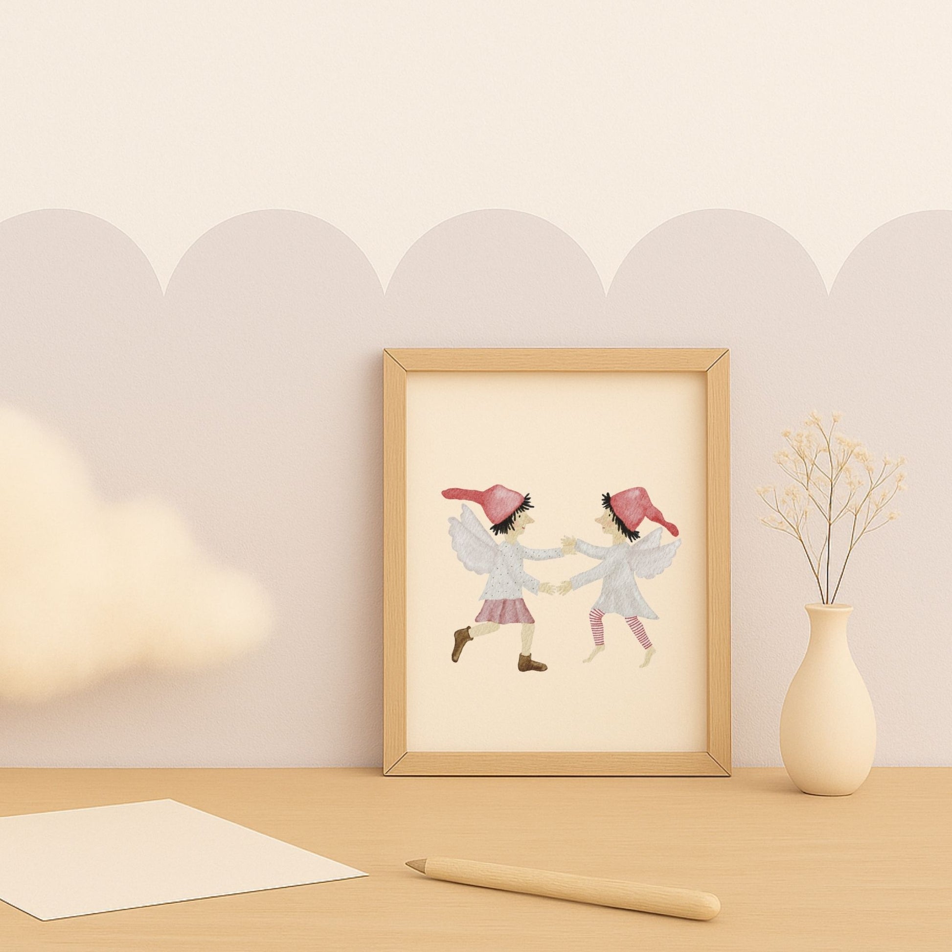 ☁️ Zwei kleine Wichtel mit zarten Flügeln tanzen einen Reigen auf weichen Wolken – ein verträumtes Kinderzimmer-Poster, das Leichtigkeit, Freude und ein bisschen Himmelszauber in dein Zuhause bringt. Dieses Wandbild passt wunderbar in die Weihnachtszeit, ist aber zugleich sanft und zeitlos genug, um euch das ganze Jahr über als himmlischer Blickfang zu begleiten. ☁️