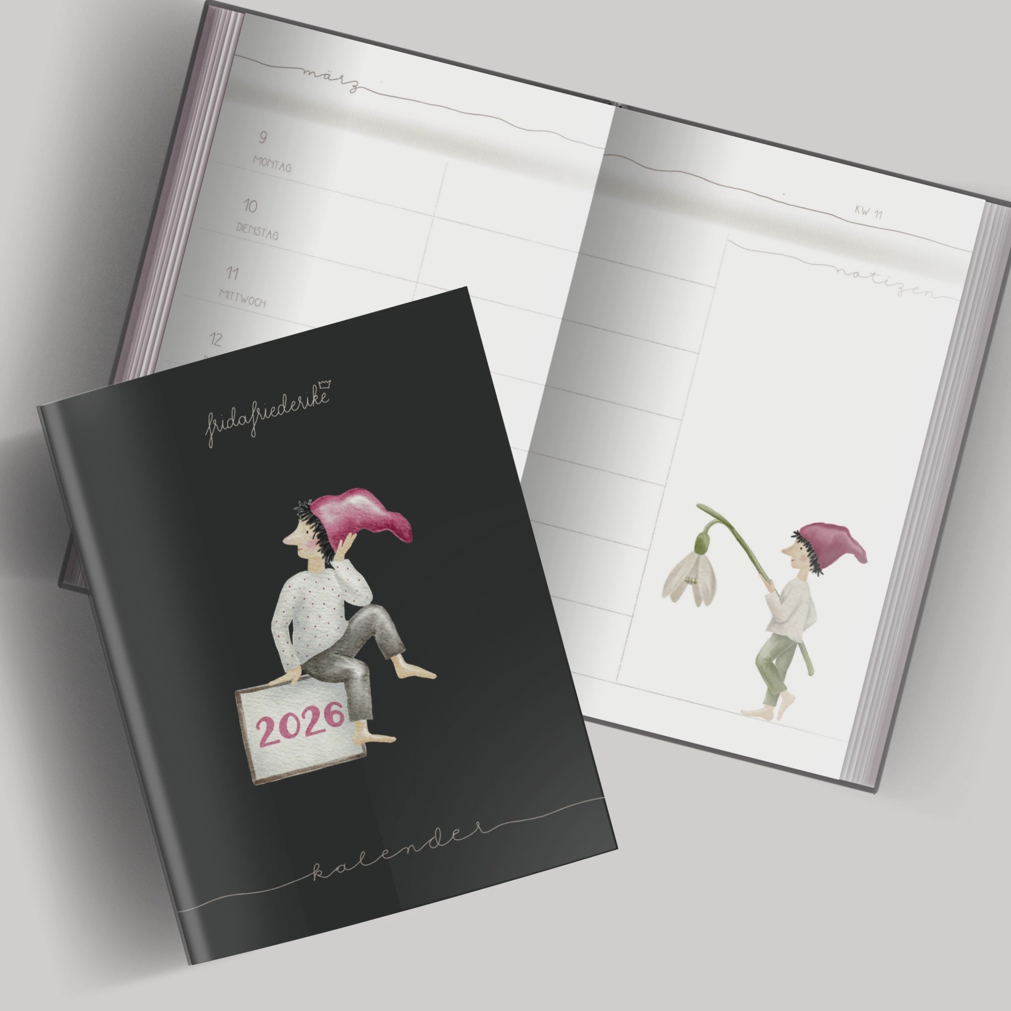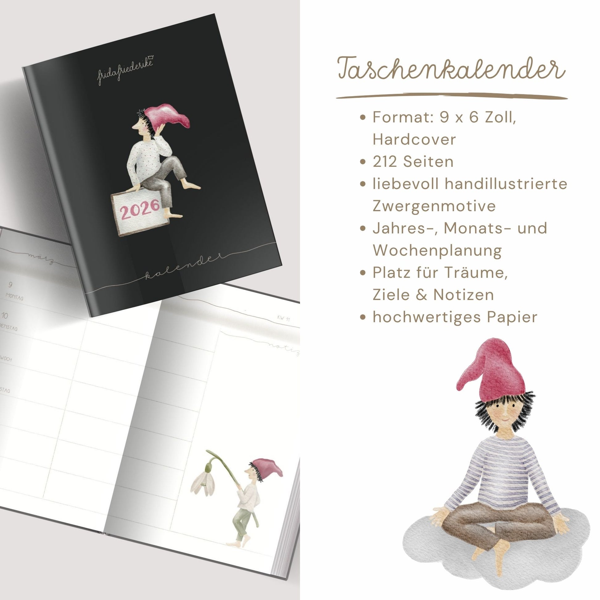 Mit unserem Taschenkalender 2026 beginnt jeder Tag mit einem Lächeln – dank zauberhafter, von Hand illustrierter Zwergenfreunde, die dich durchs Jahr begleiten.