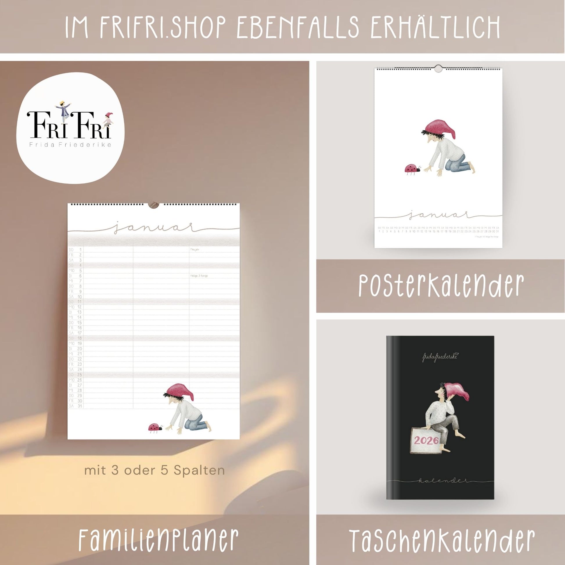 Unsere Kalender gibt es auch als Posterkalender oder Familienplaner und als Taschenkalender für unterwegs.