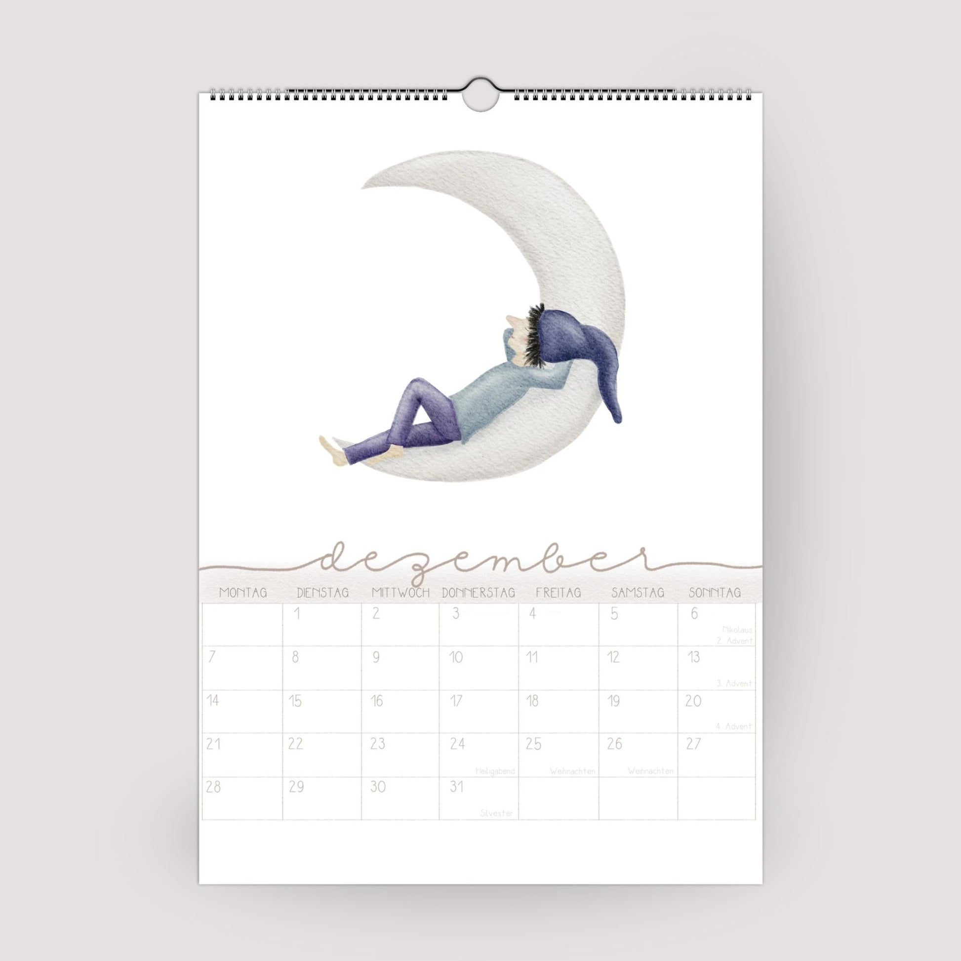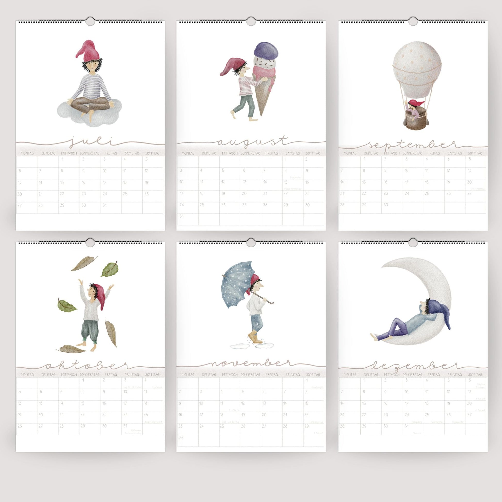 Unser Zwergen-Wandplaner 2026 vereint 12 zarte, handillustrierte Zwergenmotive mit einem klaren und ruhigen Kalendarium. Jeder Monat wird begleitet von einem liebevoll gezeichneten Wichtel – mal mit einem Glückskäfer, mal beim Eisessen, im Heißluftballon oder schlafend auf dem Mond. Die Motive sind märchenhaft und dennoch stilvoll – perfekt, um den Alltag mit einem Hauch Magie zu verzaubern.