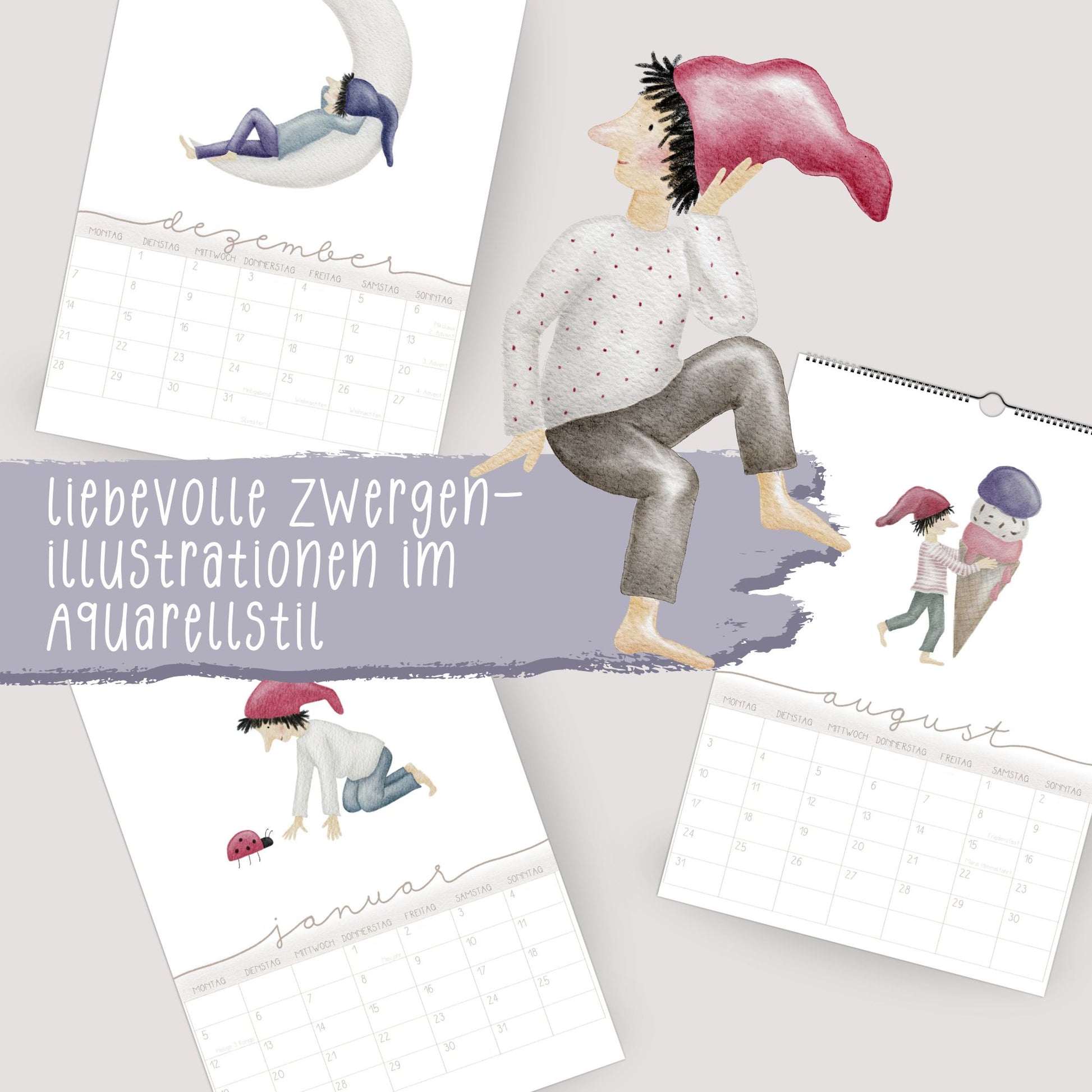 Liebevoll gestalteter Kalender mit handillustrierten Zwergenfreuden