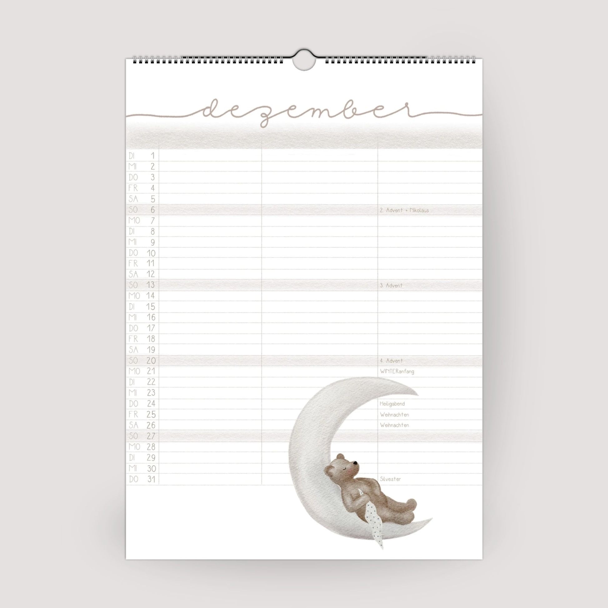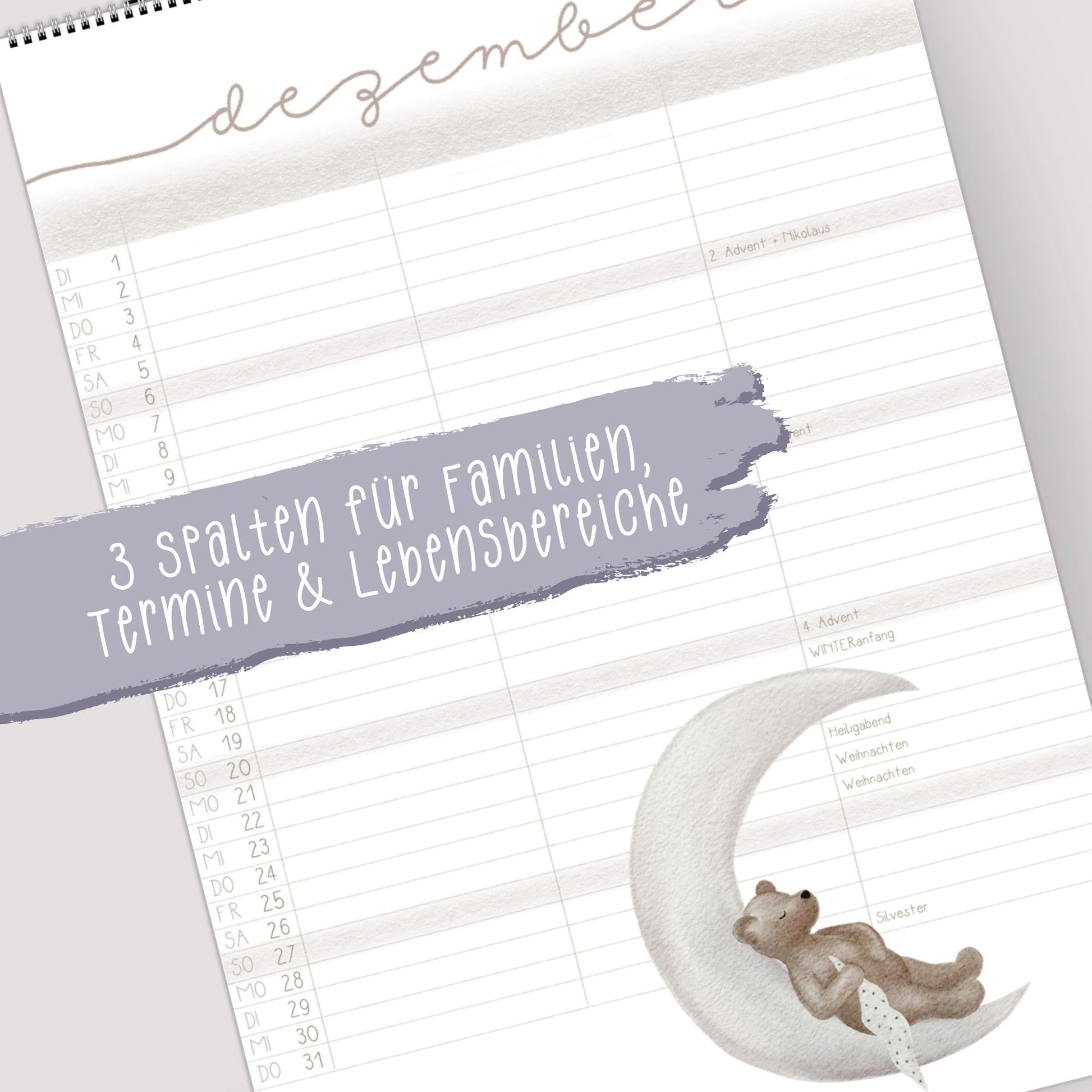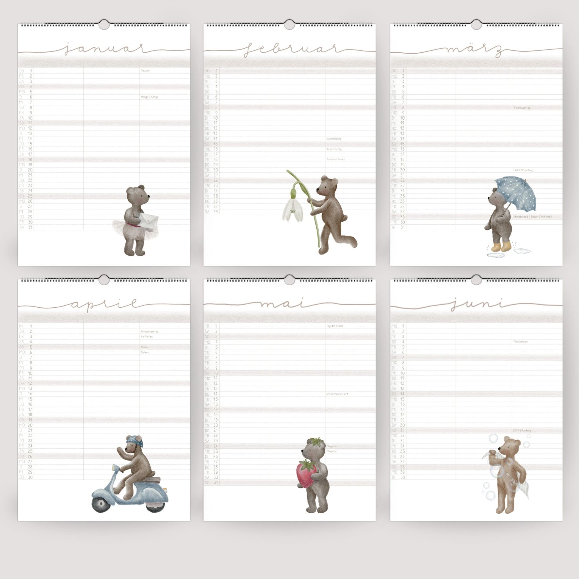 Ein Kalender, der Ordnung in den Familienalltag bringt – und dabei auch noch wunderschön aussieht! Unser liebevoll gestalteter Familienplaner mit handillustrierten Bärenmotiven vereint Funktionalität mit einem humorvollem Hauch von Magie.