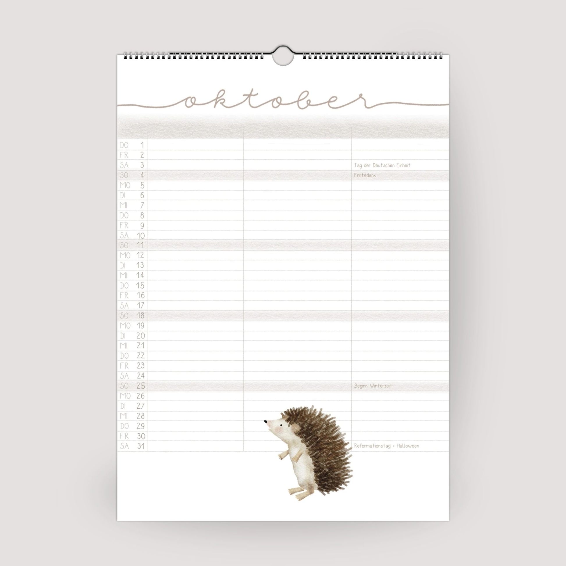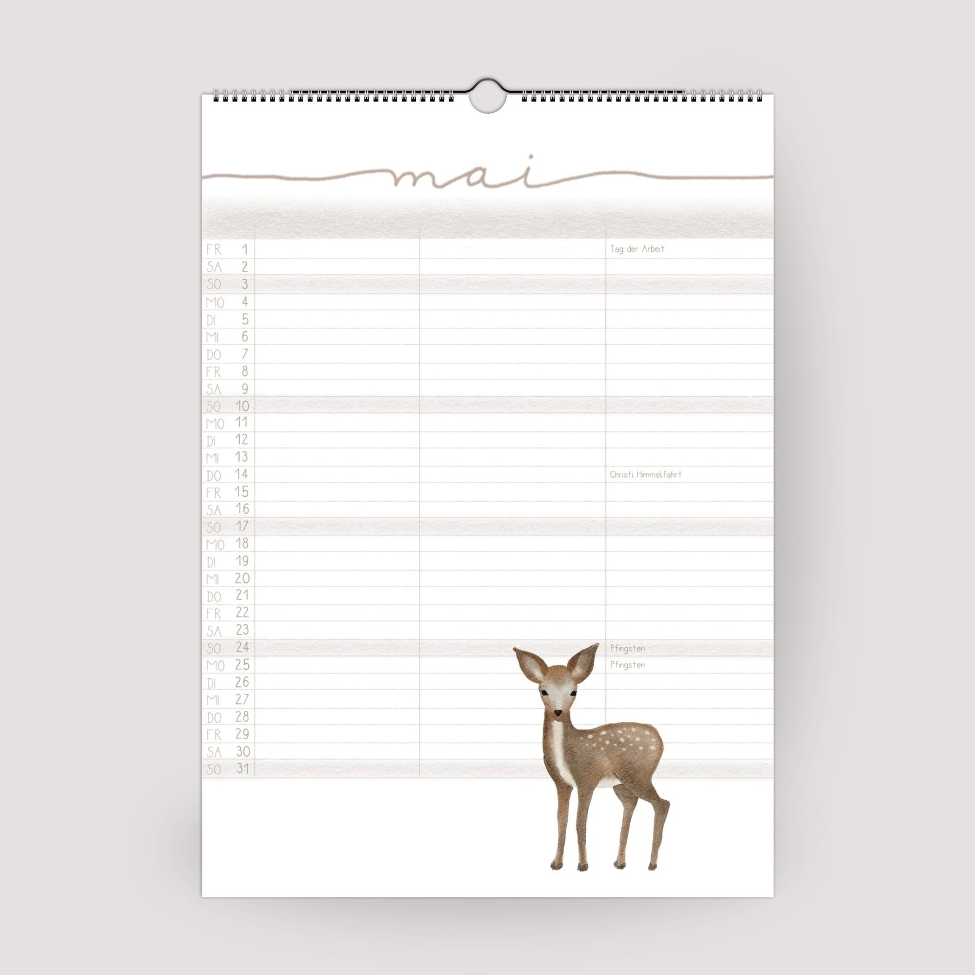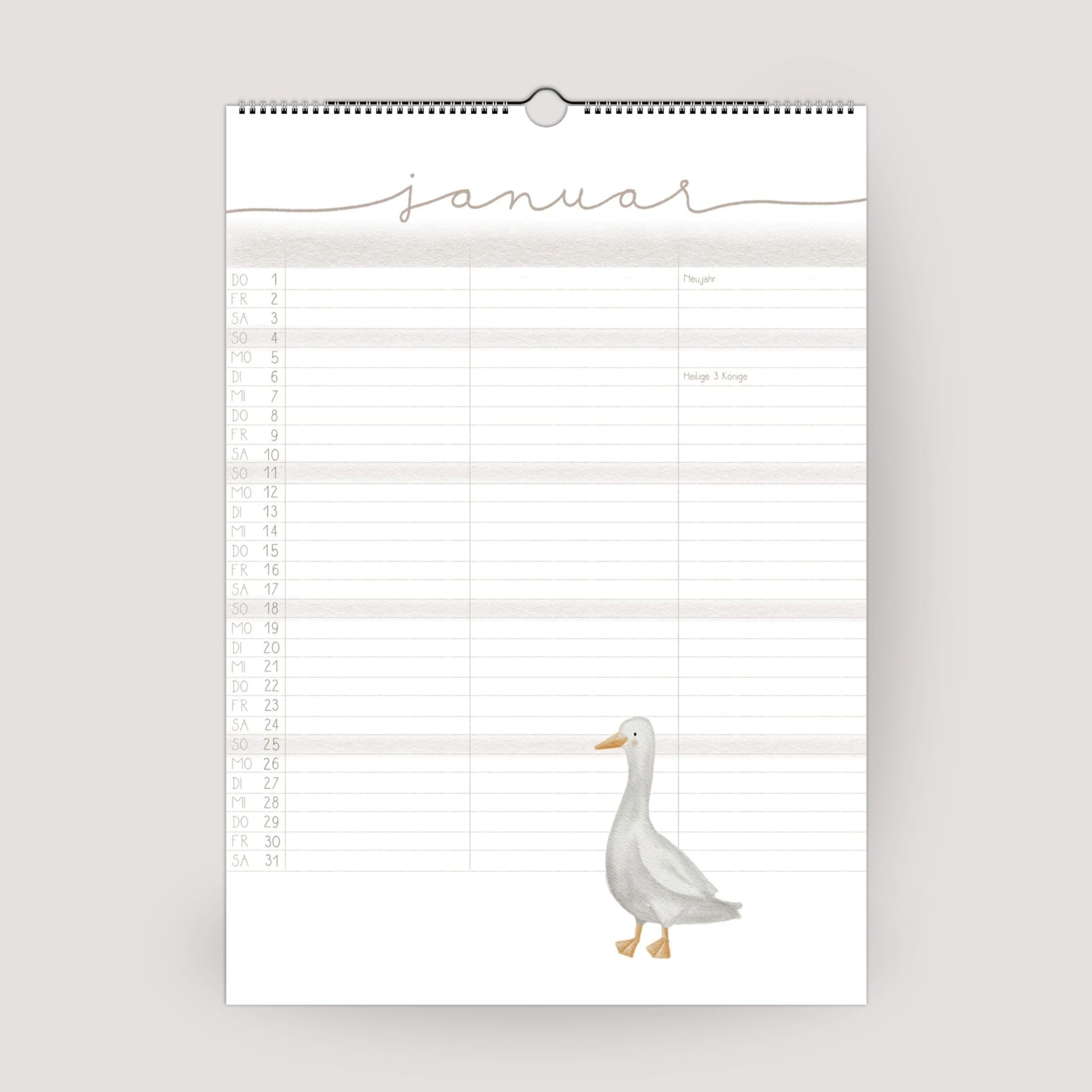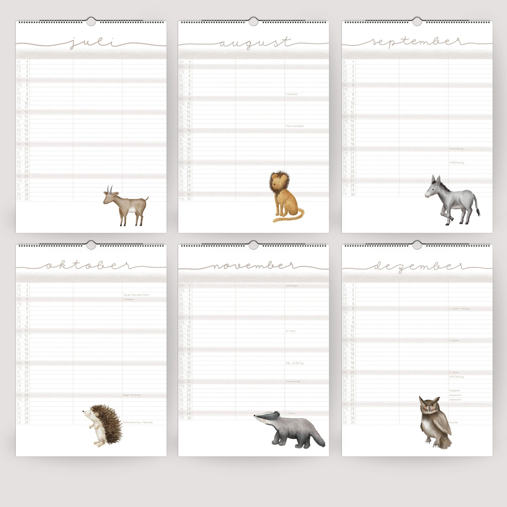 Ob mit 3 oder 5 Spalten – du hast genug Platz, um alle Termine übersichtlich für jedes Familienmitglied einzutragen. Die Monatsübersichten sind klar strukturiert, das Kalendarium dezent, damit die detailreichen Tierillustrationen ihre volle Wirkung entfalten können.