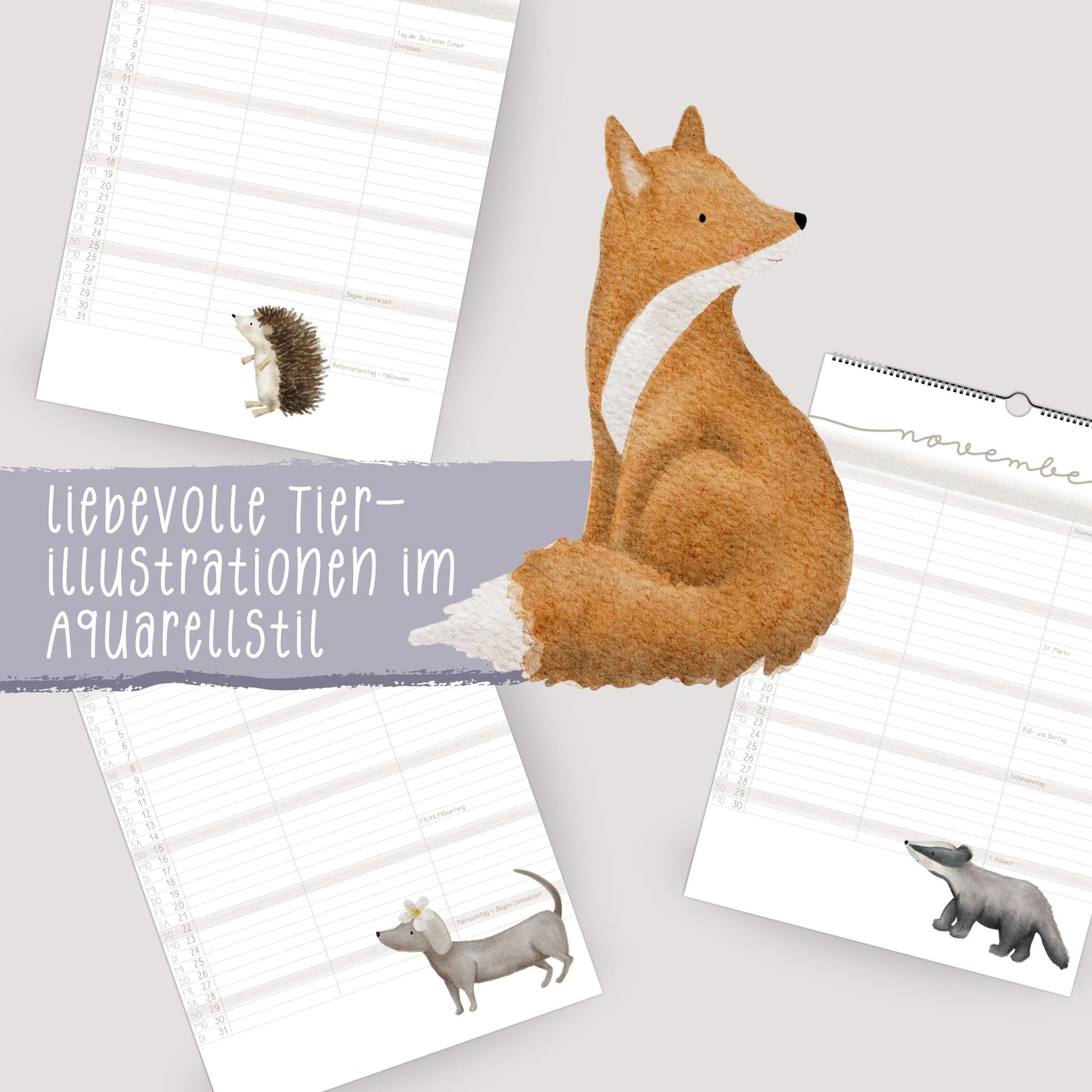 Die Motive wechseln monatlich und zeigen vertraute wie charmante Waldbewohner – vom Dachs bis zum Otter, vom Reh bis zur Gans – in zarten, natürlichen Farben.