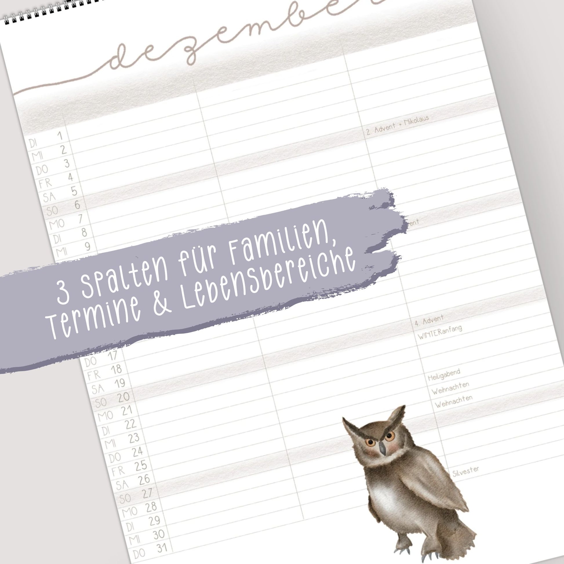 - Kalendarium mit 3 oder 5 Spalten für alle Familienmitglieder oder Lebensbereiche, mit wichtigen Feiertagen