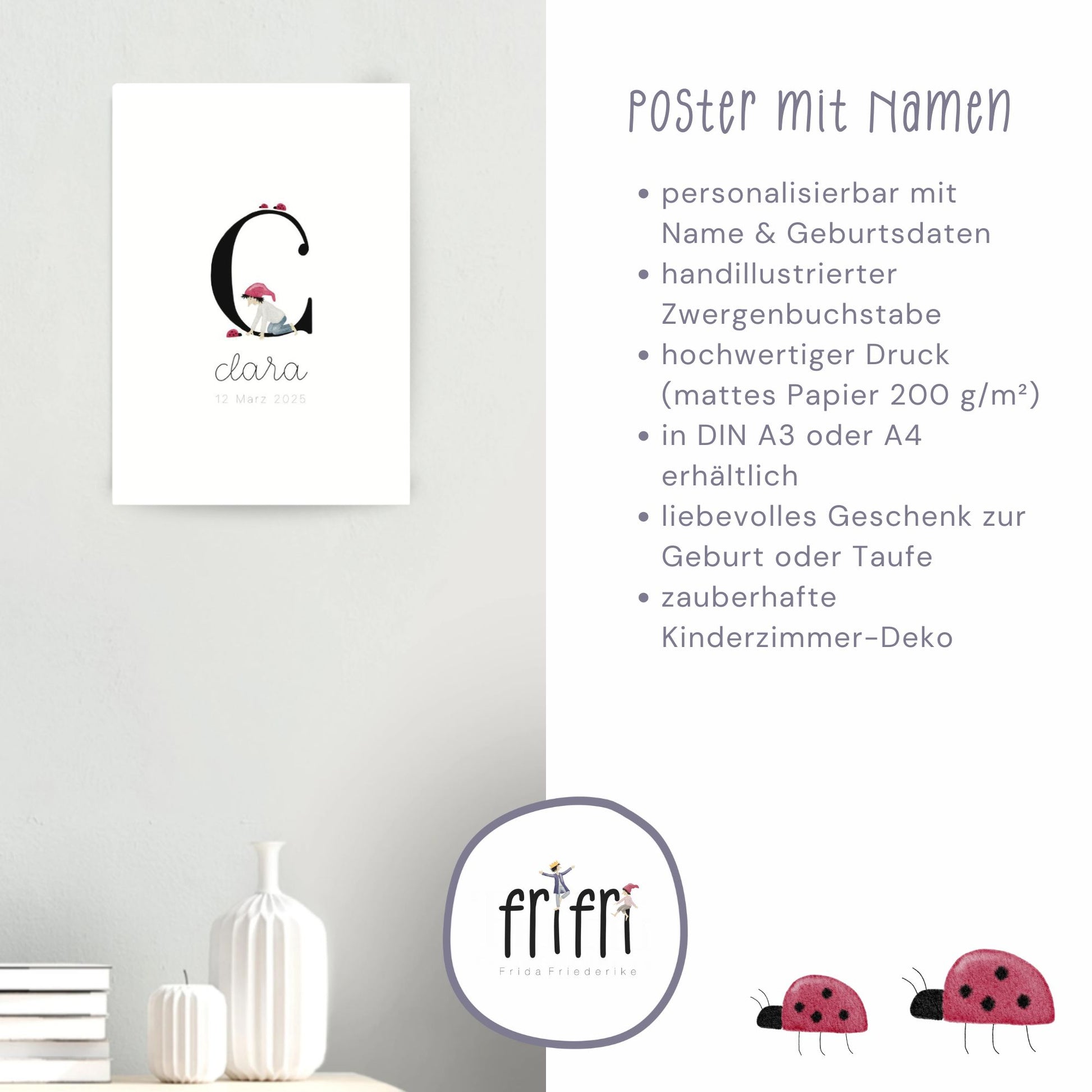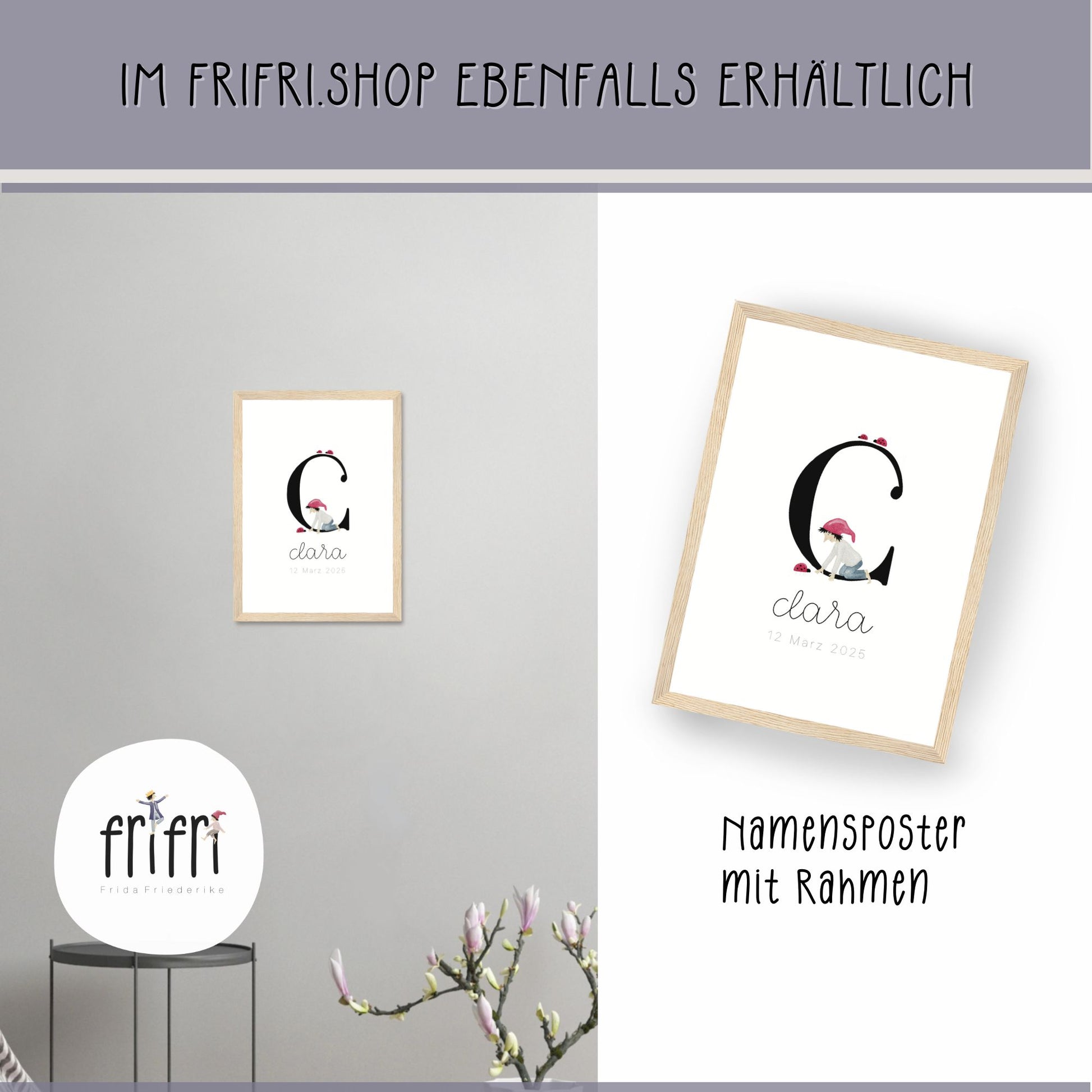 Der Anfangsbuchstabe des Namens wird von einem niedlichen, handillustrierten Zwerg begleitet, der über das neue Leben zu wachen scheint. Unter dem Motiv stehen der Name und das Geburtsdatum des Kindes – für eine Erinnerung, die nie verblasst. ✨