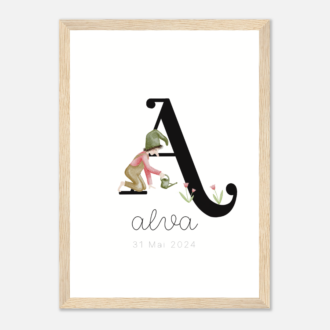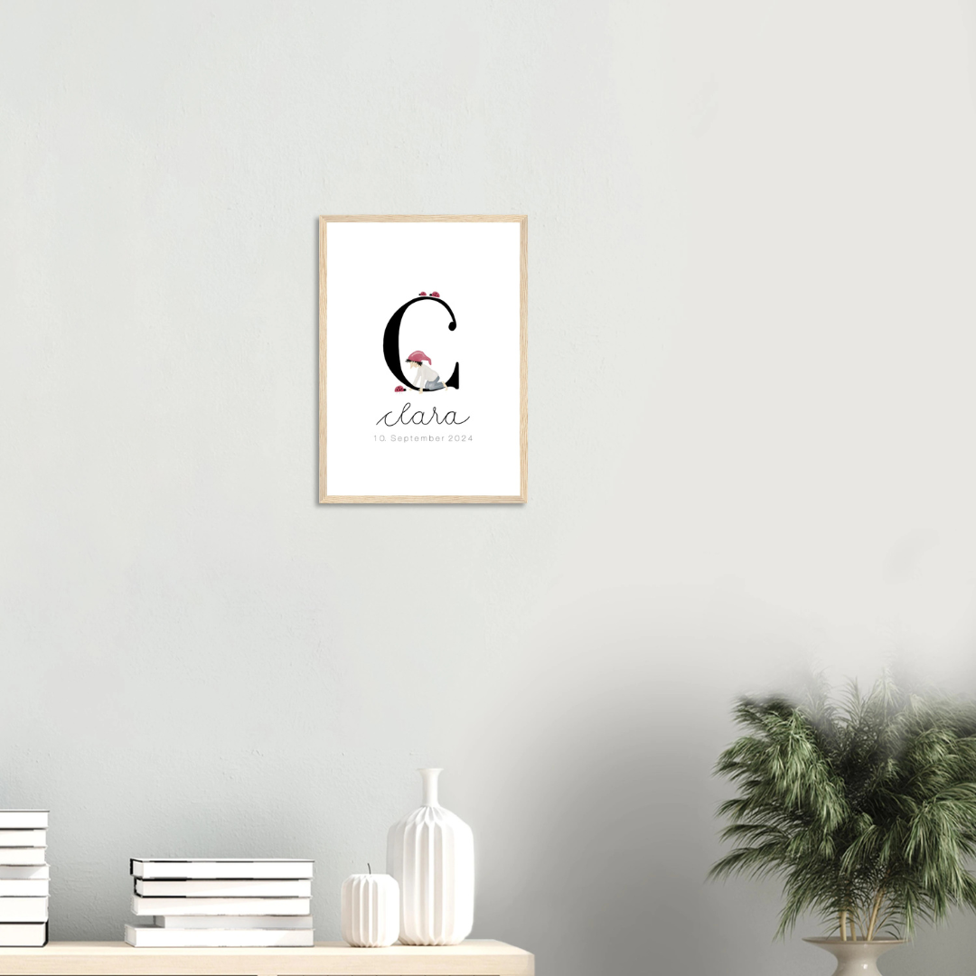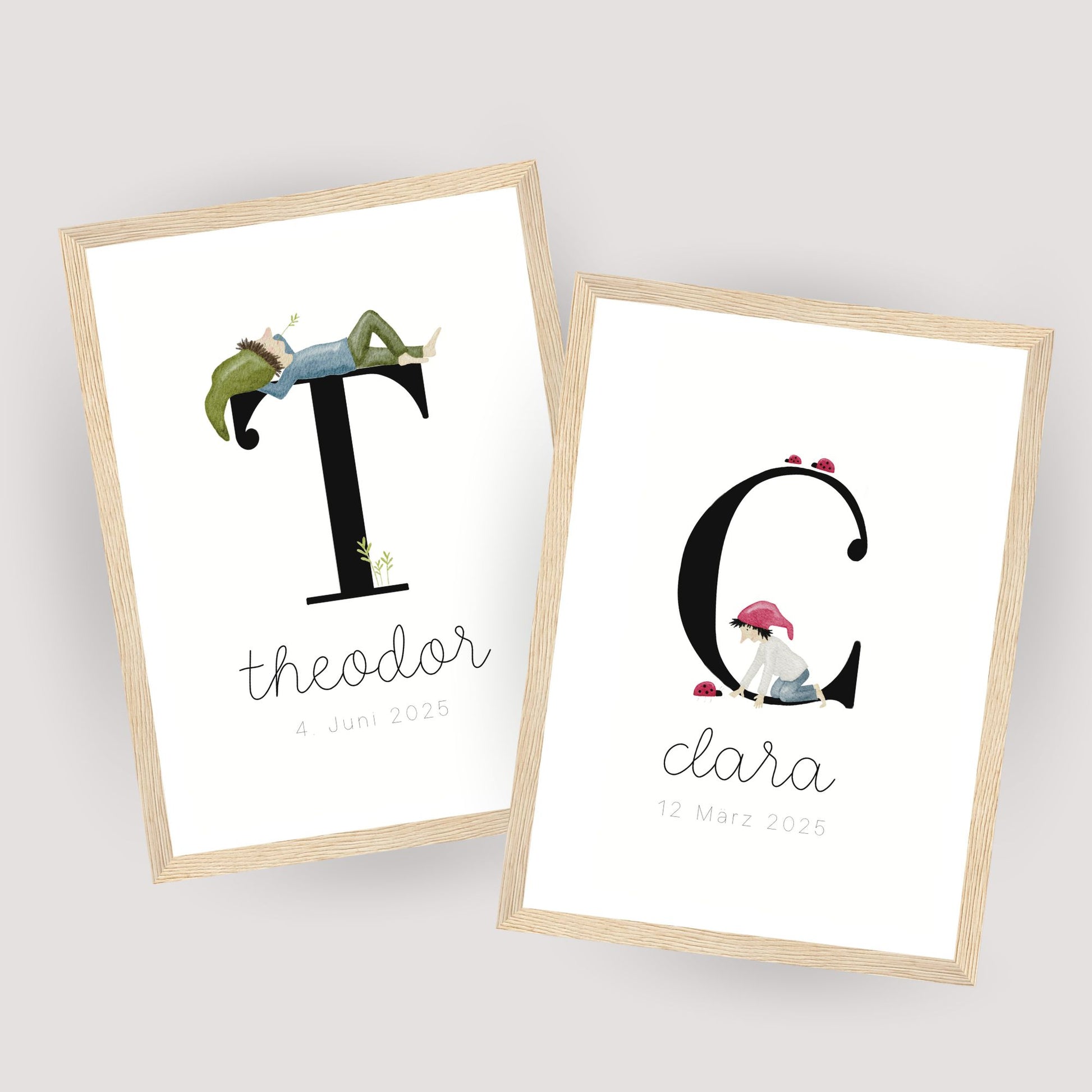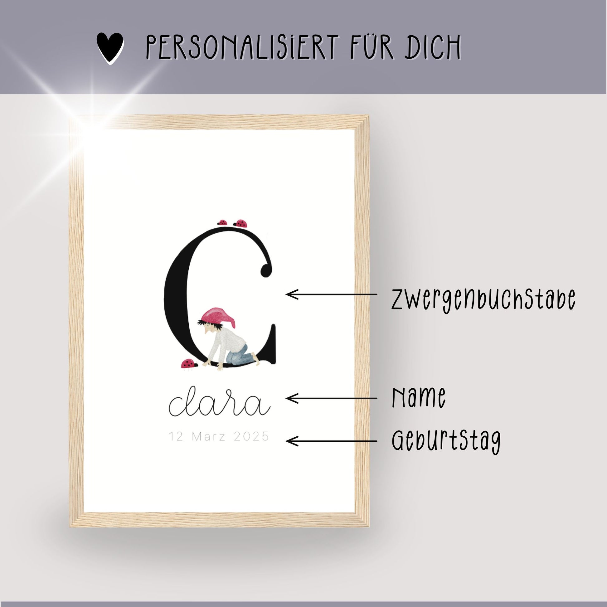gerahmtes Geburtsposter mit Zwergenbuchstabe (personalisierbar)