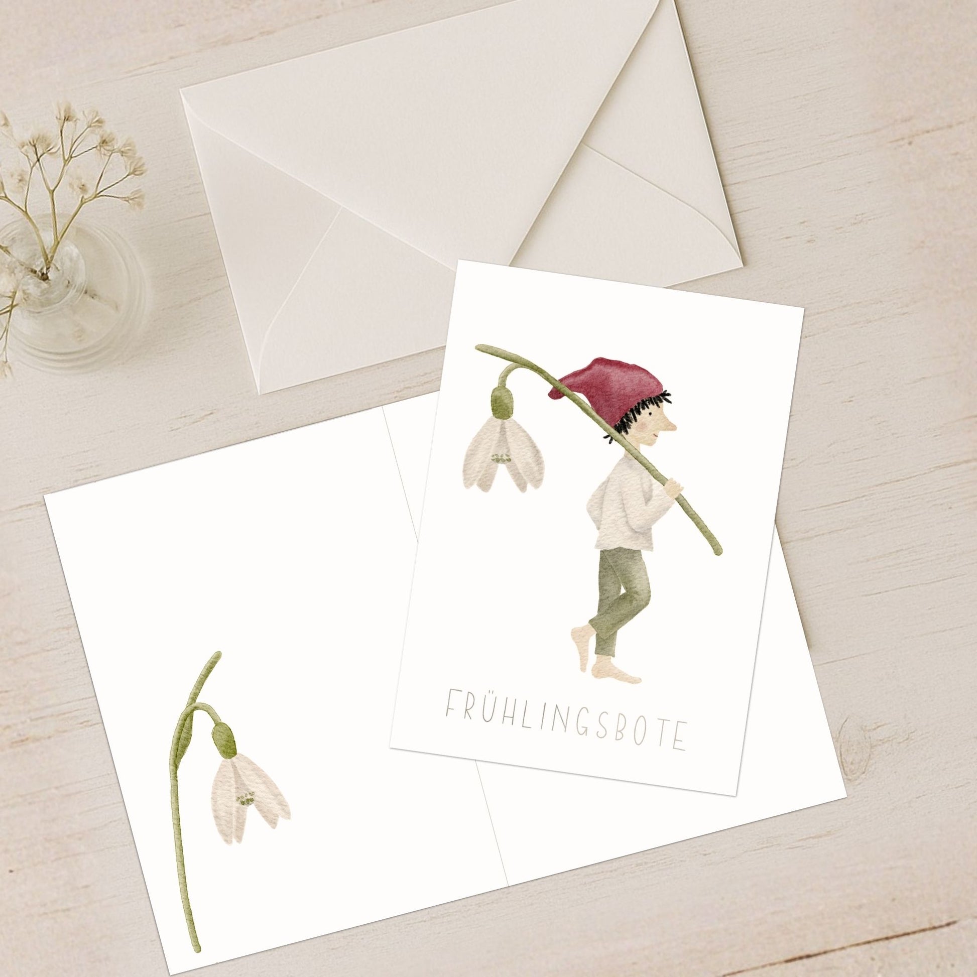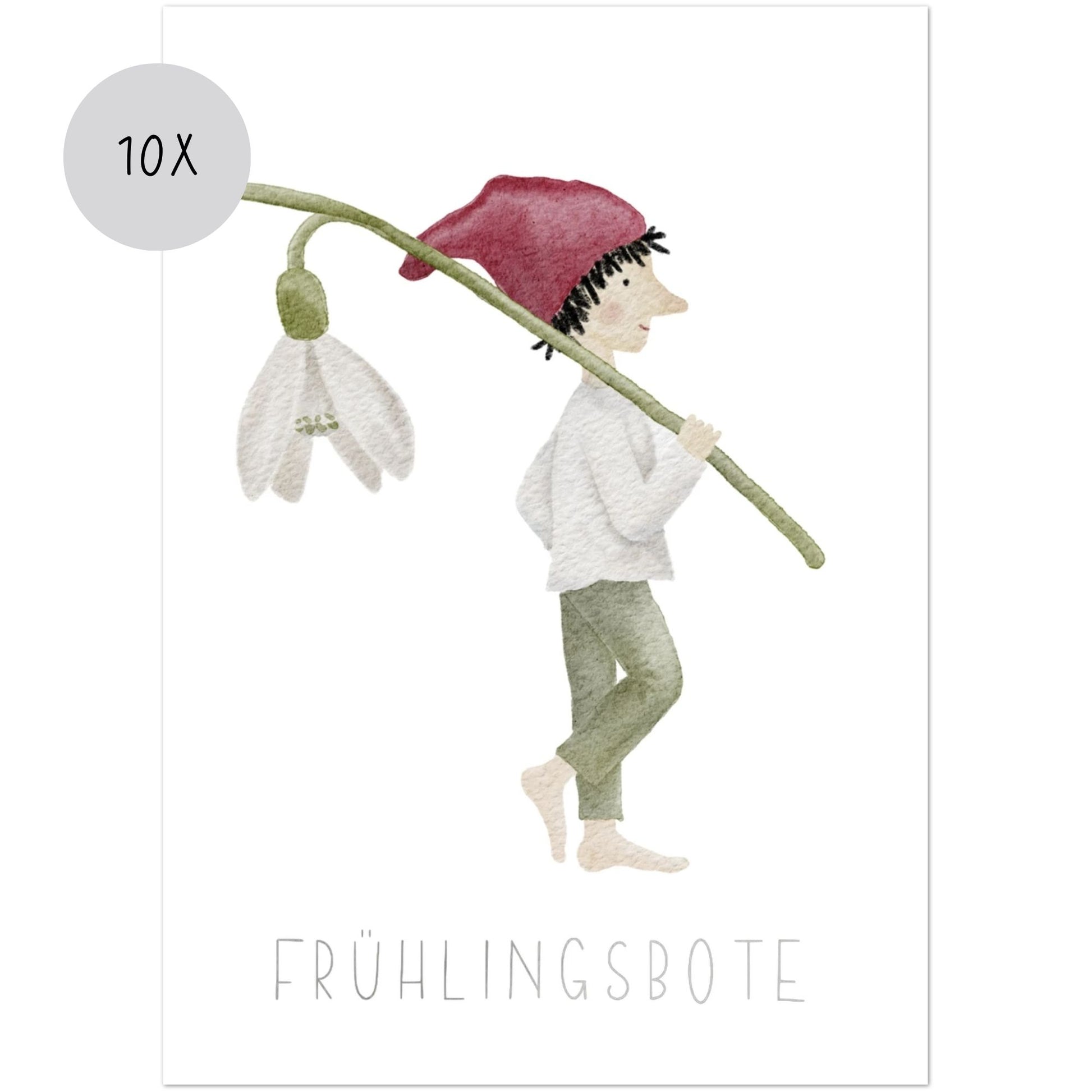 Karten 10er Set "Frühlingsbote" – Grußkarten A6/A5 mit kleinem Zwerg und Schneeglöckchen