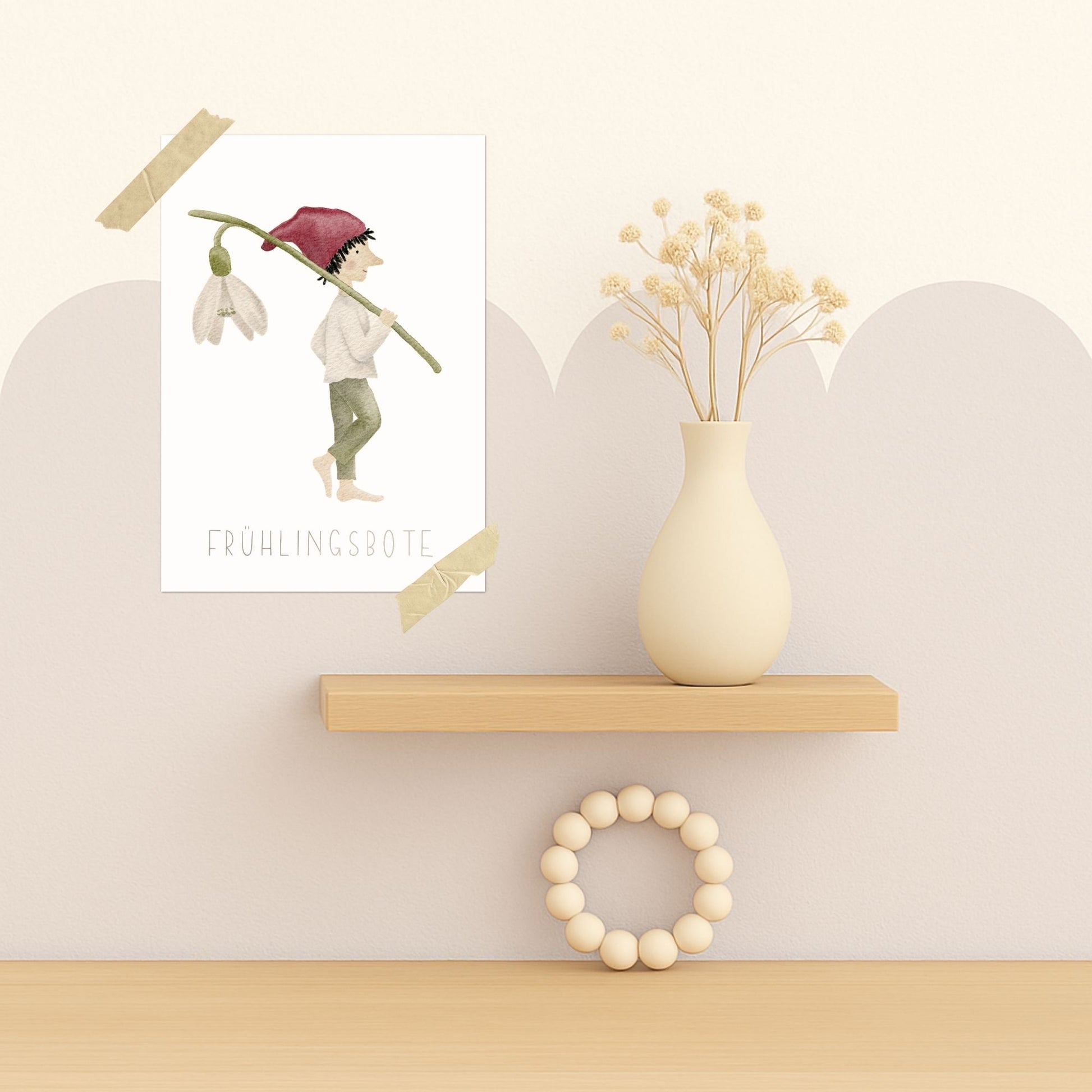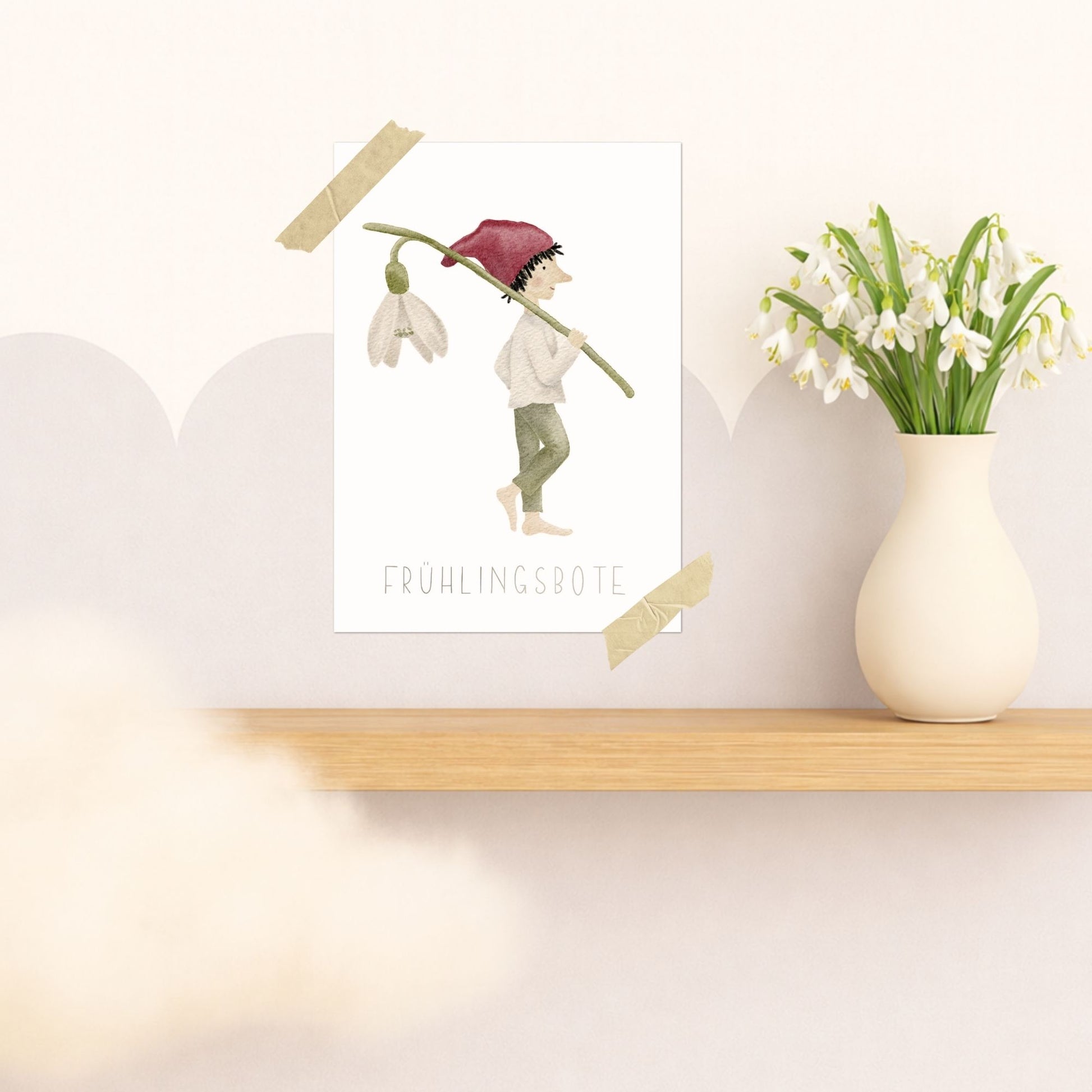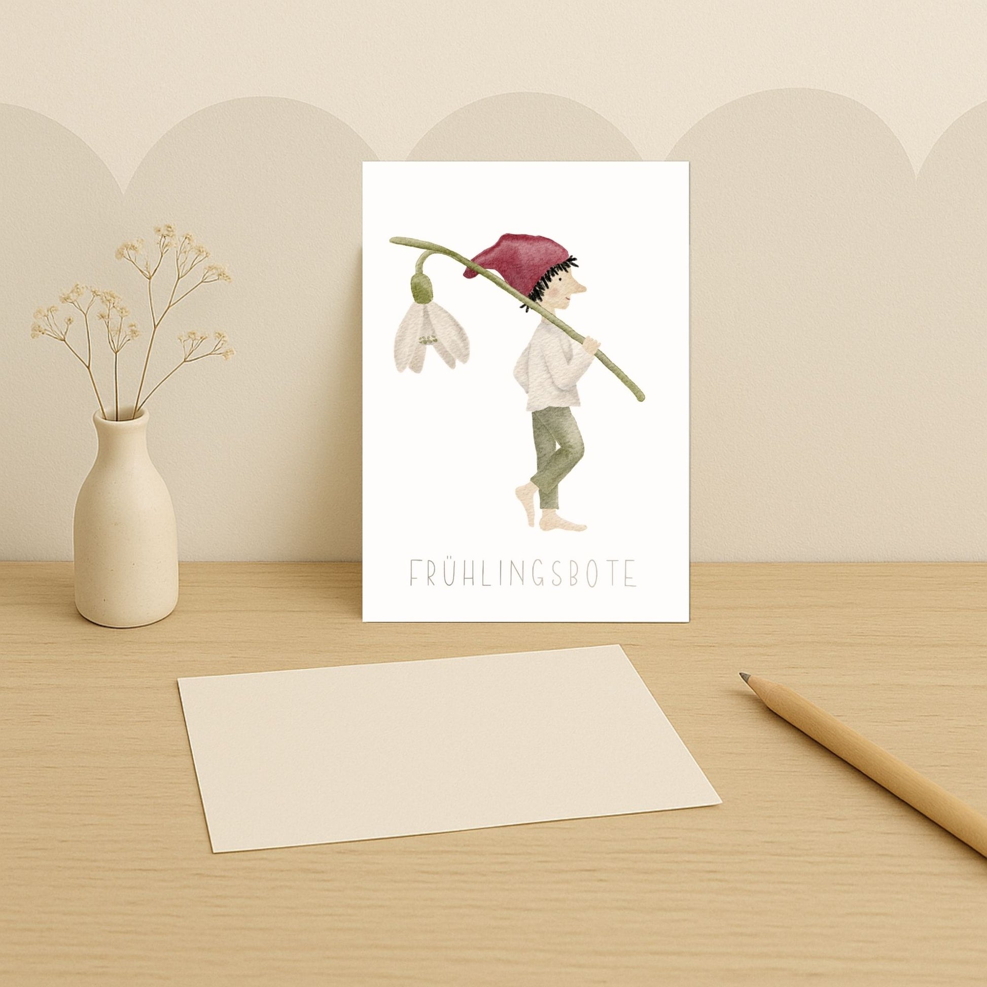 Ein kleiner Zwerg trägt behutsam ein Schneeglöckchen über der Schulter, als hätte er den Frühling selbst auf den Weg gebracht. Mit der Aufschrift „Frühlingsbote“ wird dieses Motiv zu einer leisen Nachricht vom Neubeginn – zart, hoffnungsvoll und voller stiller Vorfreude. Eine liebevolle Karte für all jene, denen man sagen möchte: Der Winter geht, etwas Neues darf wachsen.