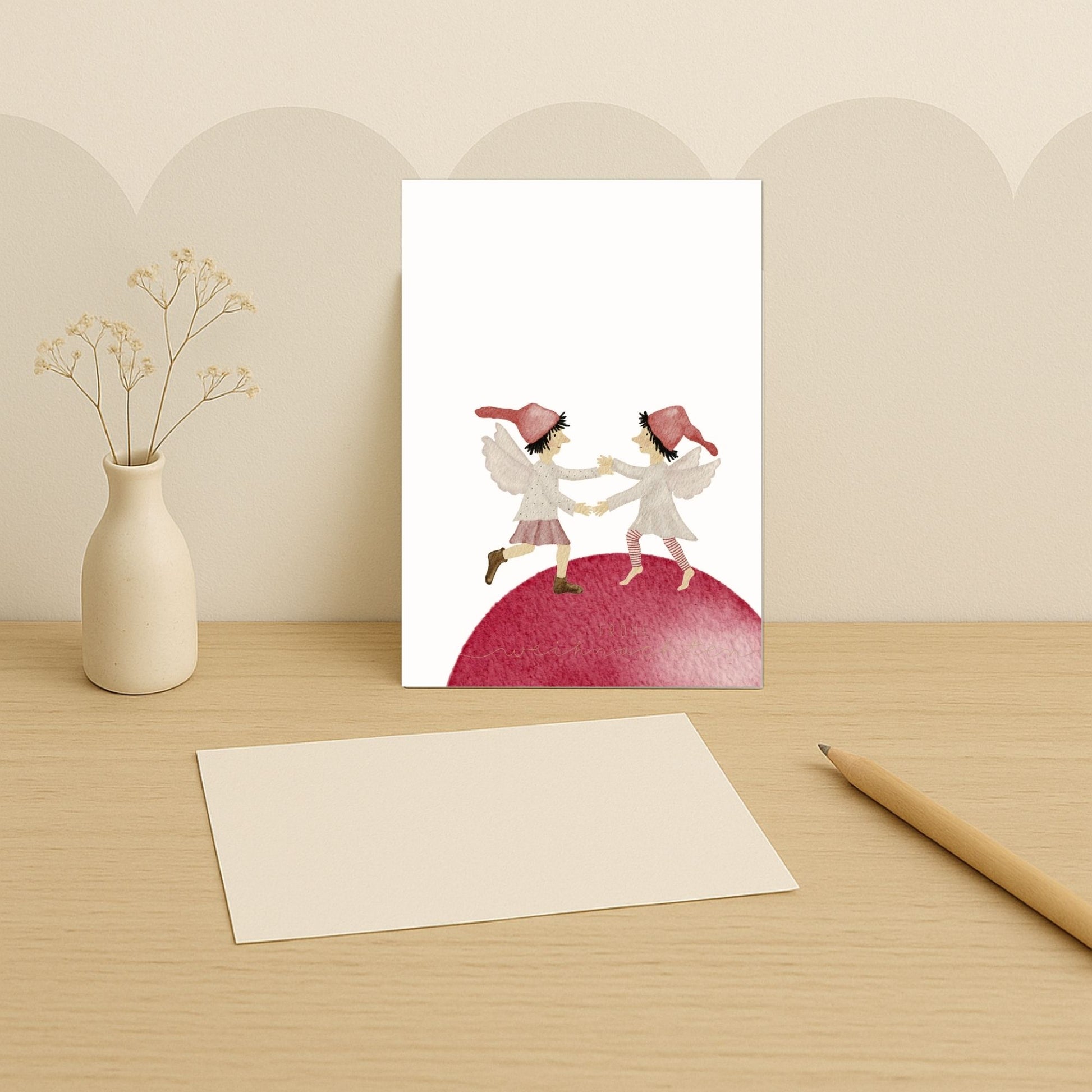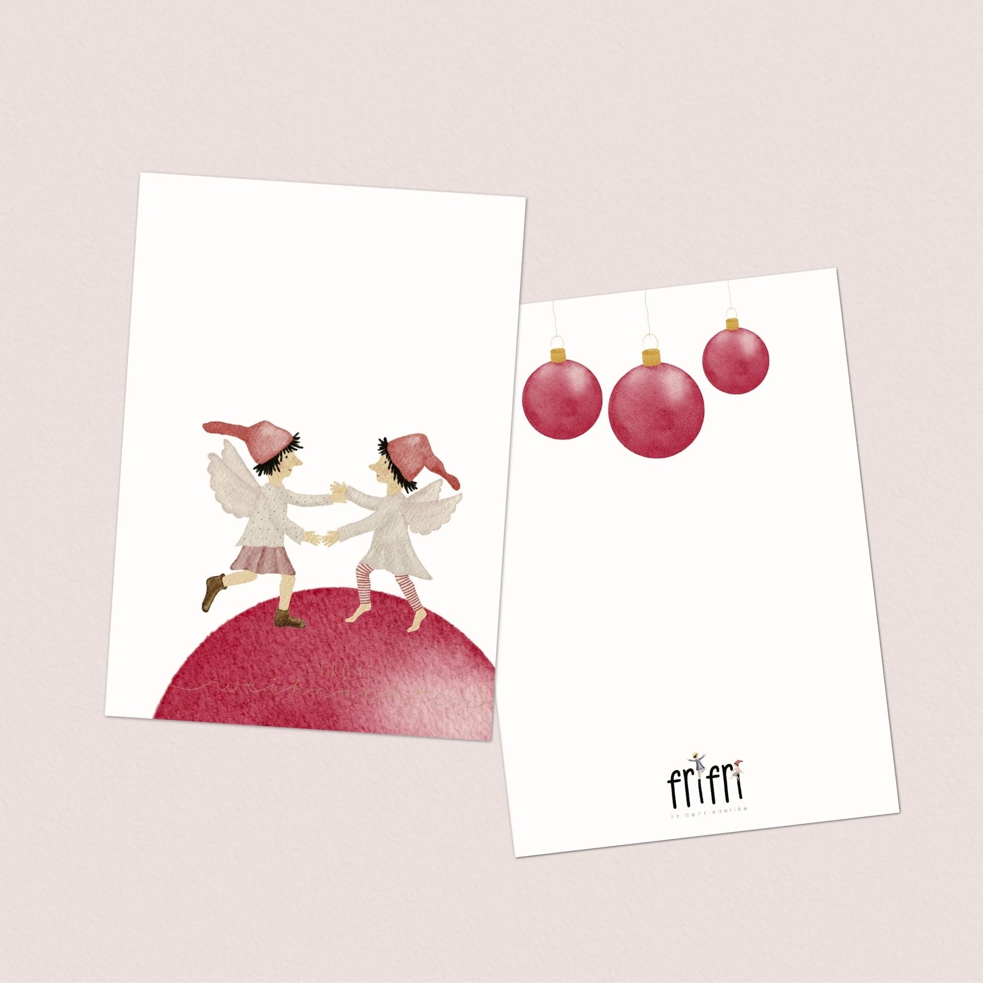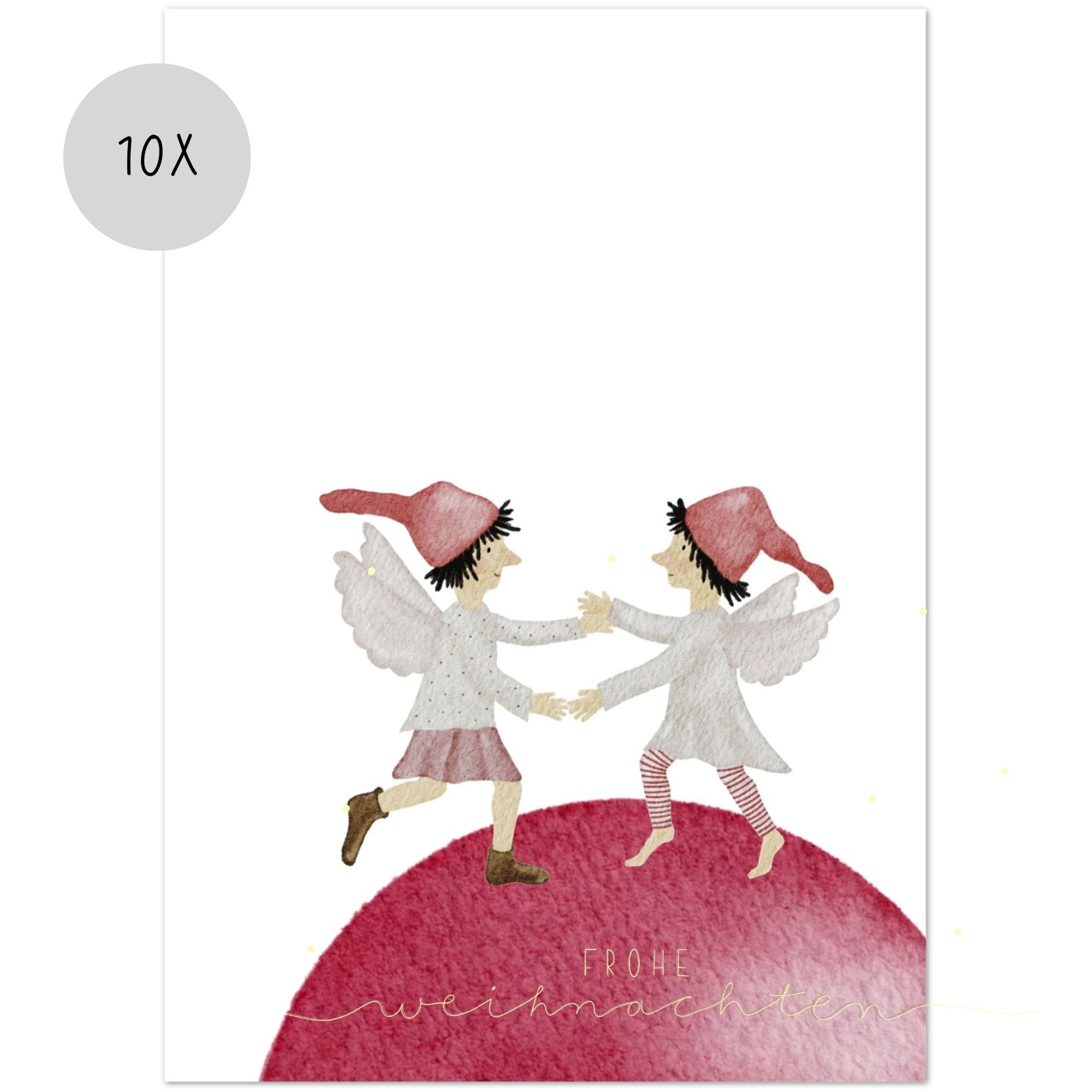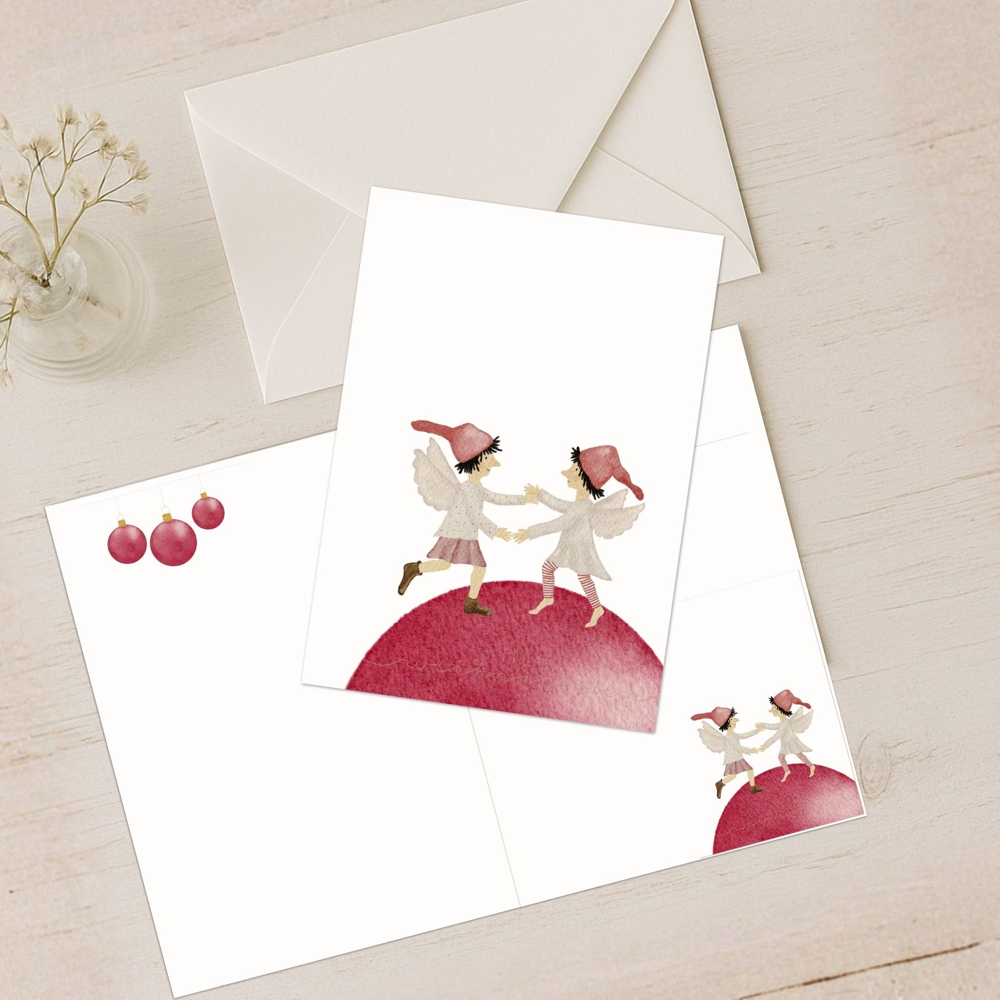 Weihnachtskarten Set 10 Stück – Tanzende Weihnachtselfen auf Christbaumkugel | handillustrierte Grußkarten A6/A5 | Motiv „Frohe Weihnachten“