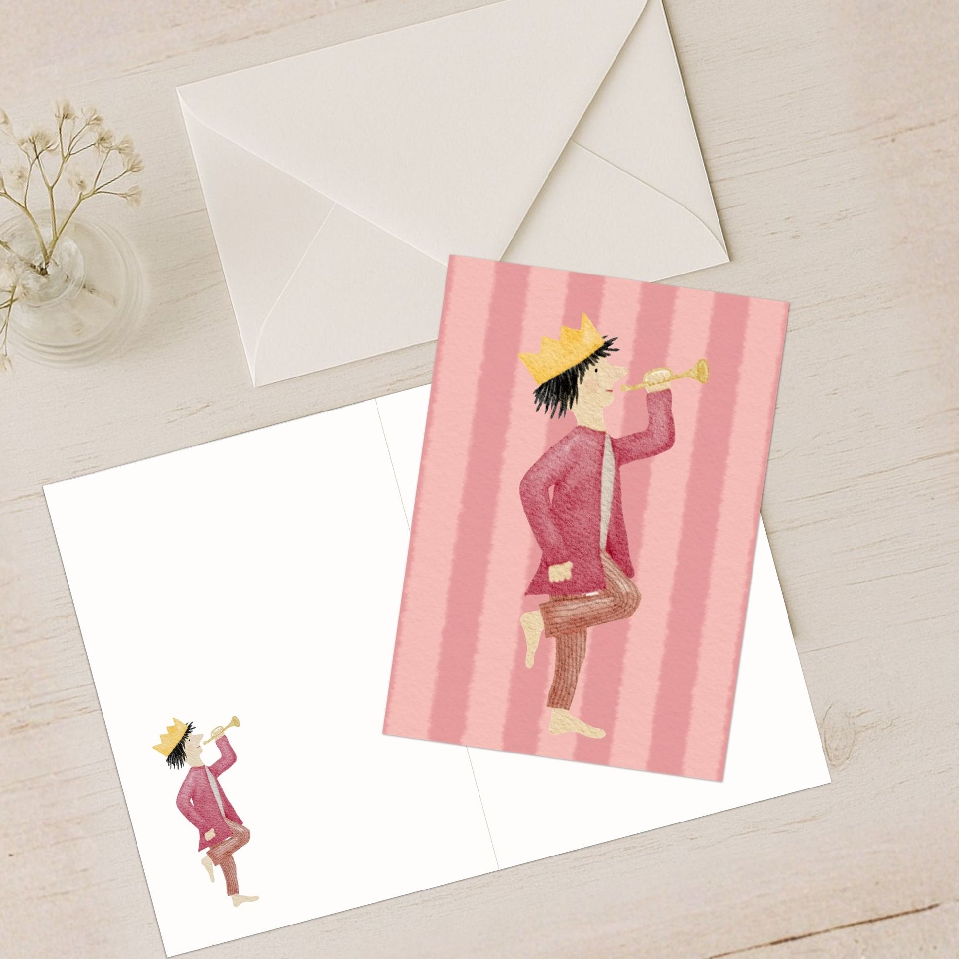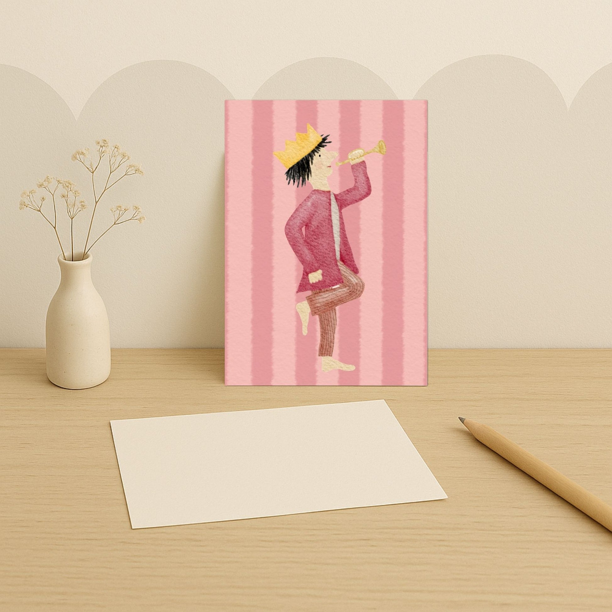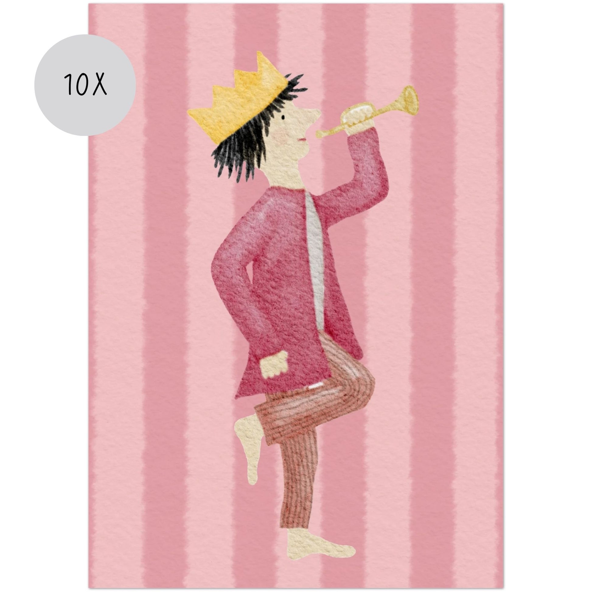 Unser kleiner König auf seinem bunten Streifen-Hintergrund zaubert nicht nur dir, sondern auch dem Beschenkten ein Lächeln ins Gesicht und überbringt Glückwünsche, die von Herzen kommen. Egal ob Geburtstag, einfach mal so oder ein besonderer Anlass – mit dieser Karte drückst du deine Gefühle auf ganz besondere Weise aus.