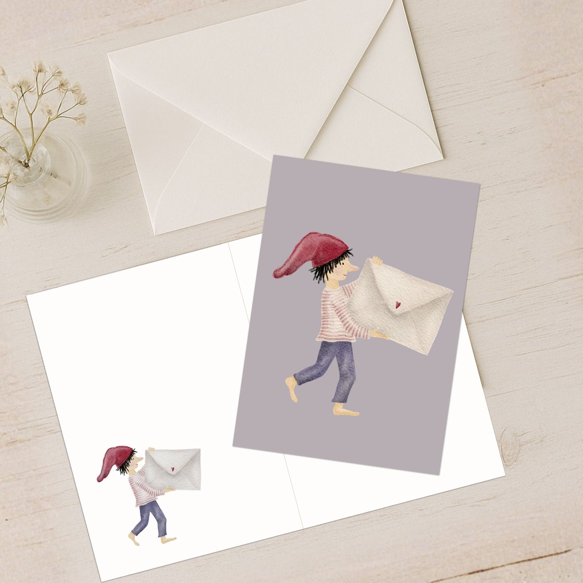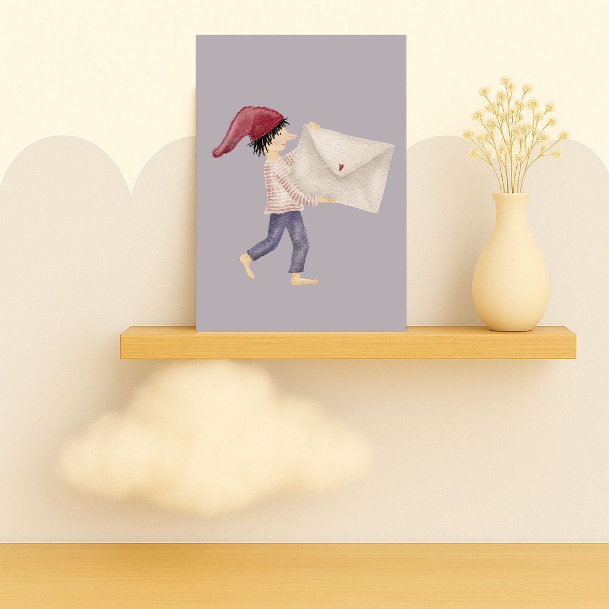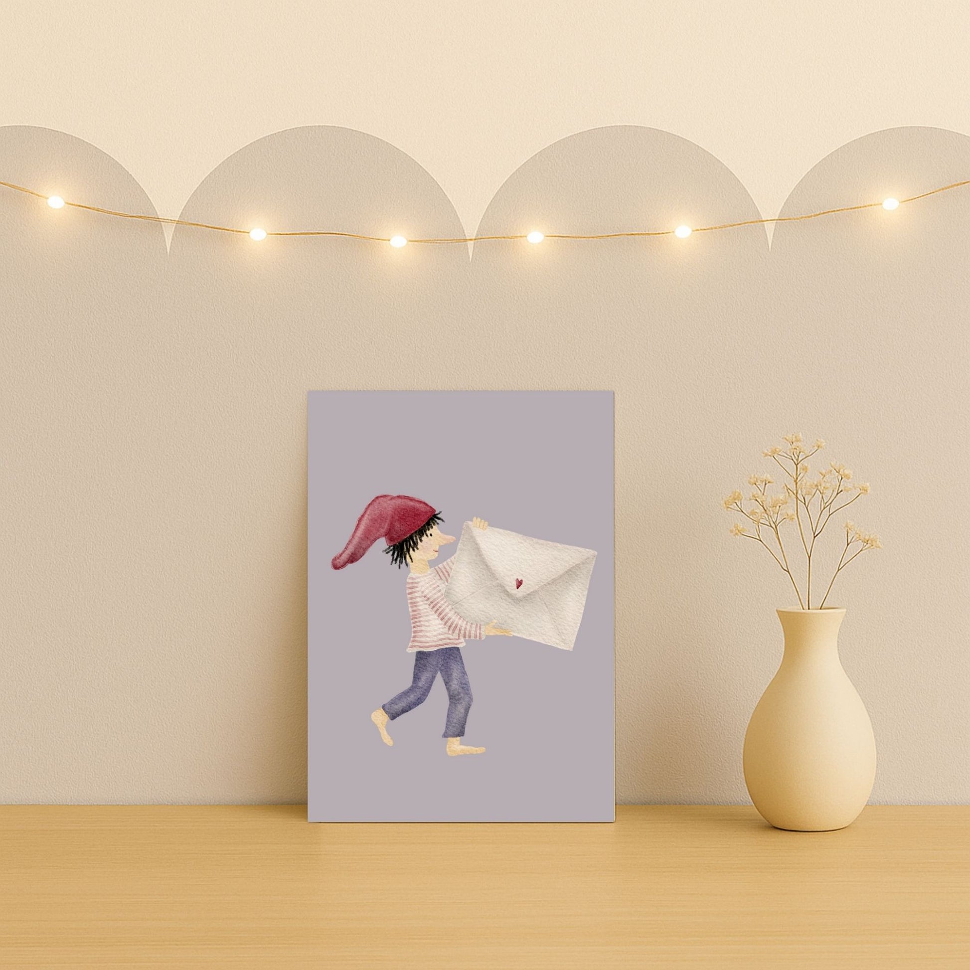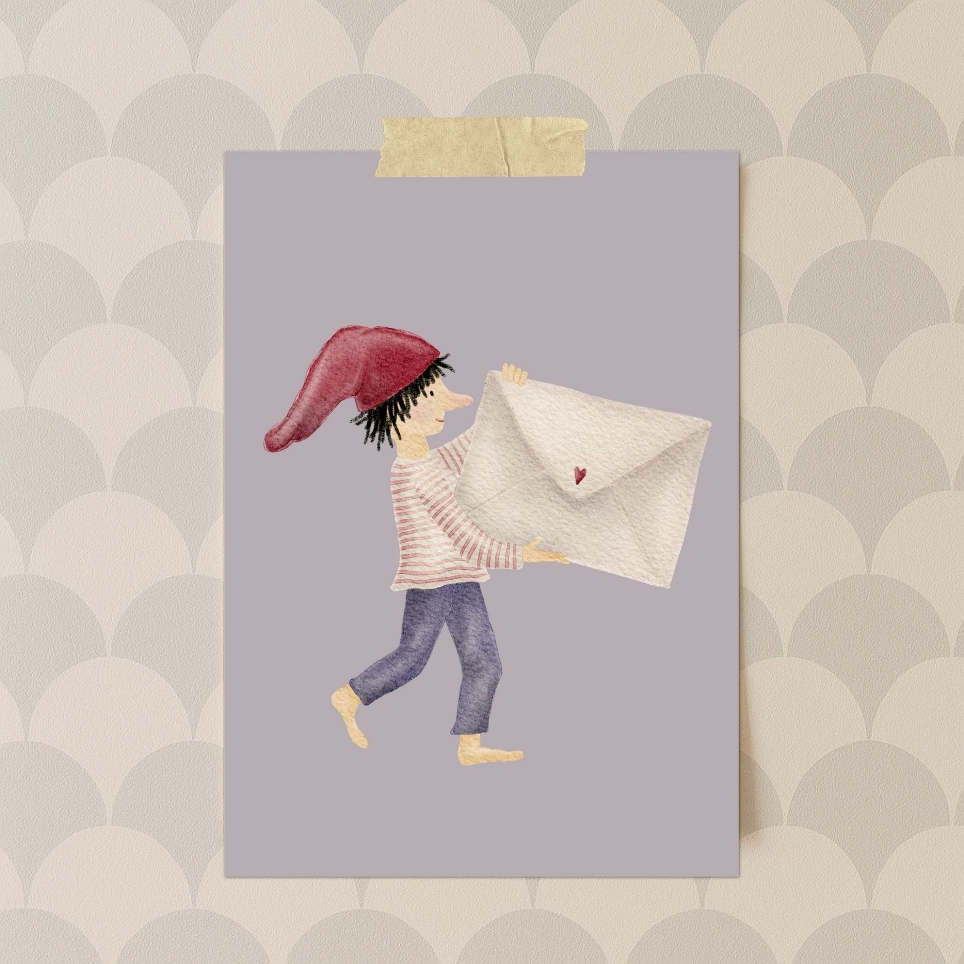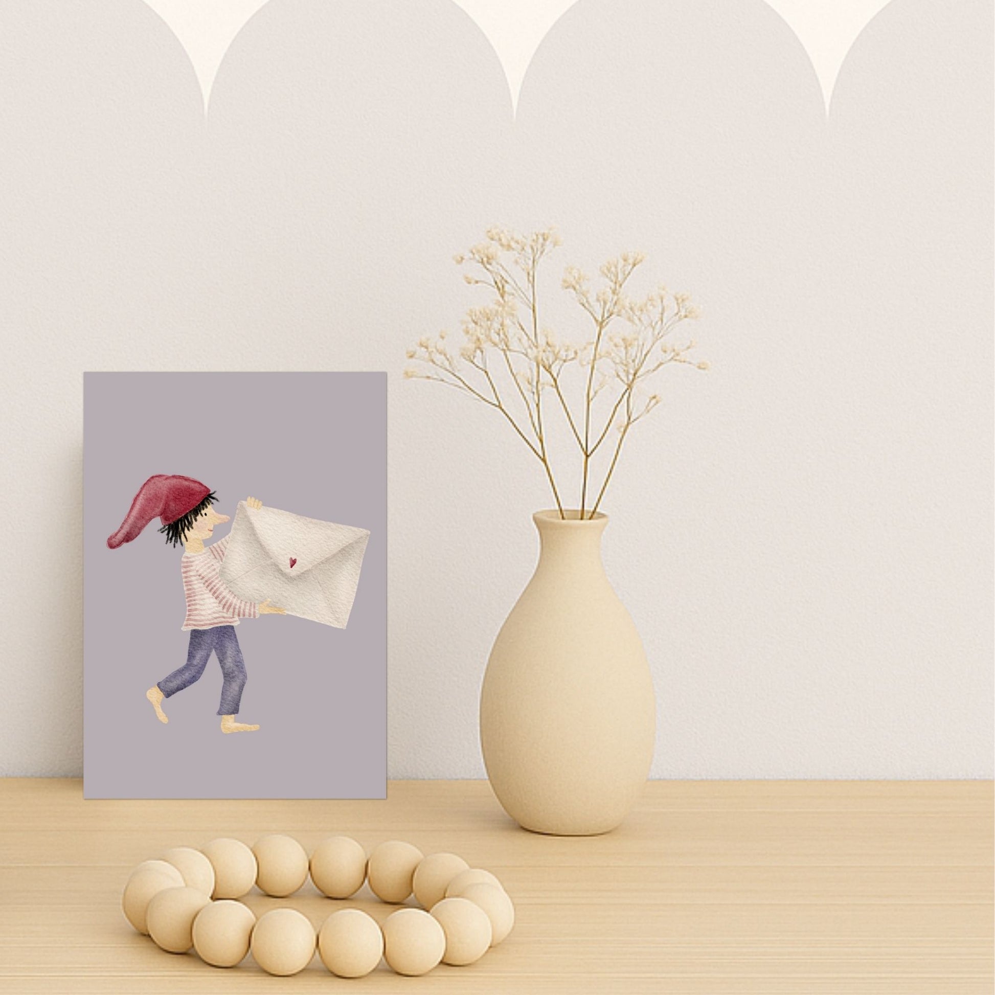 Ein kleiner Zwerg trägt stolz einen großen, schweren Briefumschlag – gefüllt mit guten Gedanken, warmen Worten und ein bisschen Zauber. Dieses Motiv erinnert daran, wie besonders es ist, echte Post zu verschicken, und lädt dazu ein, mit jeder Karte ein Stück Zwergenpost auf die Reise zu schicken – langsam, liebevoll und von Herzen.