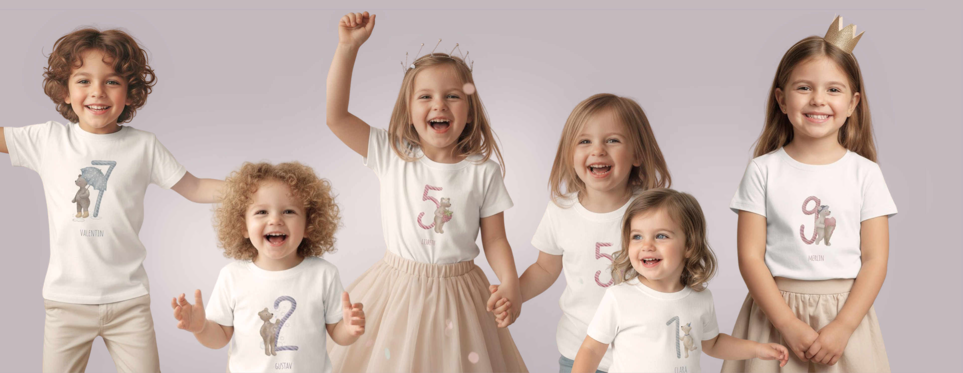 Unter der Zahl lässt sich das Shirt personalisieren – mit dem Namen des Kindes, einem Lieblingswort oder einer kleinen Botschaft. So entsteht ein ganz persönliches Kleidungsstück, das Erinnerungen trägt. (Lässt du das Feld leer, kommt das T-Shirt ganz pur zu dir: nur die Bären-Zahl, ohne zusätzlichen Text.)