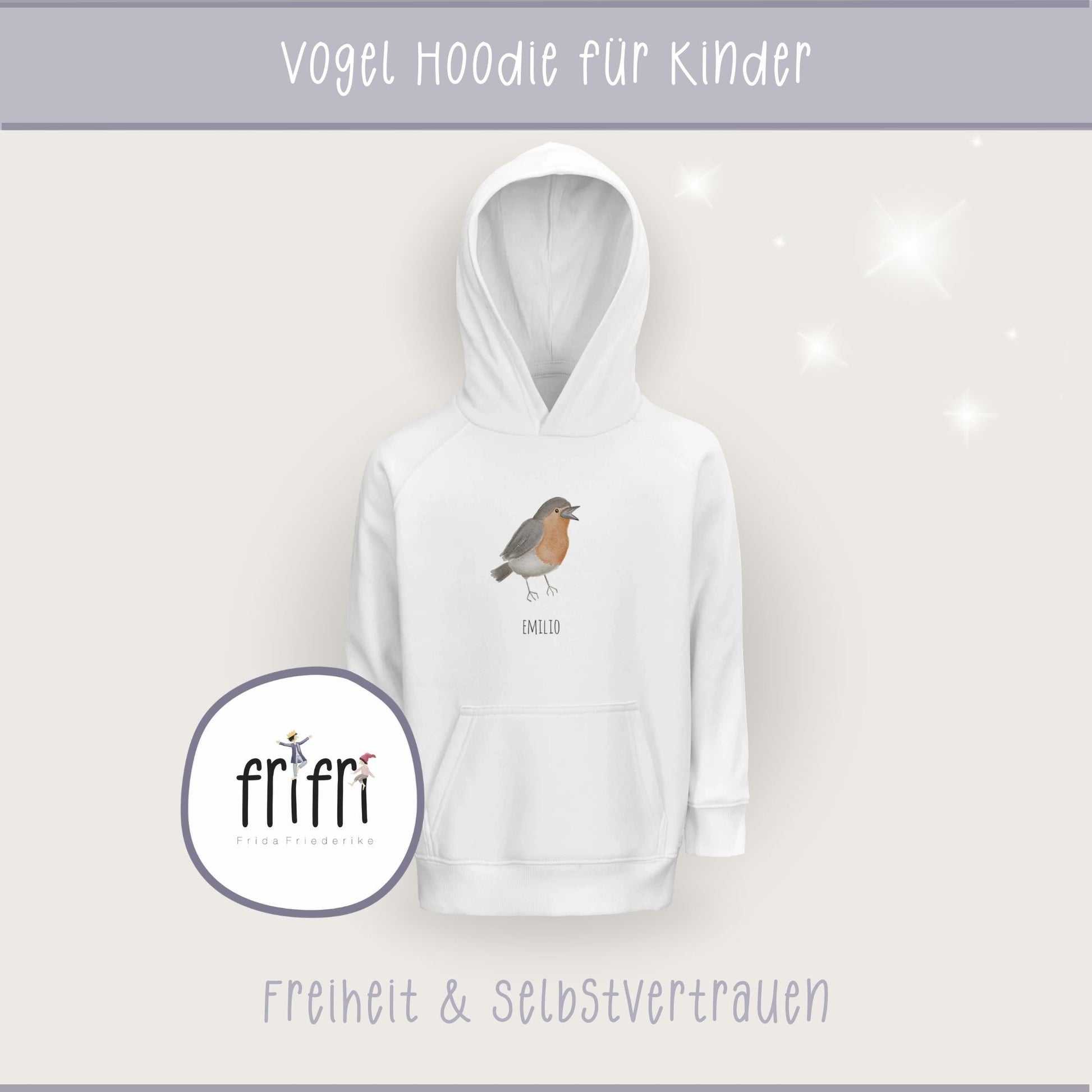 Der Name deines Kindes kann auf Wunsch ergänzt werden. Dezent und unaufdringlich. So wird aus dem freien Vogel ein persönlicher Begleiter.