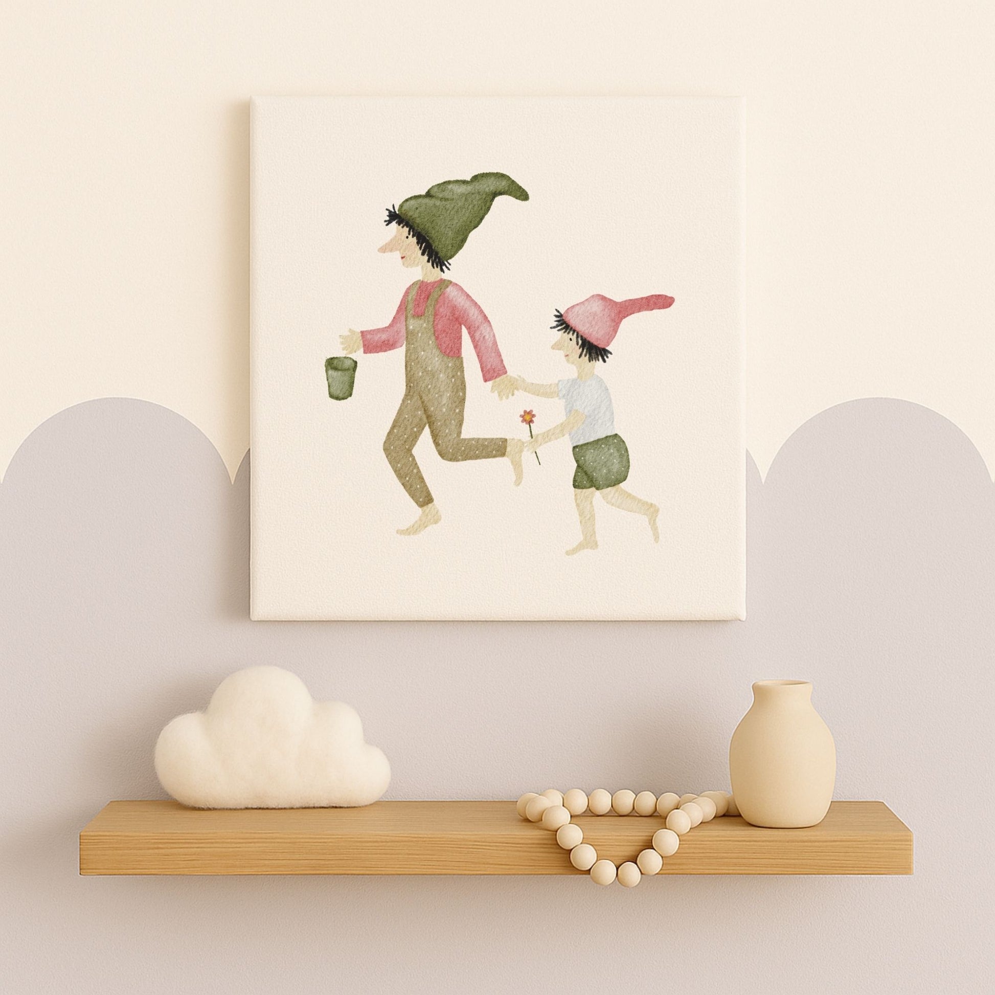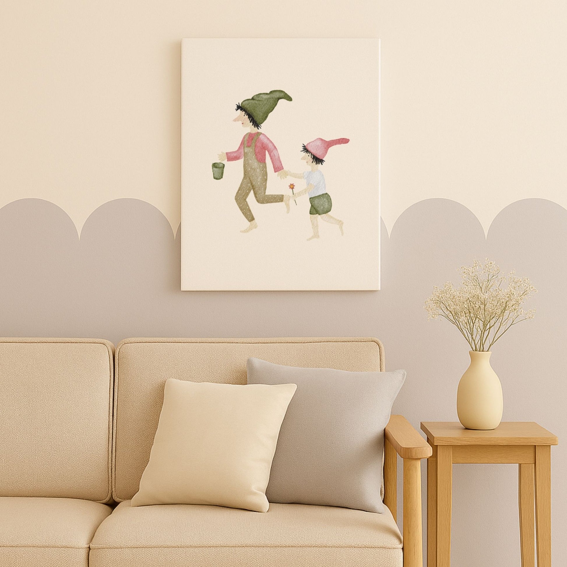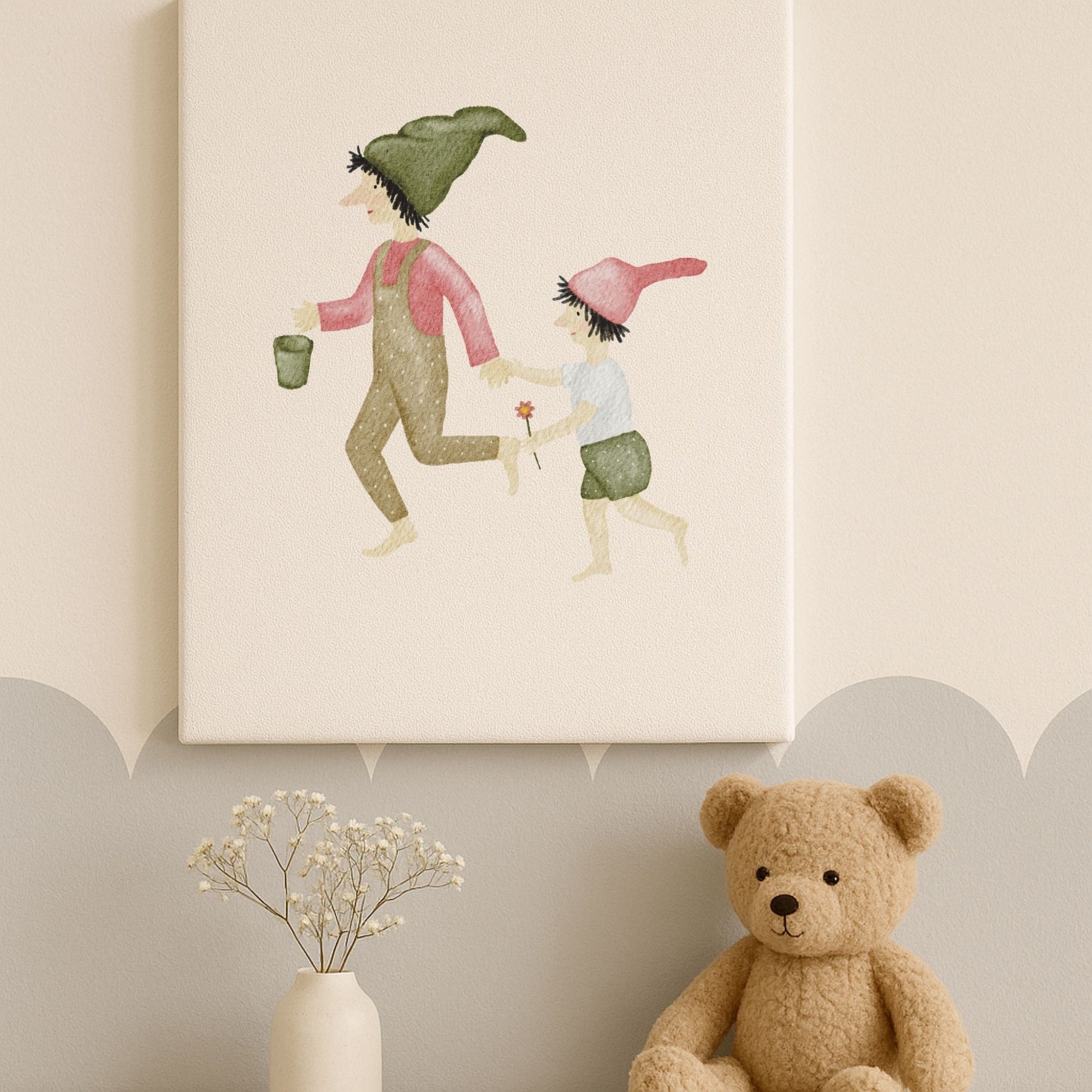 Als Wandbild auf Leinwand passt es wunderbar zu natürlichen Einrichtungen, zarten Farben und minimalistischen Kinderzimmern. So entsteht ein stimmiges Gesamtbild, das Geborgenheit, Fantasie und ein bisschen Zwergen-Zauber in euer Zuhause einziehen lässt – still, unaufdringlich und doch voller Charakter.