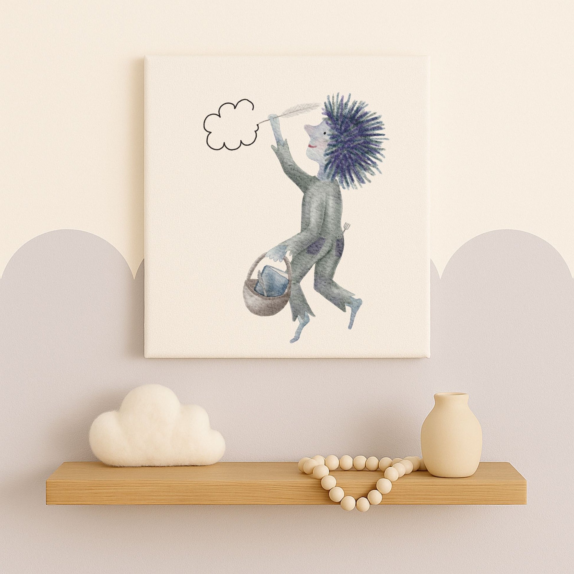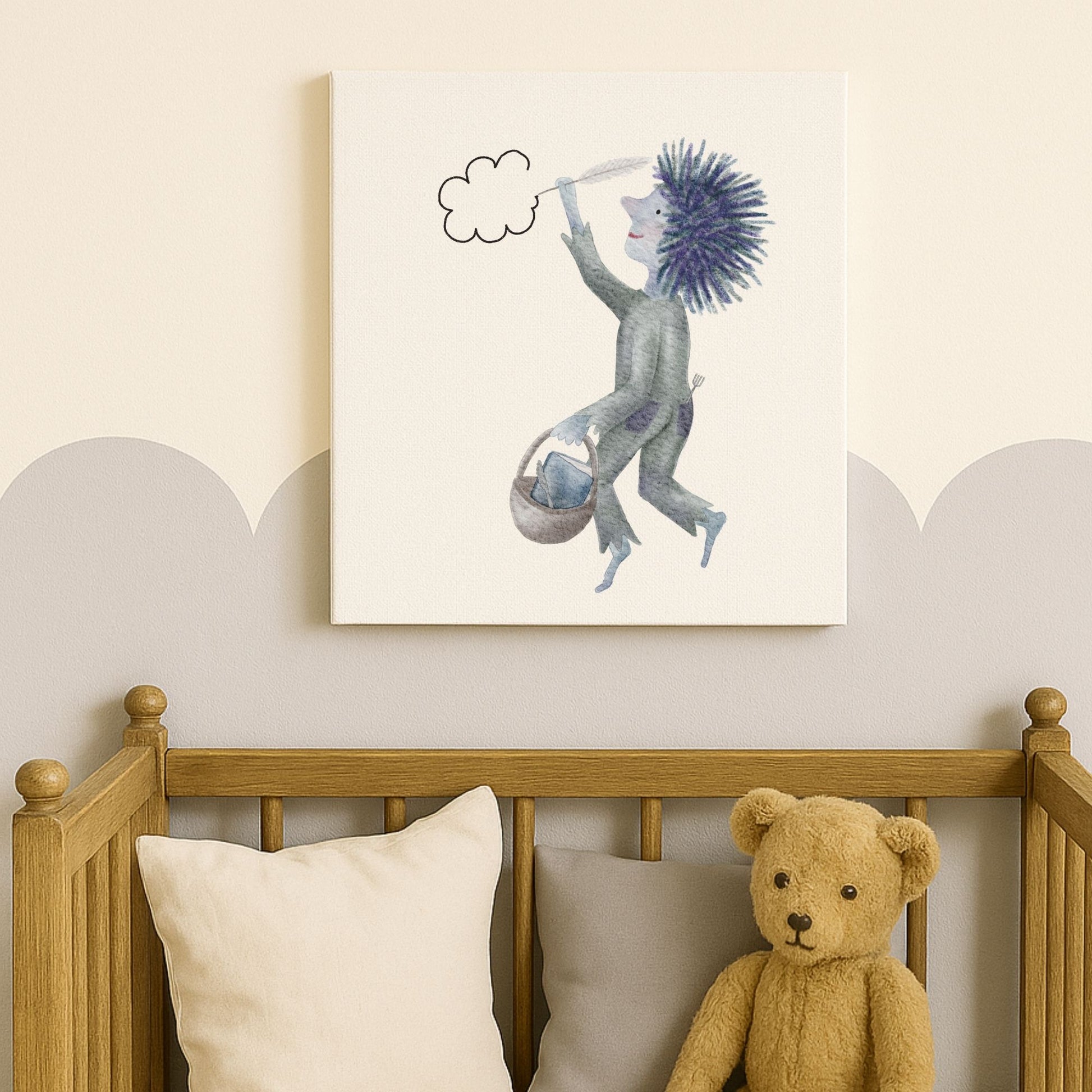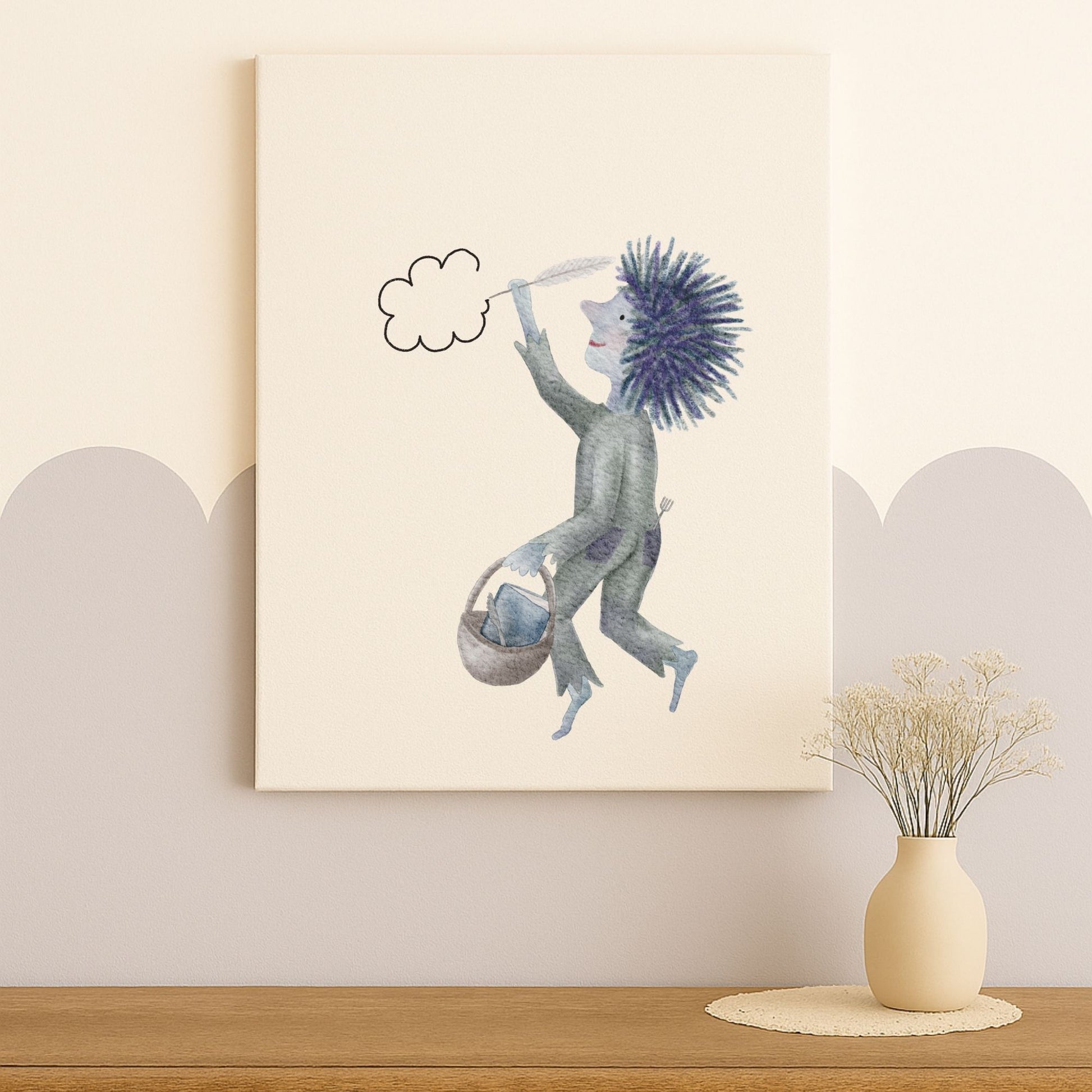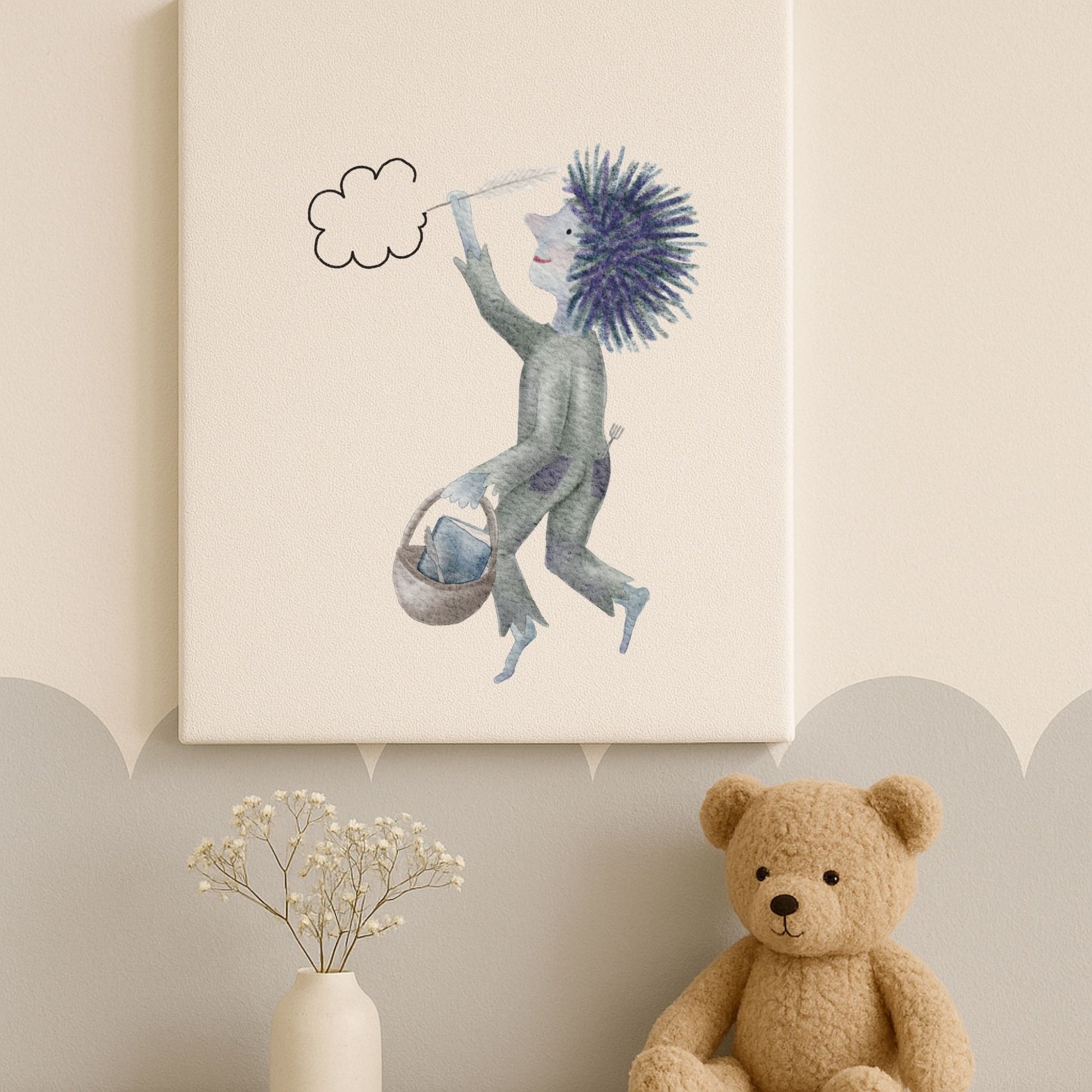 Als Wandbild auf Leinwand passt es wunderbar zu natürlichen Einrichtungen, zarten Farben und minimalistischen Kinderzimmern. So entsteht ein stimmiges Gesamtbild, das Geborgenheit, Fantasie und ein bisschen Zwergen-Zauber in euer Zuhause einziehen lässt – still, unaufdringlich und doch voller Charakter.