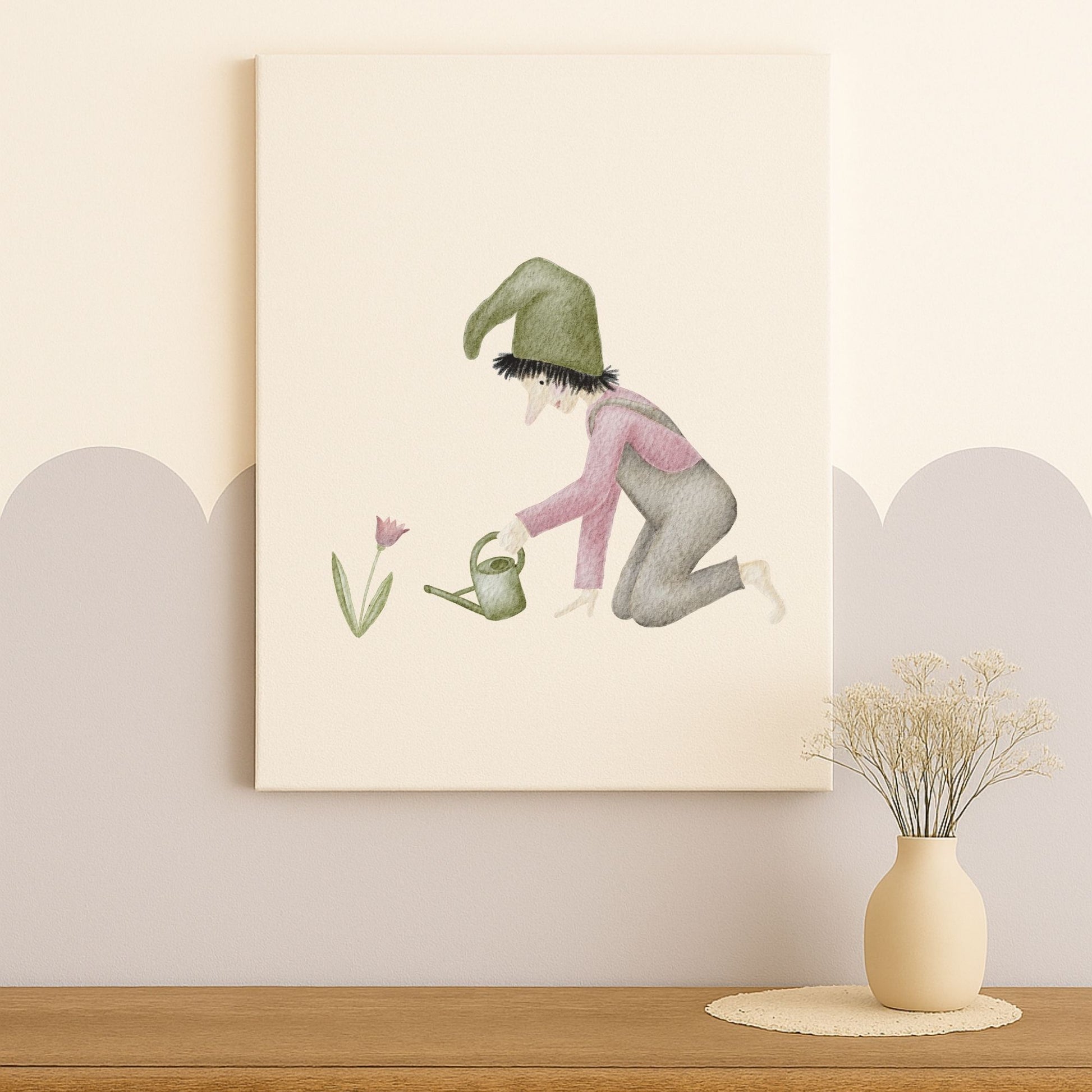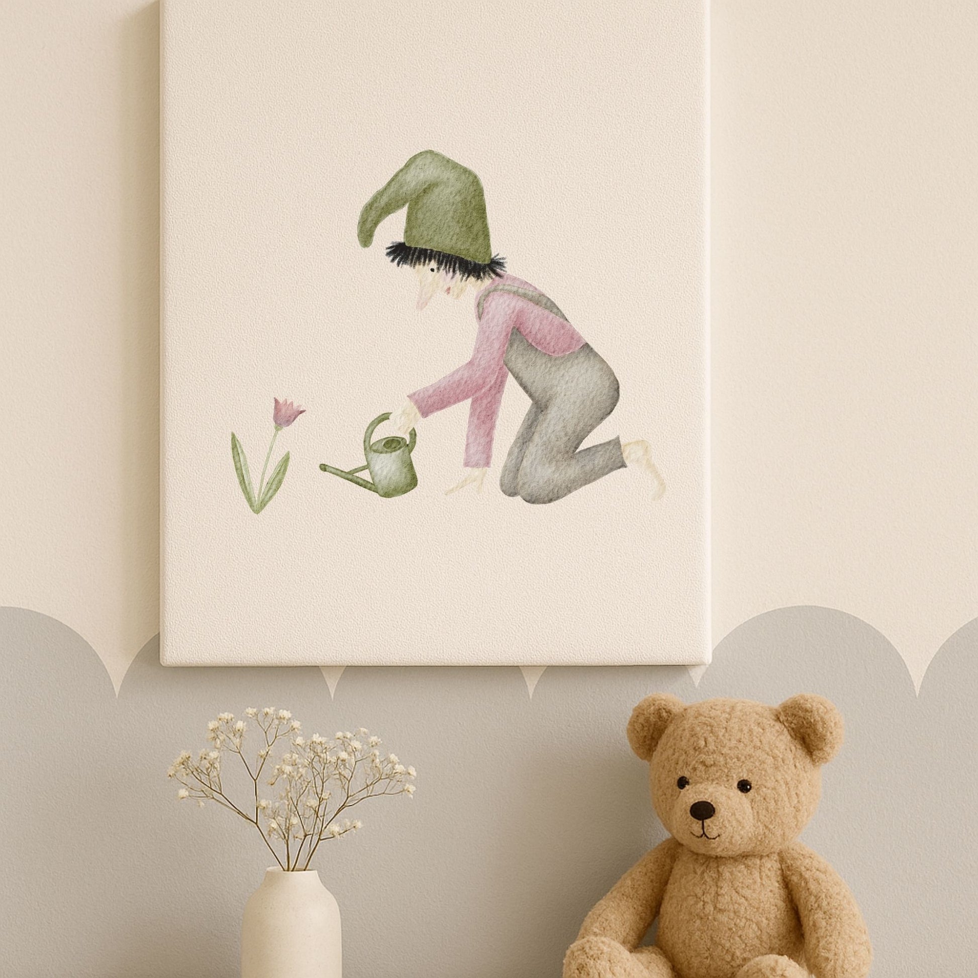 Ein kleiner Zwerg kniet behutsam im Garten und gießt mit einer winzigen Gießkanne zarte Tulpen – ein liebevolles Kinderzimmer-Poster, das Frühling, Achtsamkeit und Naturverbundenheit als sanftes Wandbild in euer Zuhause bringt. 🌷