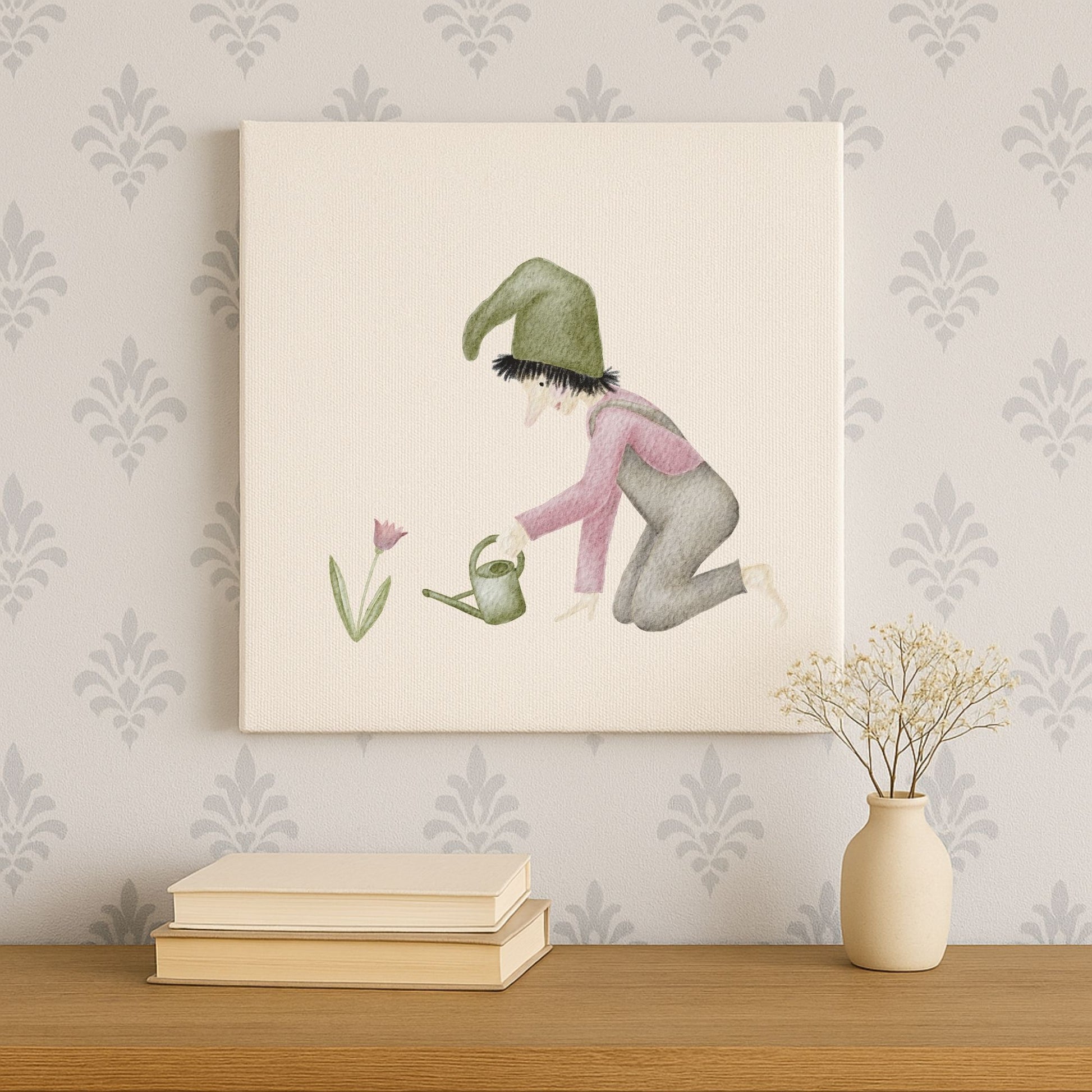 Als Wandbild auf Leinwand passt es wunderbar zu natürlichen Einrichtungen, zarten Farben und minimalistischen Kinderzimmern. So entsteht ein stimmiges Gesamtbild, das Geborgenheit, Fantasie und ein bisschen Zwergen-Zauber in euer Zuhause einziehen lässt – still, unaufdringlich und doch voller Charakter.