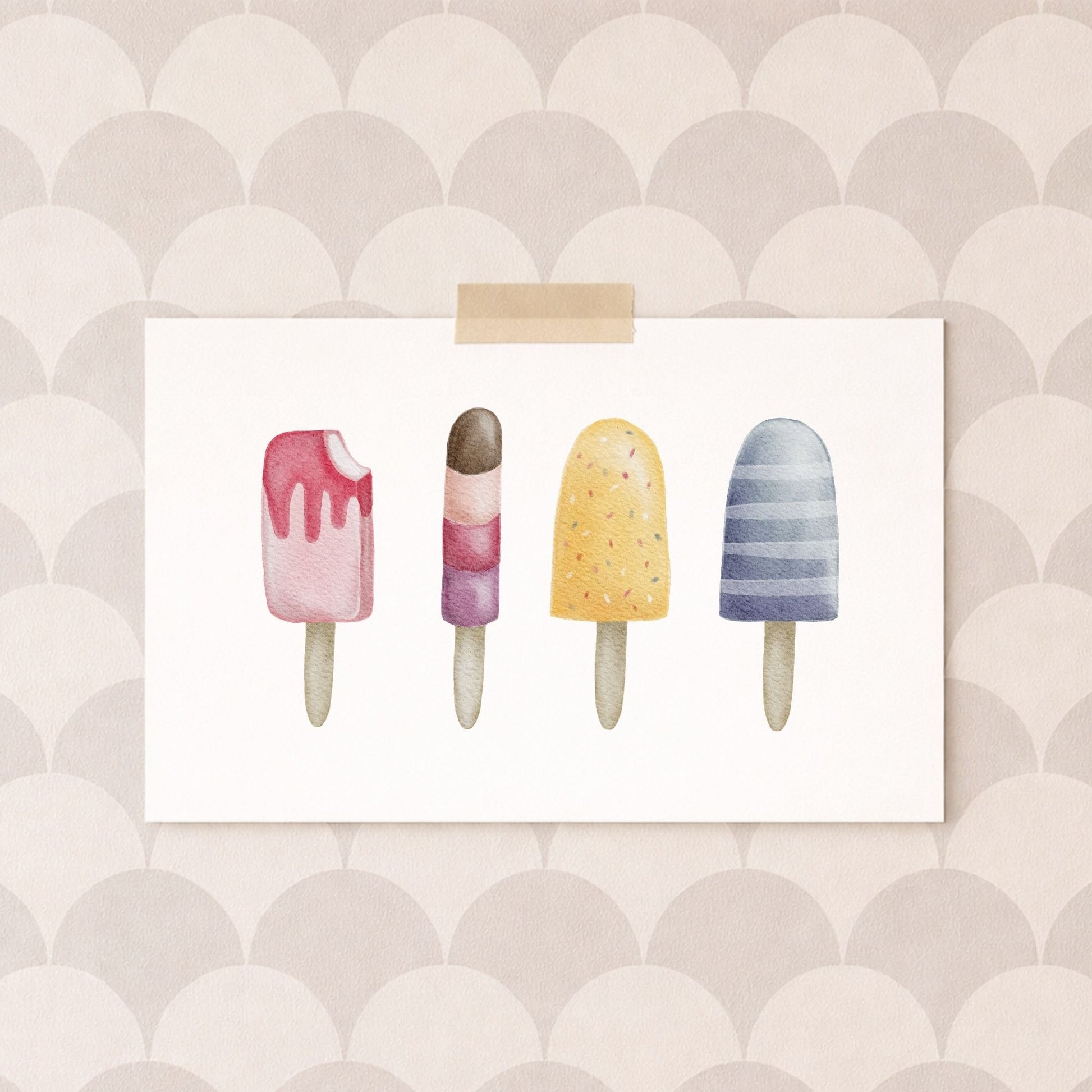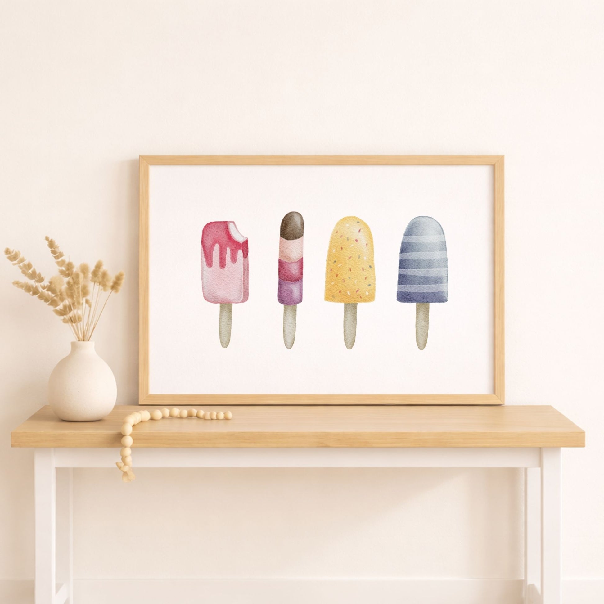 Vier Eis am Stiel stehen fröhlich nebeneinander, wie eine kleine Einladung zu Sommer, Leichtigkeit und Kinderlachen. Dieses handillustrierte „Eis am Stiel“-Poster bringt jeden Tag ein bisschen Eiscreme-Feeling in dein Zuhause – als farbenfrohes Wandbild für Küche, Kinderzimmer oder Flur, das euch mit seinen sommerlichen Farben und sanften Aquarell-Details immer wieder ein Lächeln ins Gesicht zaubert.