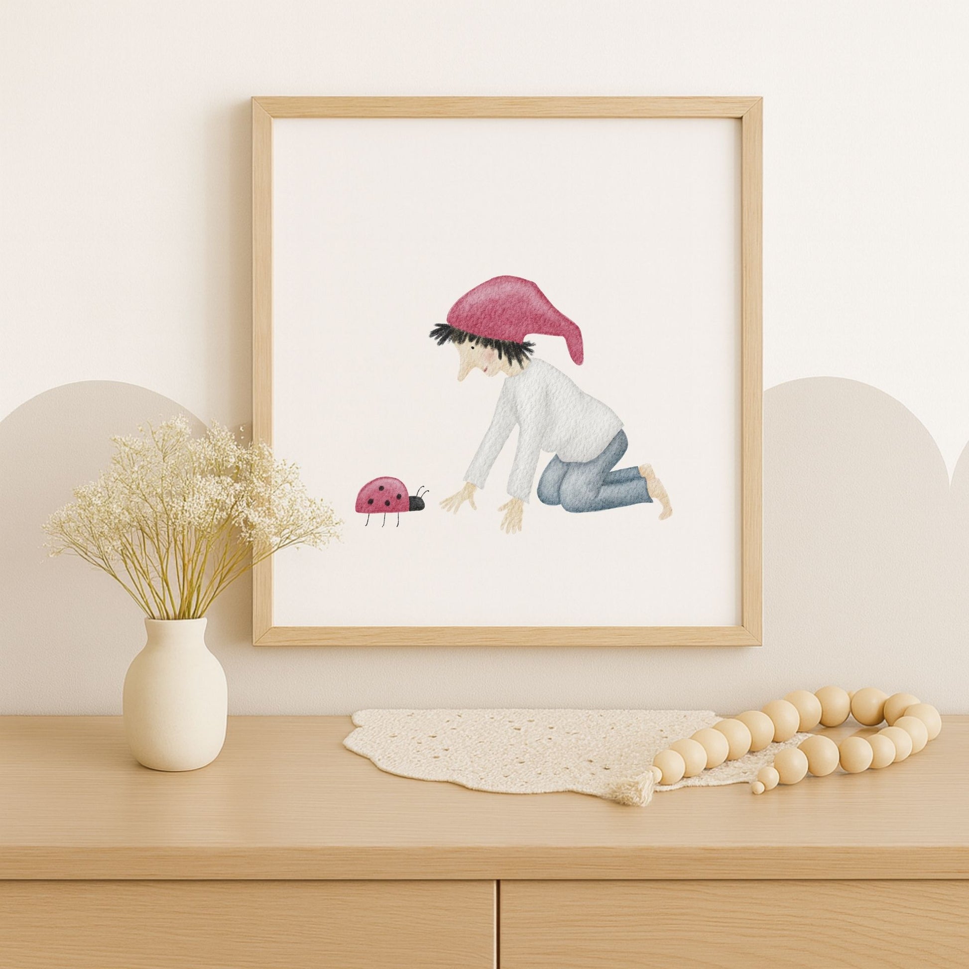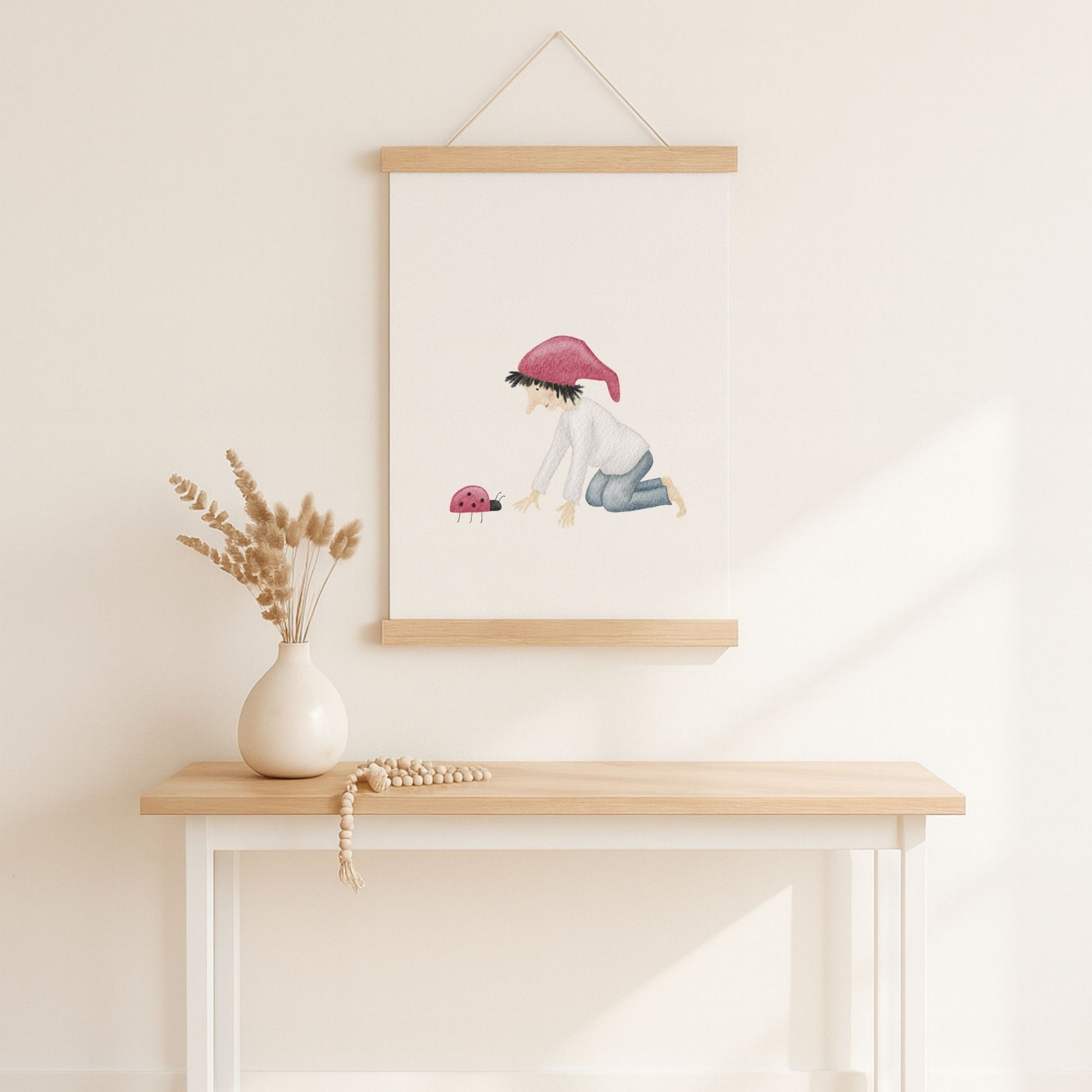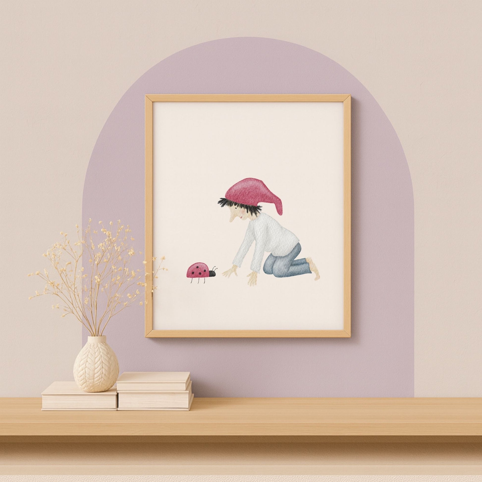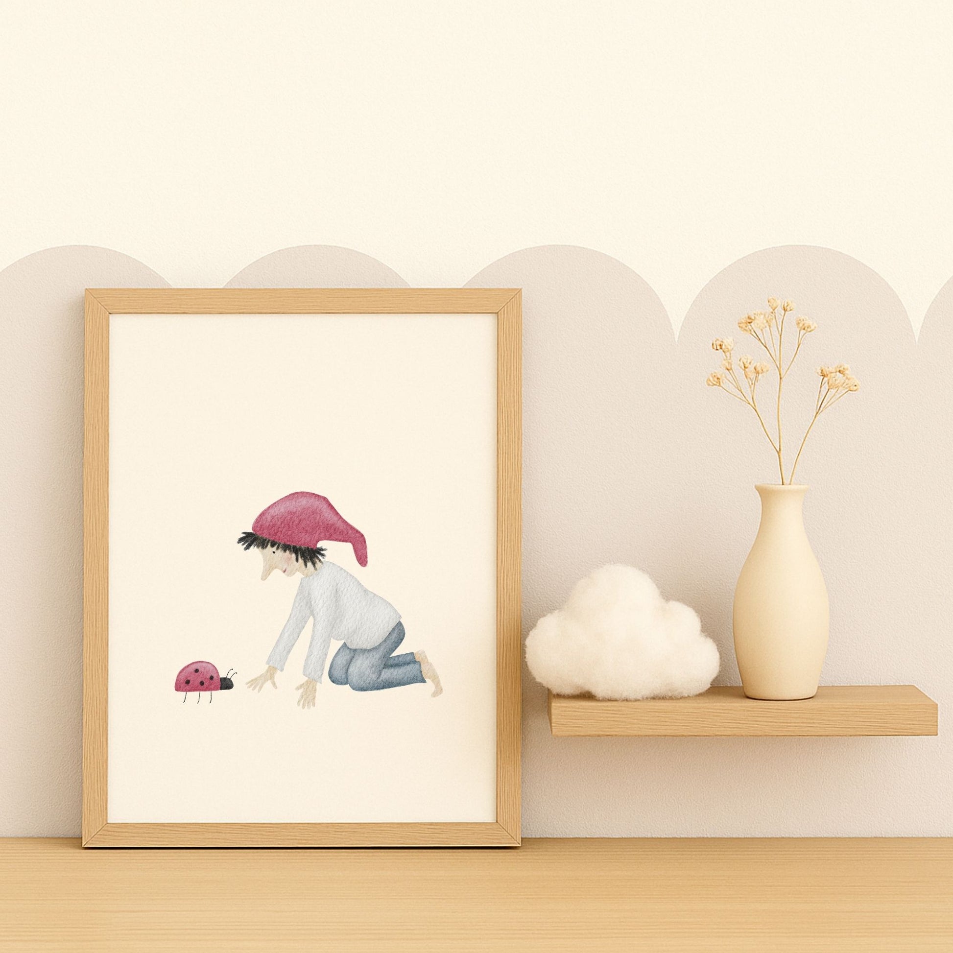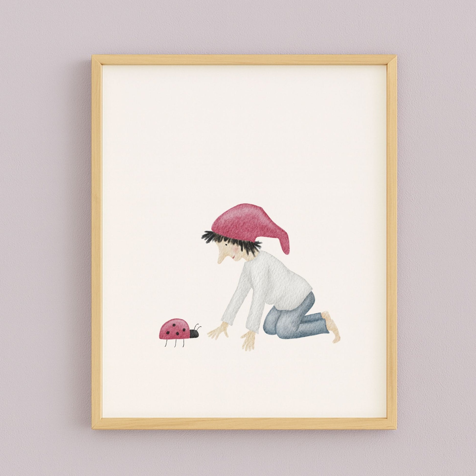Ein kleiner Glückszwerg kniet vor einem Marienkäfer und scheint sich leise mit ihm zu unterhalten – als würden sie gemeinsam ein kleines Geheimnis des Glücks hüten. Dieses zarte Kinderzimmer-Poster „Glückszwerg mit Marienkäfer“ bringt eine liebevolle, hoffnungsvolle Stimmung an deine Wand und erinnert euch im Alltag daran, die winzigen Glücksmomente zu sehen. Ein poetisches Wandbild für Kinderzimmer, Babyzimmer oder Flur, das Wärme, Naturverbundenheit und ein bisschen Magie in dein Zuhause einziehen lässt. 🐞