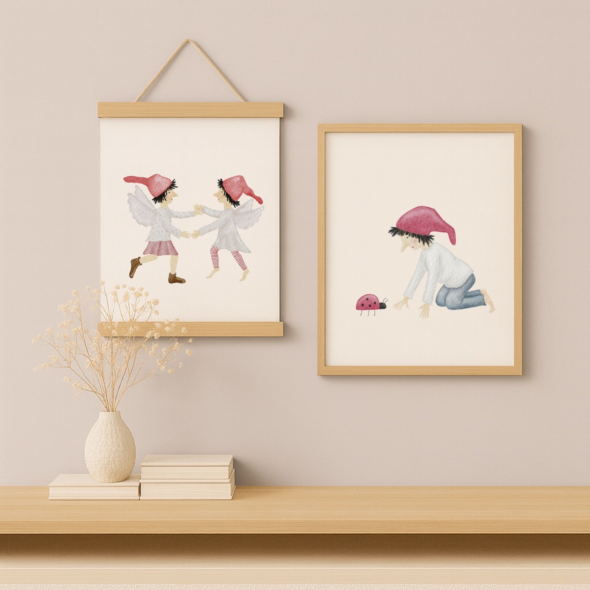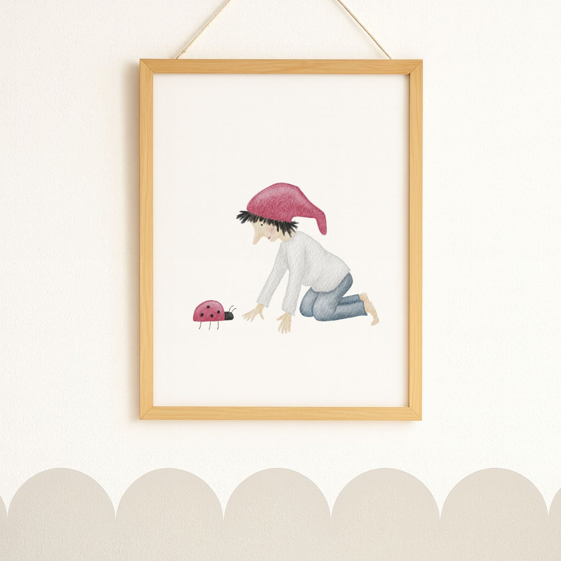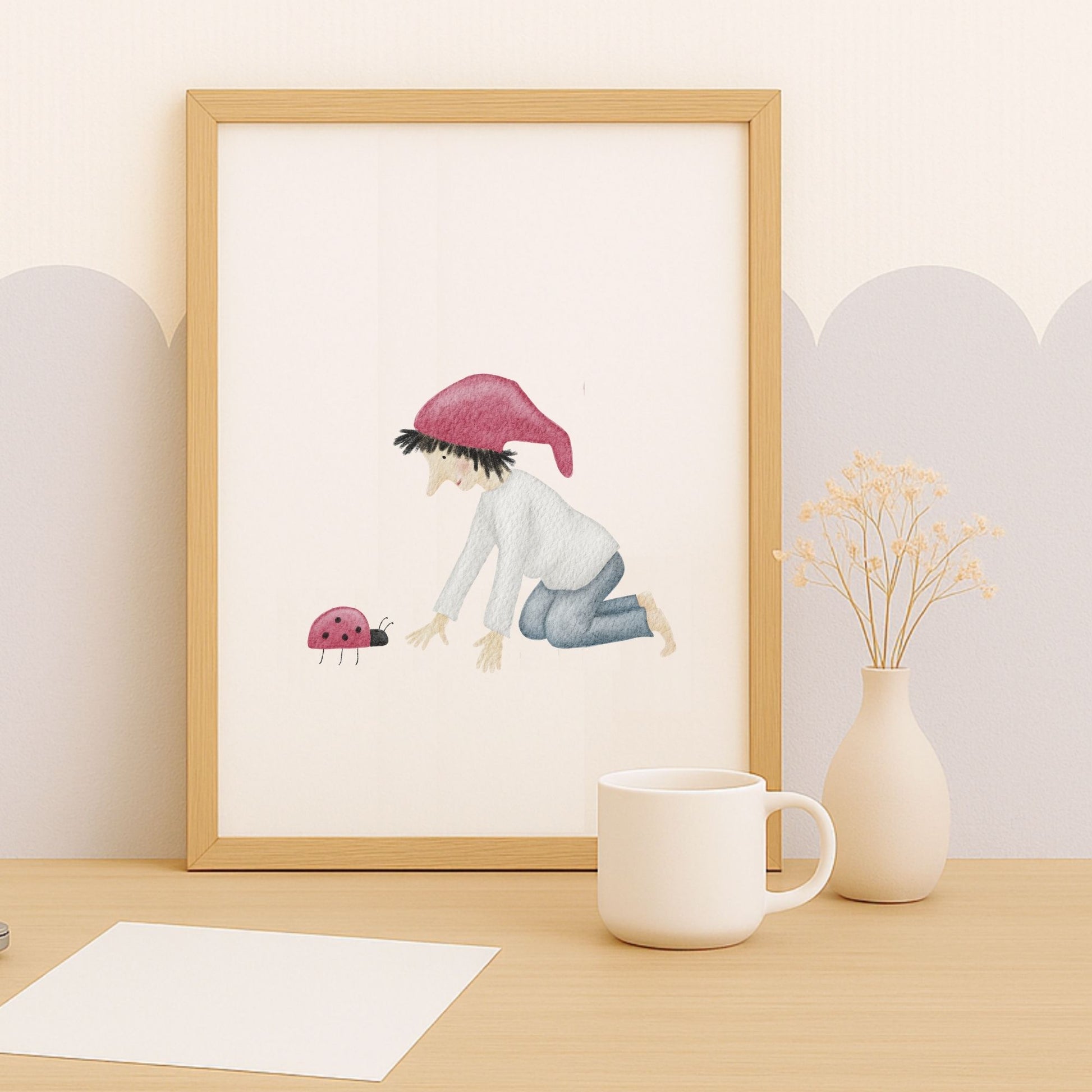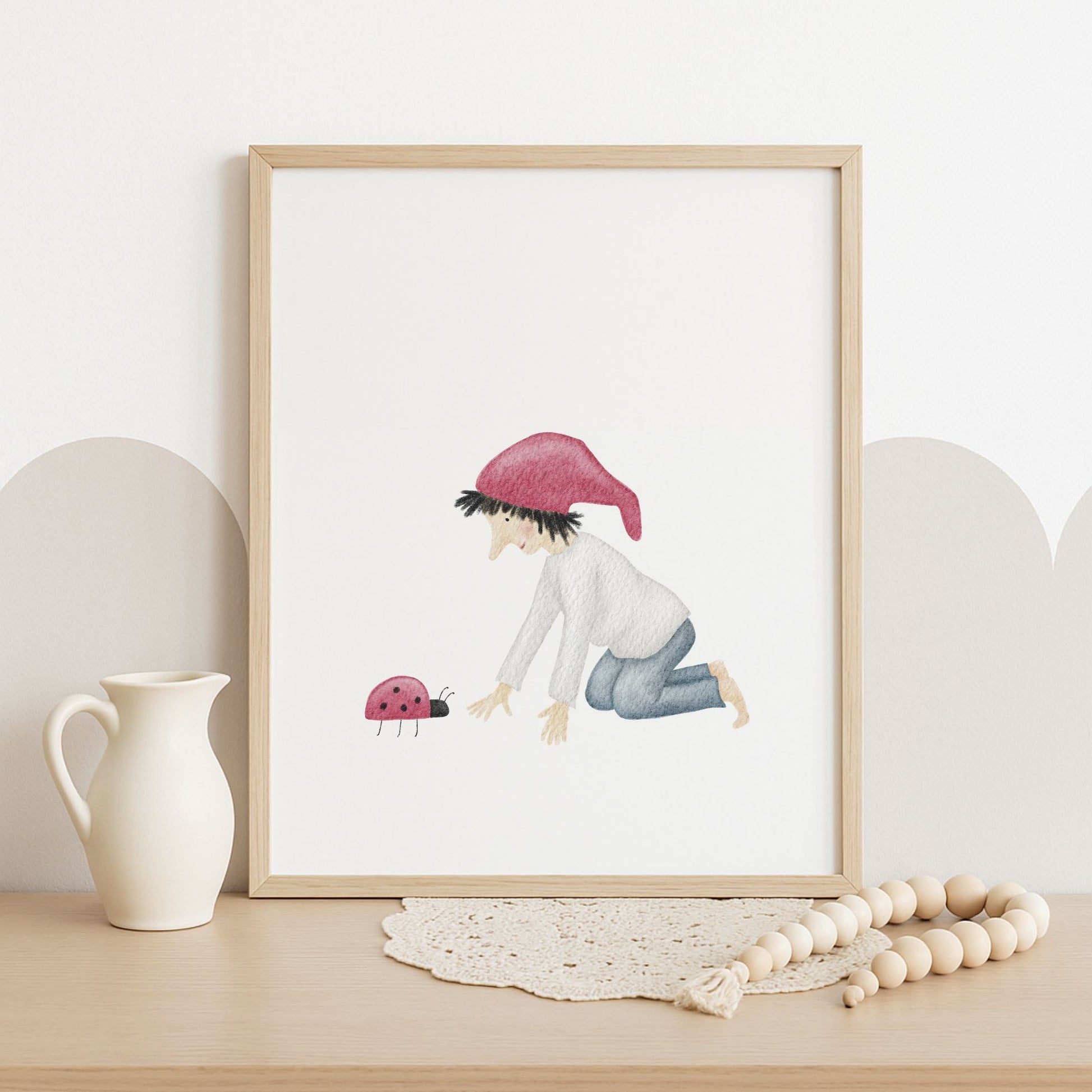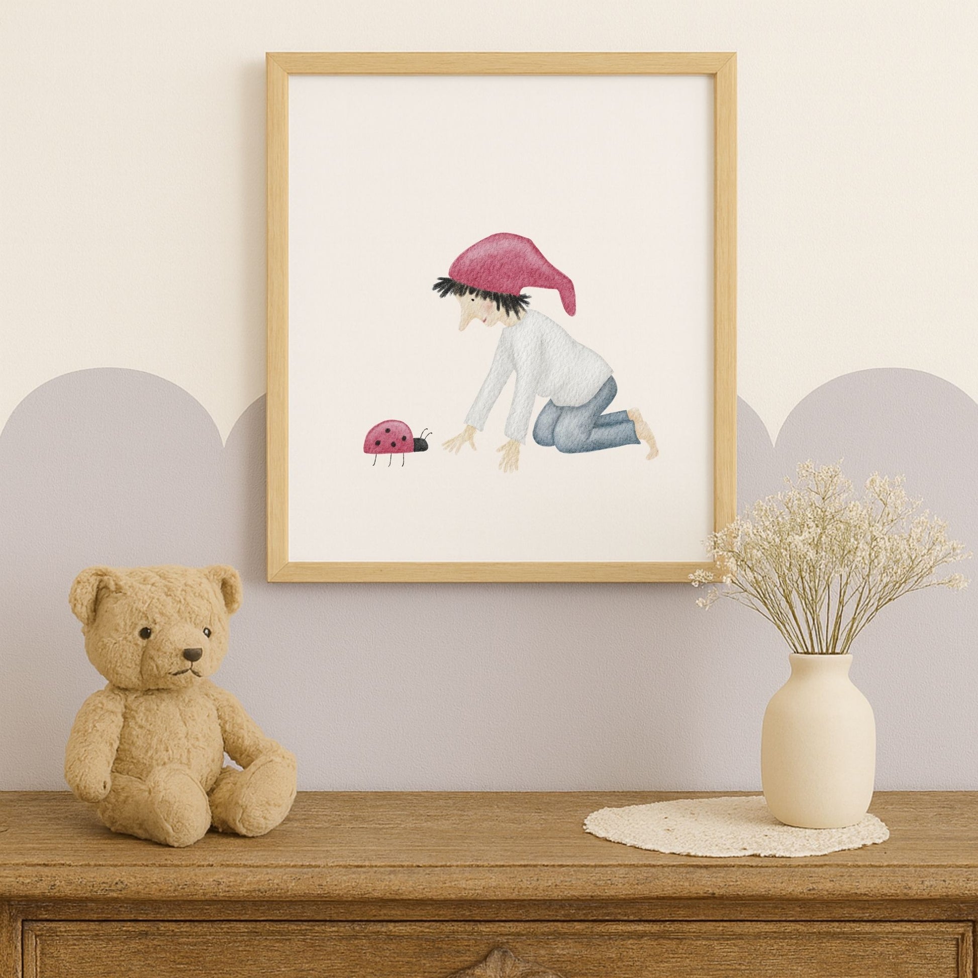 Ein kleiner Glückszwerg kniet vor einem Marienkäfer und scheint sich leise mit ihm zu unterhalten – als würden sie gemeinsam ein kleines Geheimnis des Glücks hüten. Dieses zarte Kinderzimmer-Poster „Glückszwerg mit Marienkäfer“ bringt eine liebevolle, hoffnungsvolle Stimmung an deine Wand und erinnert euch im Alltag daran, die winzigen Glücksmomente zu sehen. Ein poetisches Wandbild für Kinderzimmer, Babyzimmer oder Flur, das Wärme, Naturverbundenheit und ein bisschen Magie in dein Zuhause einziehen lässt. 🐞