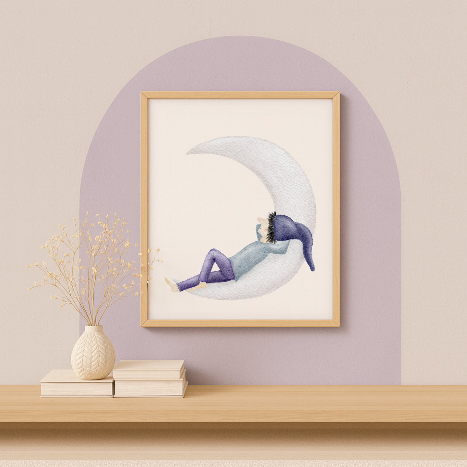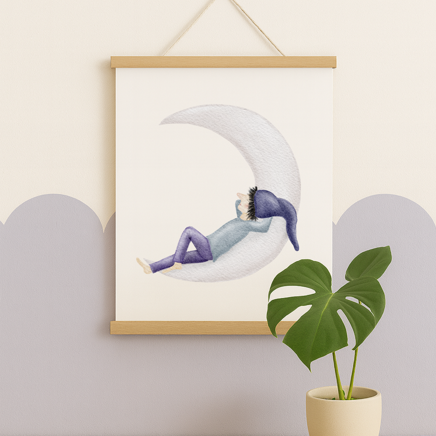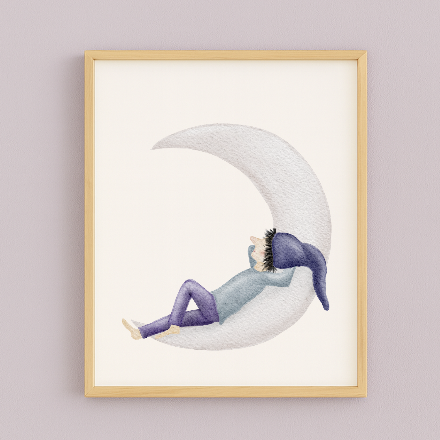 Ein kleiner Zwerg mit lilafarbener Hose und Zipfelmütze ruht auf einer schmalen Mondsichel, als würde die Zeit für einen Moment stillstehen. Dieses sanfte Kinderzimmer-Poster bringt eine leise, märchenhafte Traumstimmung an deine Wand – ein liebevolles Mondmotiv, das zum Durchatmen, Träumen und Kuscheln einlädt. 🌙