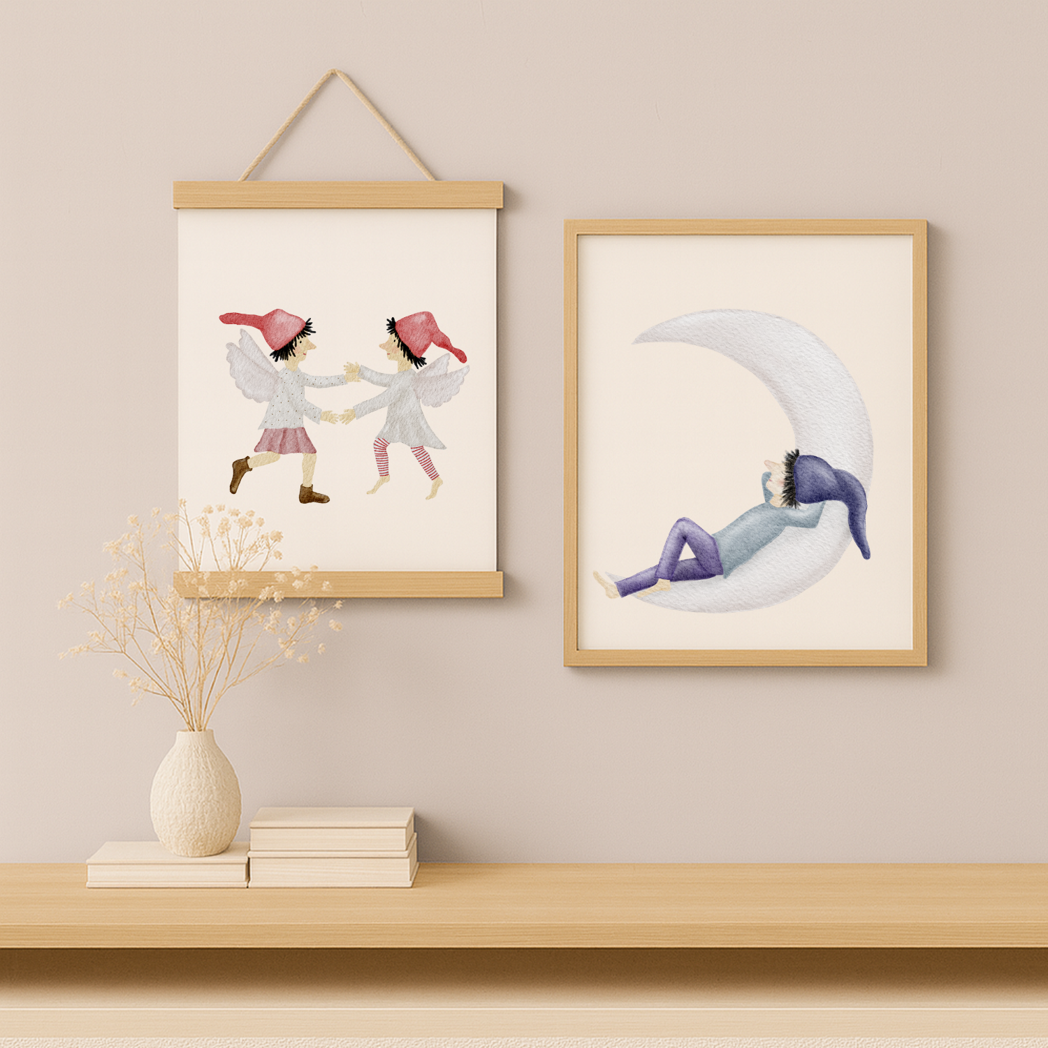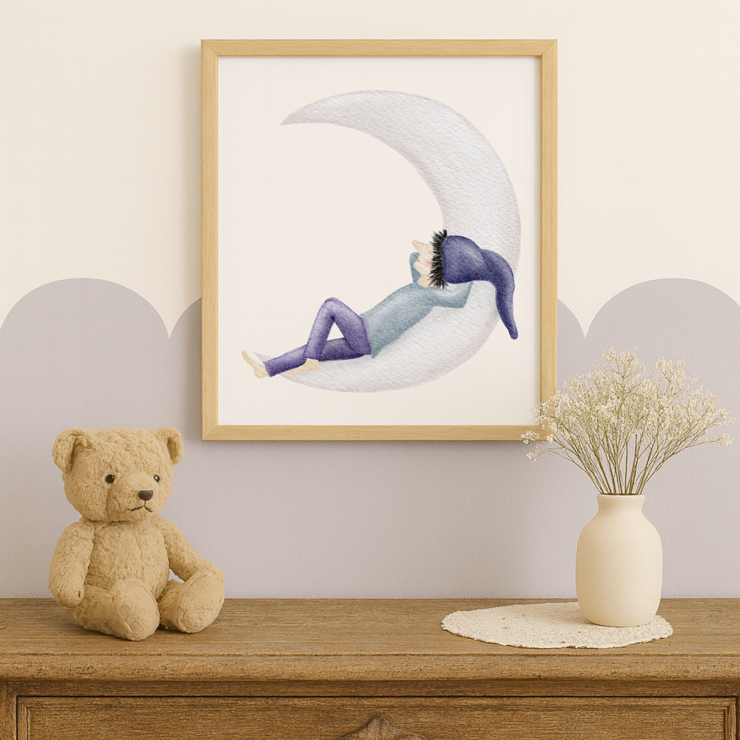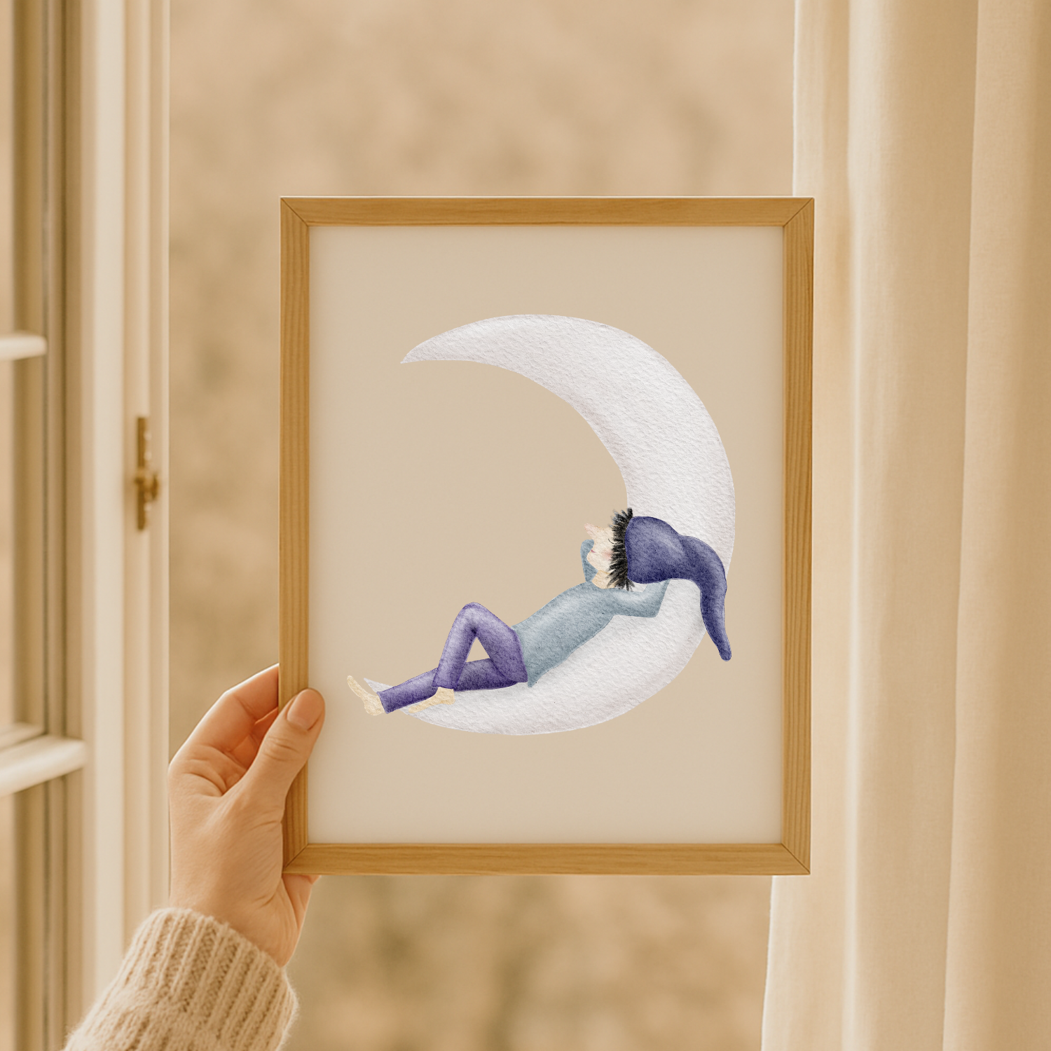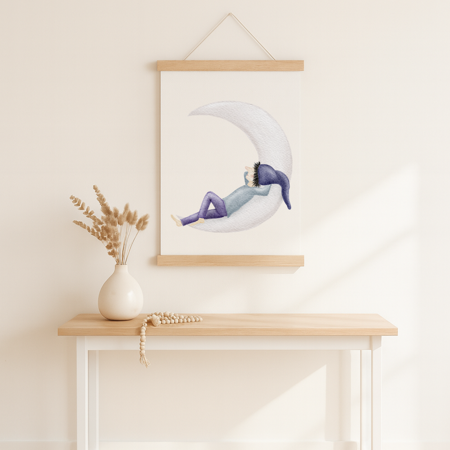 Ein kleiner Zwerg mit lilafarbener Hose und Zipfelmütze ruht auf einer schmalen Mondsichel, als würde die Zeit für einen Moment stillstehen. Dieses sanfte Kinderzimmer-Poster bringt eine leise, märchenhafte Traumstimmung an deine Wand – ein liebevolles Mondmotiv, das zum Durchatmen, Träumen und Kuscheln einlädt. 🌙