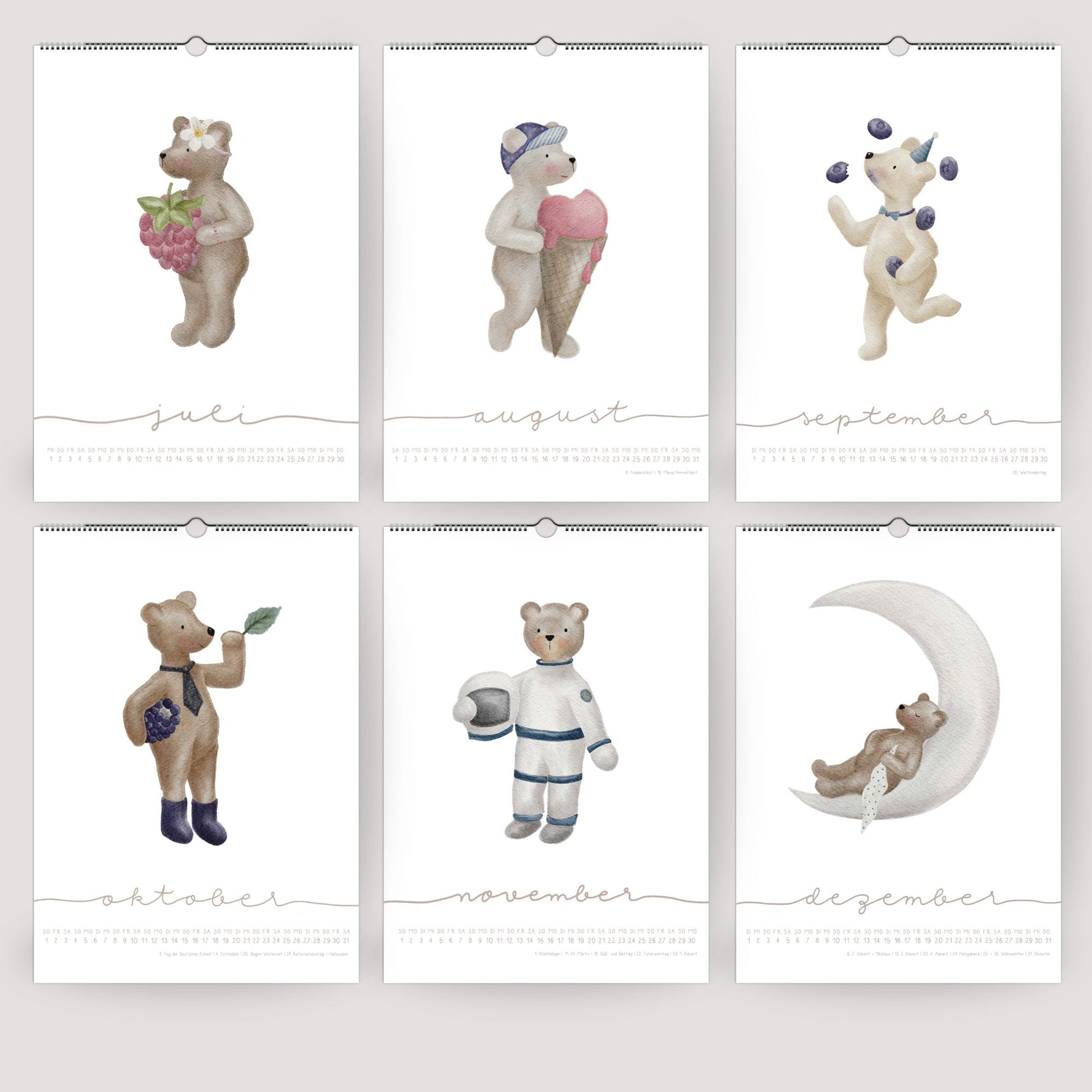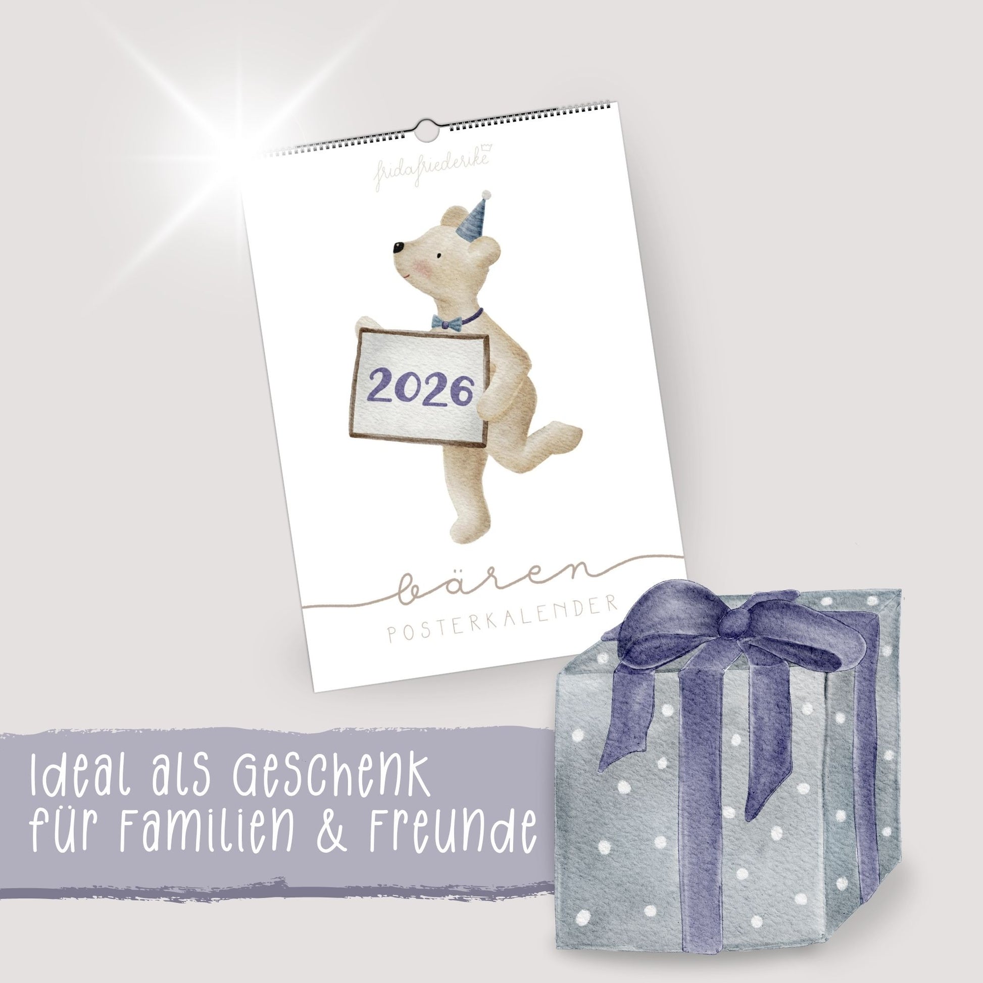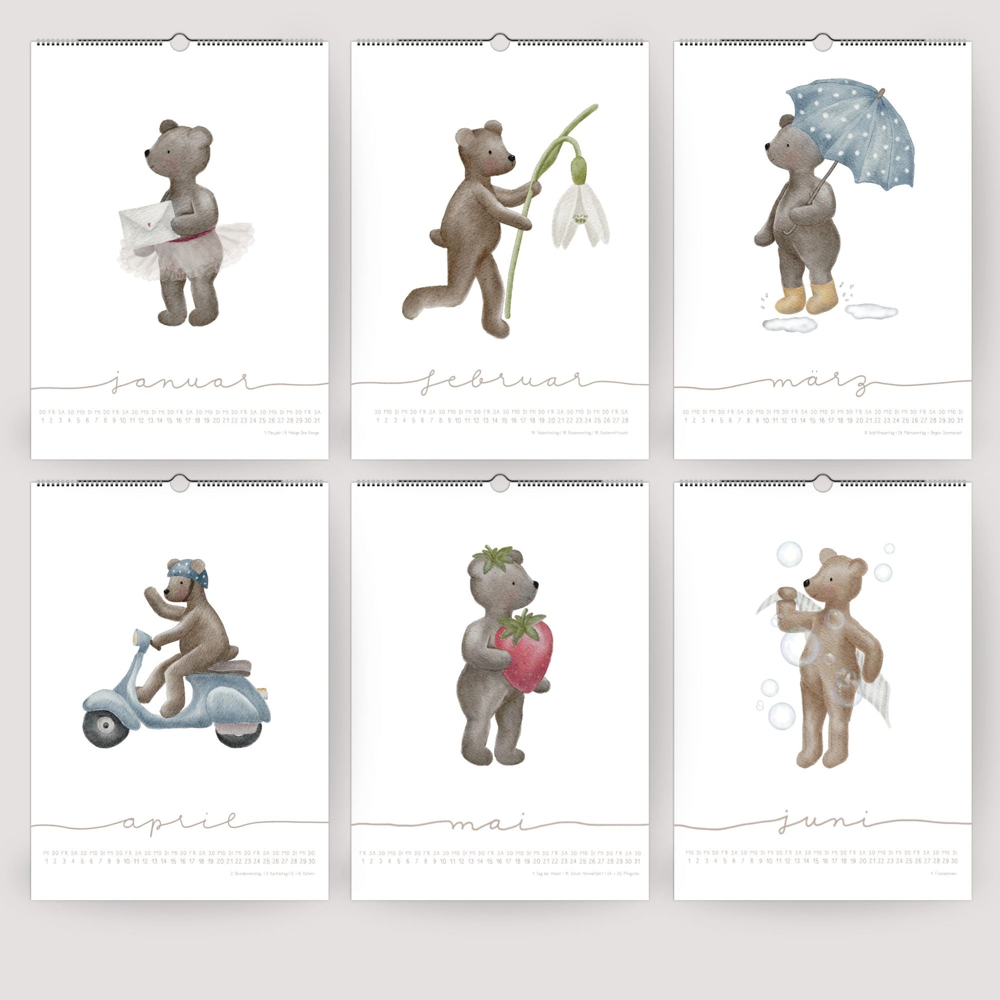 Unser Bären-Posterkalender ist mehr als nur ein Kalender – er ist ein liebevoll illustriertes Kunstwerk für deine Wand. Jeden Monat begleitet dich ein anderer ganz besonderer Bär: Vom Erd-Bär mit saftiger Erdbeere über den Wasch-Bär mit Seifenblasen bis zum Brum-Bär auf seiner hellblauen Vespa. Eine verspielte Wortreise durch das Bärenjahr, die Groß und Klein gleichermaßen begeistert.