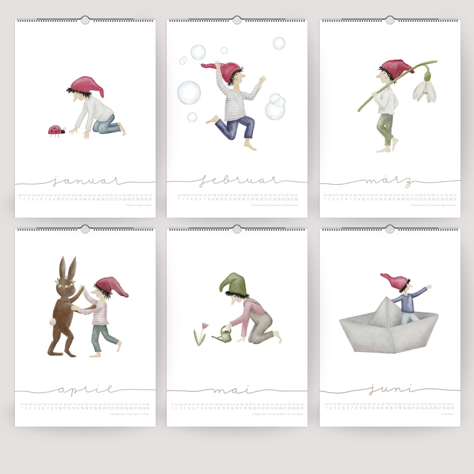 Unser handillustrierter Zwergen-Posterkalender entführt dich Monat für Monat in eine zauberhafte Welt voller kleiner Wunder. Für jeden Monat gibt es ein einzigartiges Zwergenmotiv – passend zur Jahreszeit, voller Poesie und Wärme. Ob ein Zwerg mit Glückskäfer zum Jahresbeginn, einer mit Eis in der Sommersonne, im Heißluftballon durch den Herbsthimmel oder schlafend auf der Sichel des Wintermondes – jeder Zwerg erzählt seine eigene kleine Geschichte.