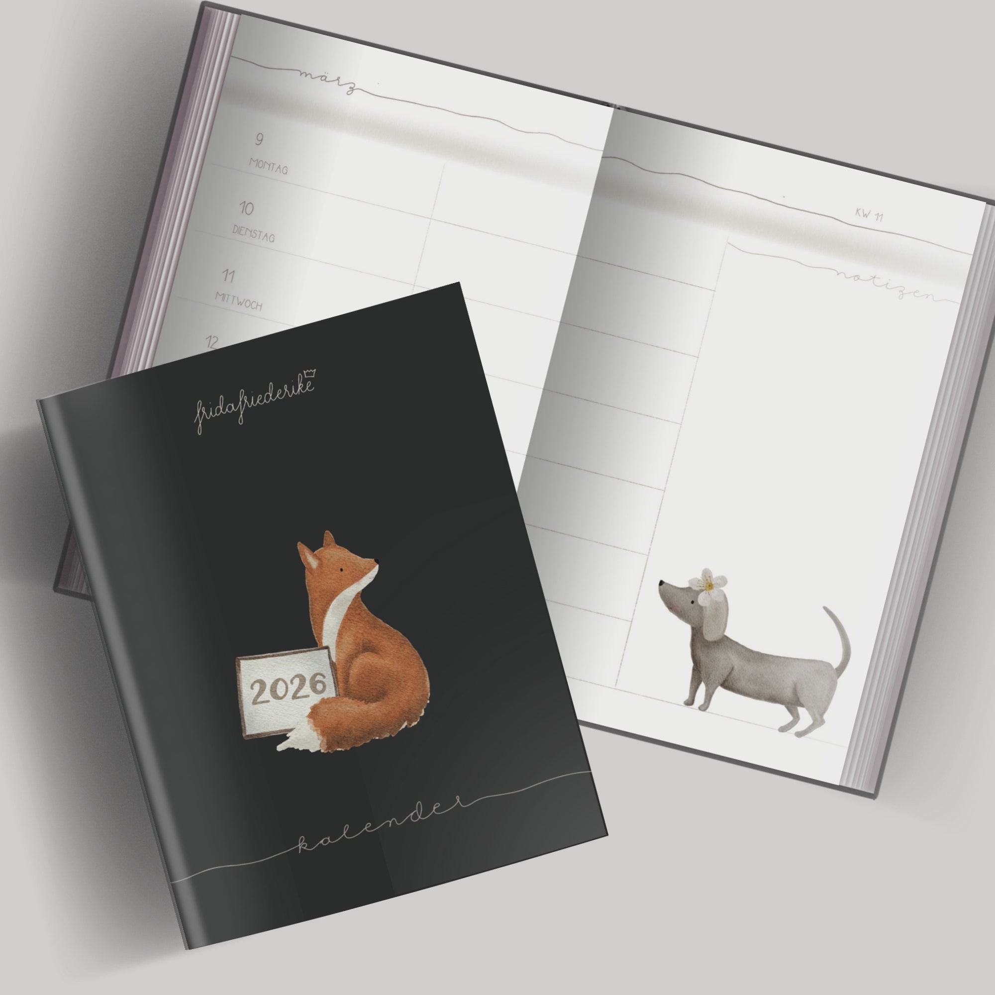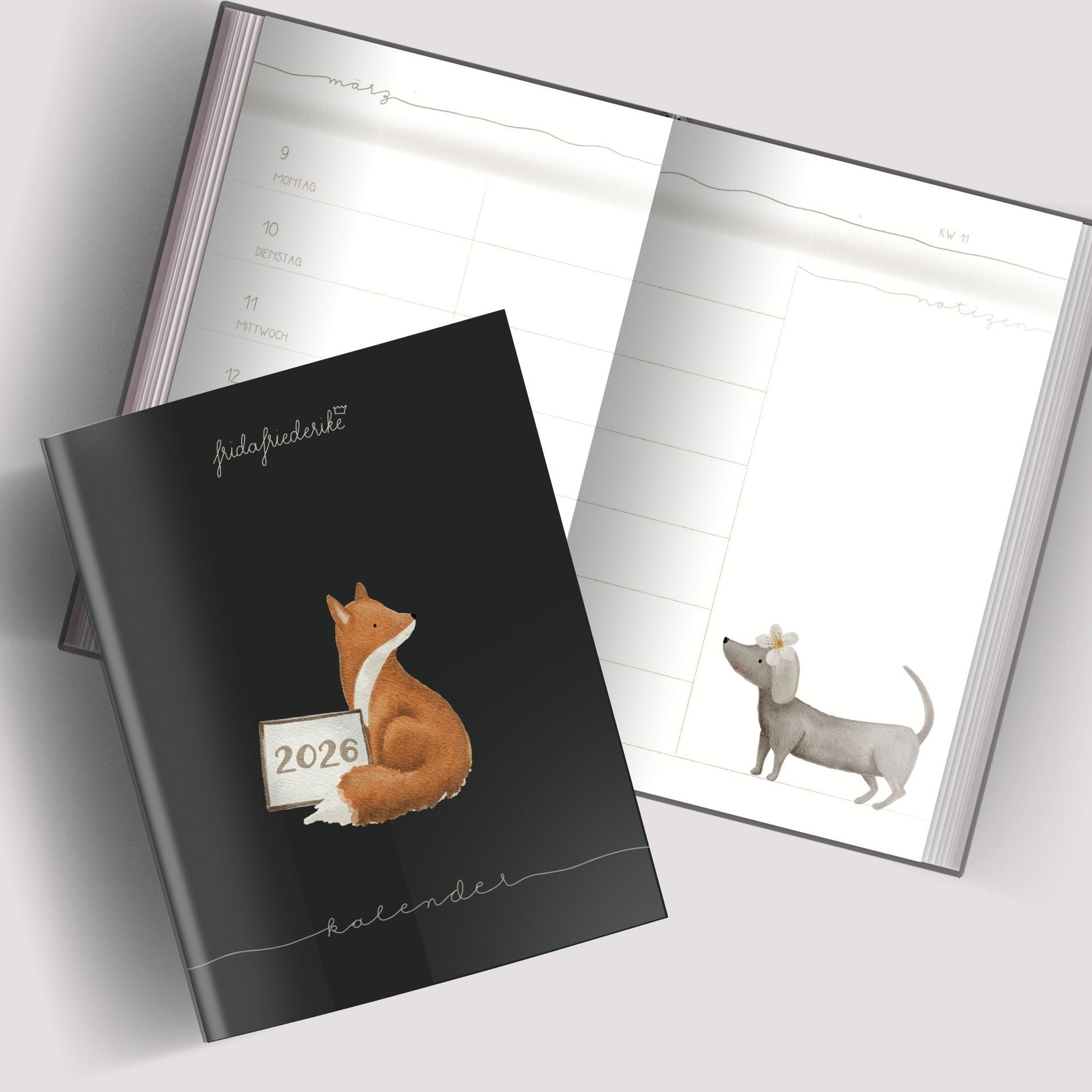Unser Taschenkalender 2026 ist mehr als nur ein Terminplaner – er ist dein täglicher Begleiter durch das Jahr, geschmückt mit zarten Aquarell-Illustrationen von Fuchs, Dachs, Hase, Dackel, Reh, Löwe, Eule & Co., die dir jeden Tag ein Lächeln ins Gesicht zaubern.